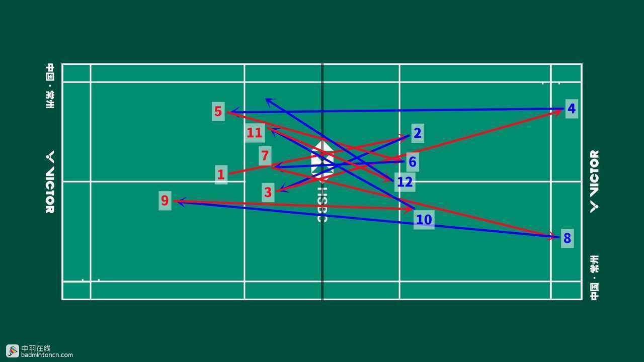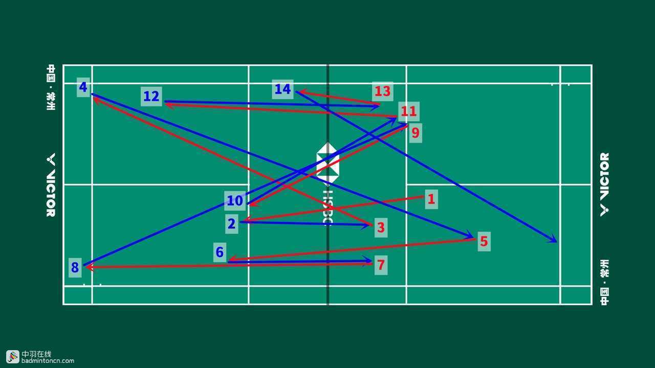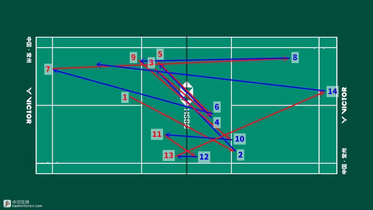 开始几拍双方都比较积极地看住网前,寻找下压机会,陆光祖中路分安赛龙的正手网前,安赛龙推挑直线,陆光祖头顶劈吊对角,安赛龙挡网后反击抓推,陆光祖也挡网化解,之后双方再度由远网转入近网争夺。