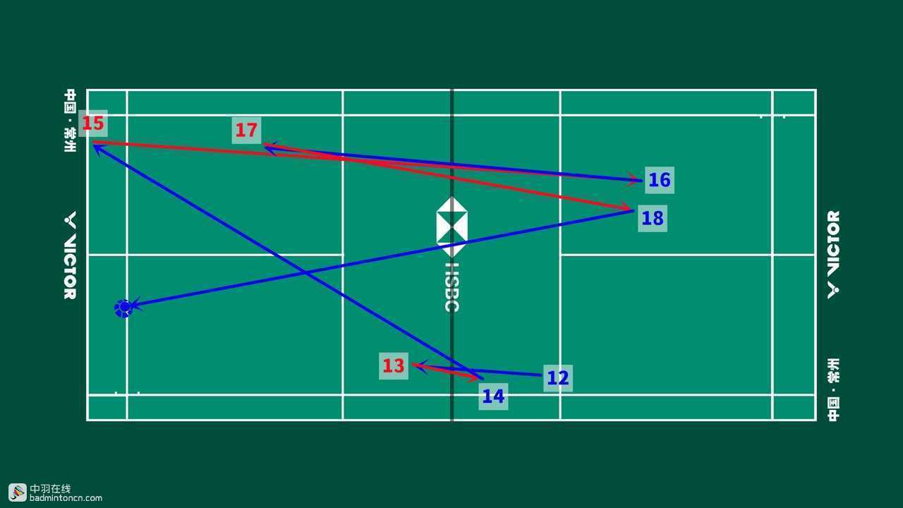 第二局11:16,陆光祖在领先优势下打得更加自信和富于变化,面对安赛龙放远网抓推的意图,突然的勾对角变化导致其被动,然后网前扑杀得分,非常涨士气。