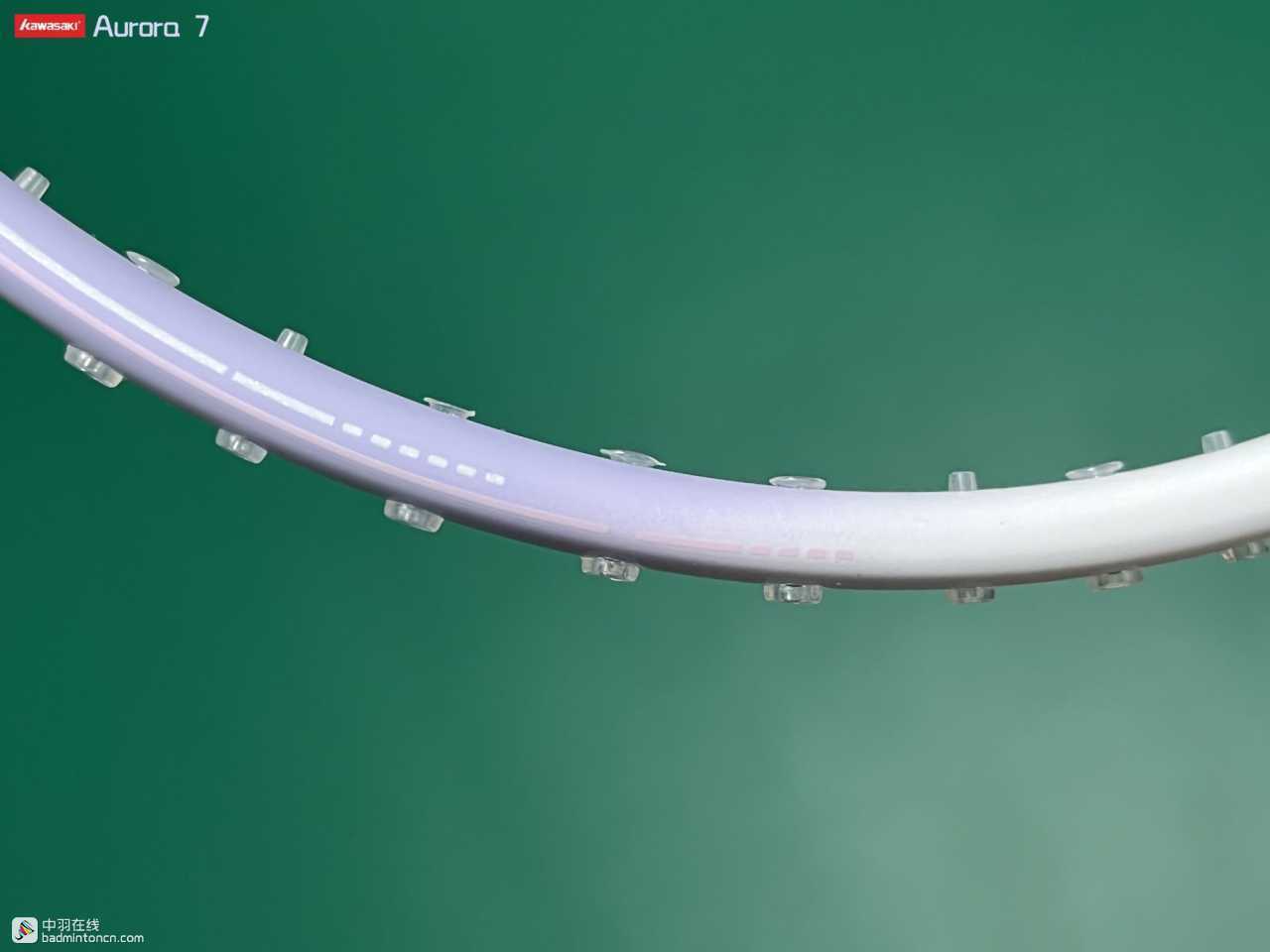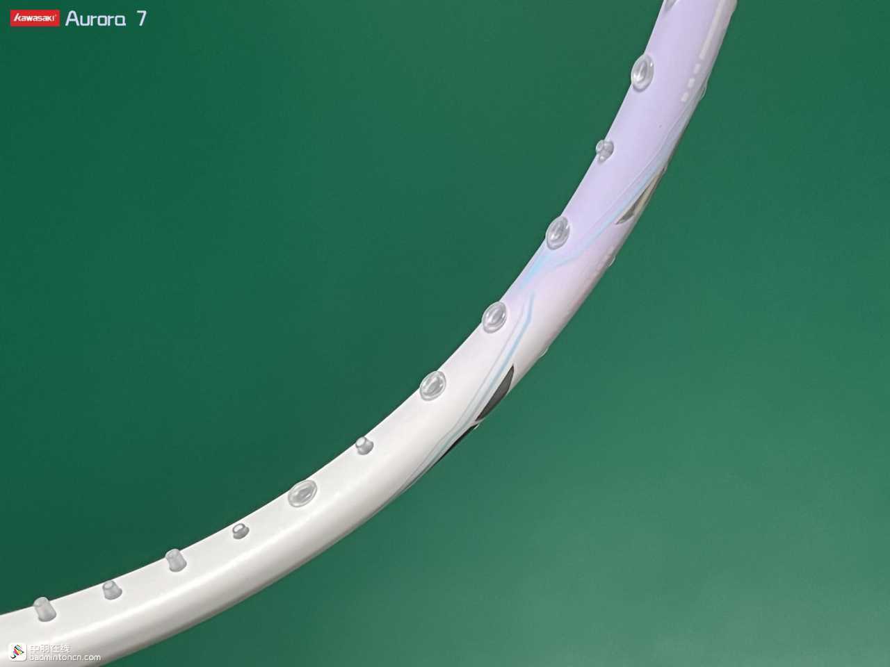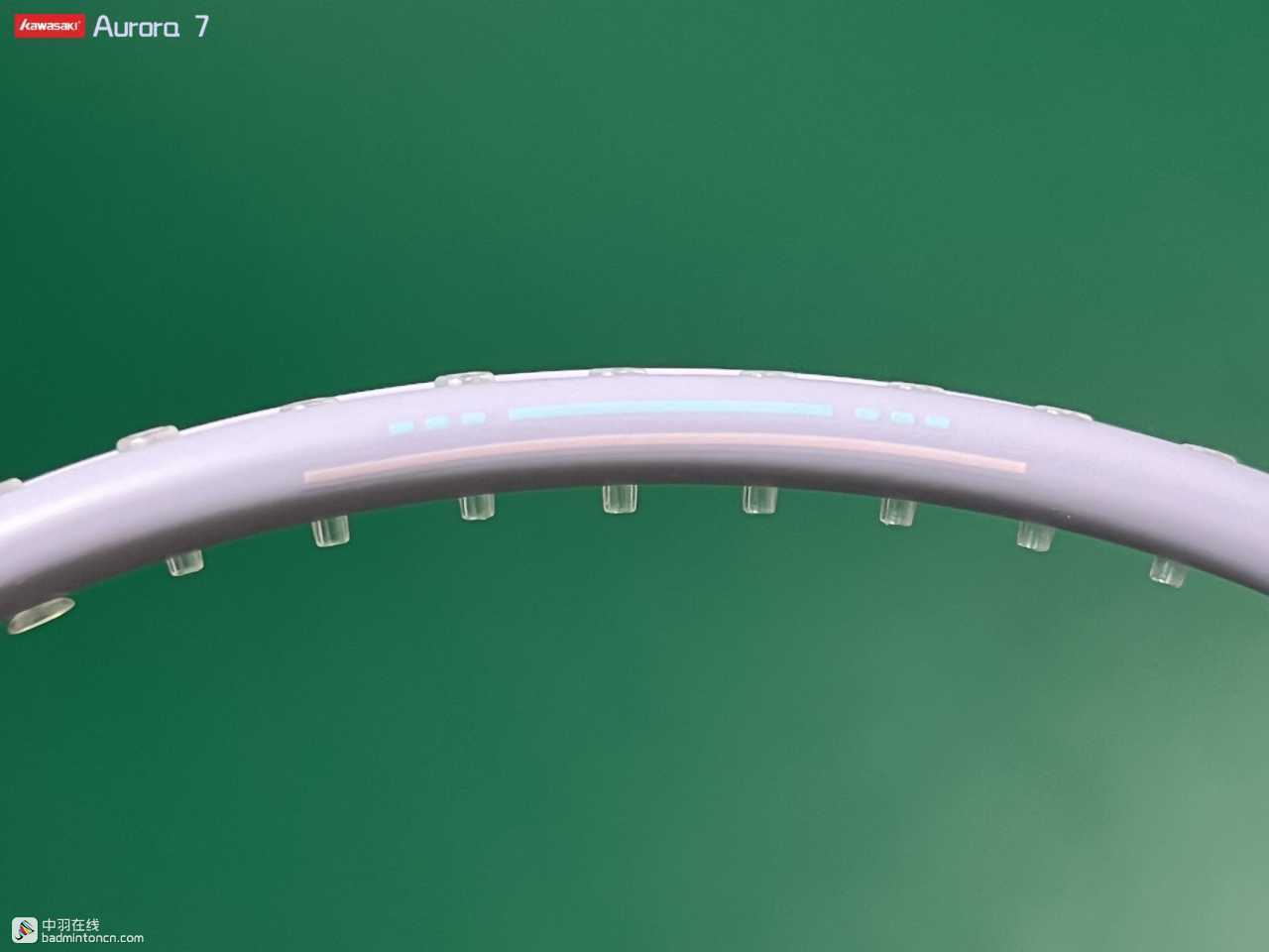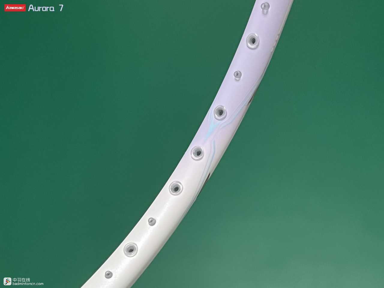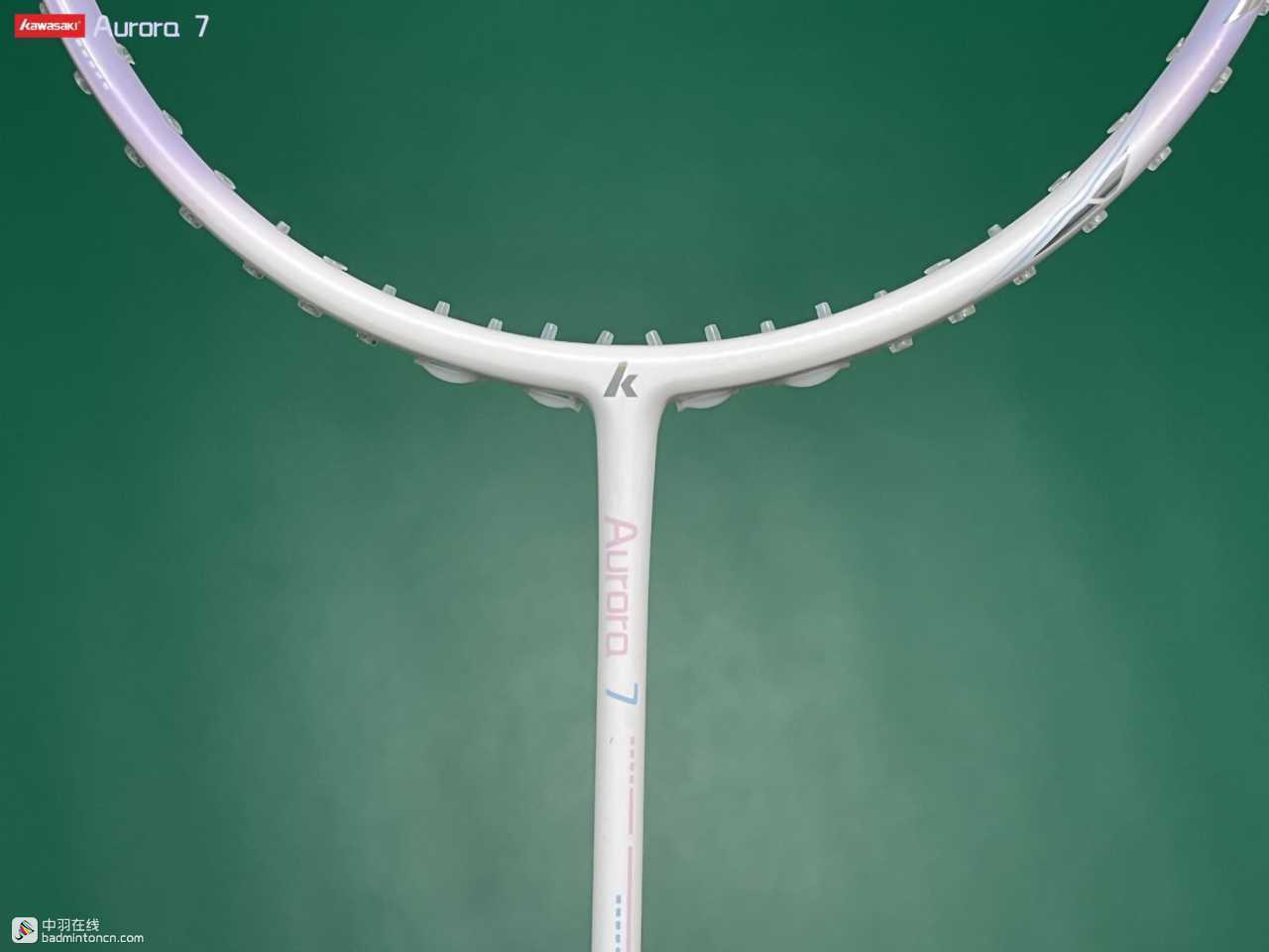 一支适合初学者的入门球拍应该是什么样的,对此,当前各大品牌都进行了探索并给出了各自的答案,近年也推出了多种多样的面向入门和初级球友的球拍。在这样的潮流中,川崎极光7(Aurora 7)也应运而生。 极光7是以5U超轻进攻拍为定位推出的,主要面向入门以及力量较小的球友,川崎官方首次以手绘的形式将球拍外观和各项参数呈现出来,非常新颖。以绚丽的自然现象“极光”命名,这款外观清新粉嫩的球拍,仅一个照面可能就会俘获不少球友的心。 那么极光7在性能与打感方面究竟有何特点,是否和这颇具吸引力的外观相称呢?本文就来一一和大家讨论。 外观初赏 川崎共为极光7设计了粉蓝、粉白、极光青和极光紫四款配色,笔者手中的这支是极光紫。以白色和淡紫色为主色调,这支极光紫配色的极光7以其淡雅清新的外观风格,在初次见面时就给人留下深刻的印象。 极光7的拍框由下部的白色逐渐向上部的淡紫色过渡,渐变的位置大约在5点和7点位置。 拍框两侧的图案采用的是非左右对称的设计,不过大体呈现着上下对称的布局,图案以银白色和粉色的线段以及极光镭射水标为主,风格低调,光照下镭射水标表面闪动着的彩色光泽是拍框上最为亮眼的点缀。 在拍框一侧,镭射水标位于中央9点位置附近,其上搭配有白色的线条予以装饰,上下两侧银白色和粉色的线段对称分布。 而另一侧的镭射水标则分布在1点和5点位置附近,其中间分别有淡蓝色的条纹修饰,而银白色和粉色的线段则位于拍框中部。 拍框顶部12点位置也有淡蓝色和粉色的线段作为点缀。拍框整体涂装非常简约,如同霞光下透着微微紫色光芒的云朵,给人一种静谧舒适的观感。 此外,极光7除了三通处两侧的4个二连钉是半透明的白色以外,其他所有的线孔处均配备了透明护线管。 极光7的中杆通体以白色为主,同样点缀以淡蓝色和粉色的线条以及极光镭射水标。 中杆正反两面图案对称,在靠近三通处均标有“Aurora 7”的型号名称,“Aurora”采用粉色,而数字“7”为淡蓝色,并非特别醒目,但很好地延续了球拍整体淡色系的设计风格。 在中杆尾部接近锥盖的位置,还有中文“极光7”字样的标识,同样是蓝粉结合,字体设计犹如在空气中浮动延展的光芒,颇具艺术感。 随极光7附赠的极光镭射拍套也是足够亮眼,就如同球拍之名“极光”一样,镭射的表面光彩熠熠,在光线的映照下,随着视角的变化,光彩变幻,给人一种绚丽而梦幻的感觉。 参数浅析 极光7仅有5U/G6一种规格。此外根据锥盖上的标注,“BALANCE”即平衡点参数标在了头偏重的一档,符合官方所给的超轻进攻拍的定位。 经过实际测量,笔者手中的这支极光7在空拍带底胶的状态下重约74.86g,平衡点约为305mm。 空拍去底胶后重约68.31g,平衡点达到了约327mm。 上线(李宁L67线,26磅),上手胶(缓震膜+李宁GP1000手胶)后,总重量约80.13g,平衡点约312mm。 极光7球拍总长实测约674mm,其中,拍框长度约254mm,中杆(锥盖顶部至T头两侧最下方线孔处)长度约215mm,手柄(底盖至锥盖顶部)则约为205mm,属于典型的大拍框设计,中杆和手柄均为标准长度。 极光7的拍框采用76孔穿线模式,拍框和甜区面积很大,充分提升击球的容错率。在框型方面,极光7采用流线型拍框,除T头附近位置以外,全拍均为偏圆润的流体盒式框,兼顾稳定性与挥速,并引入30T碳纱加强,运用真空气压成型。 经过实测,极光7的拍框底部(靠近T头处)宽度约为10.37mm,厚度约为7.64mm。 拍框两侧(3点、9点钟方向)宽度则约为10.26mm,厚度约为6.62mm。 拍框顶部宽度约为10.00mm,厚度约为6.28mm。 极光7的拍框外侧采用半线槽设计,线槽位于3点、9点位置以上。 极光7的中杆同样采用30T碳素纤维,实测外径约为7.27mm(测量点位于中杆中点处)。 根据锥盖上的标注,极光7的中杆硬度偏软,而在官方的介绍中则给出了更具体数值,软硬度为8.8,处于较软的水平,易于驱动。 总的来说,极光7主打超轻的重量,结合拍头重、中杆柔韧的特点,打造出迎合初学者的较低上手门槛。中杆上“HEAD HEAVY BALANCE FLEXIBLE SHAFT(头重柔韧中杆)”和“SUPER LIGHT WEIGHT(超轻重量)”的标识就展现了这一设计思路与定位。 极光7的建议穿线磅数为18至30磅。 打感体验 怎样的球拍适合初学者呢?首先,它一定是易于上手的。初学羽毛球时,我们一般会从动作的框架入手,再不断在发力方面寻求进阶。初学者对于爆发力的概念尚没有非常清晰和深入的认识,更重要的是在不同的位置都能够将球回到位。以后场球为例,初学者最初接触的技术都是高远球,入门阶段的球友发力水平有限,要想把高远球打到位,除了掌握正确的击球动作以外,球拍的借力也是一个不可忽视的因素。拍头有一定分量,有利于上手挥拍时借助惯性产生更大的力量,此外偏软的中杆让球拍更容易发生形变,形成鞭甩的效果,把力量送出去,有了这两点,就有助于让初学者比较容易地打出到位的高远球。而极光7正是满足这两个特点,同时自身重量比较轻,适合作为初学者不错的入门伙伴。 此外,极光7较大的拍面和甜区设计,也很好地保证了击球的容错率,流体盒式框型既保证了击球的稳定性,挥速也不慢,从各方面来说,极光7都拥有适合初学球友使用的特质,有着很低的上手门槛。