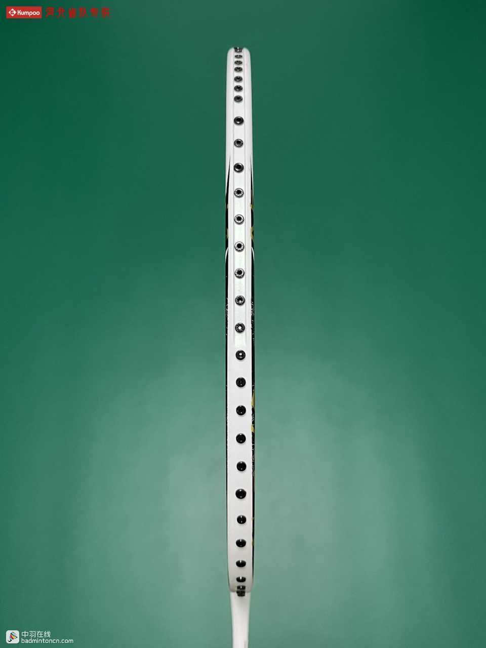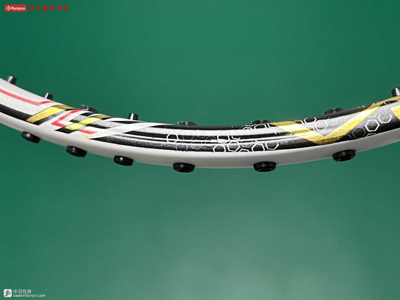 对比数据可以看出,河北省队专供的拍框是由三通处到顶部逐渐变窄、变薄,这一方面保证下部的抗扭和稳定性,同时也提升上部挥速。外侧自3点和9点位置向上的长线槽也进一步减小拍框上半部分的风阻,同时也能够起到增强抗扭的作用。