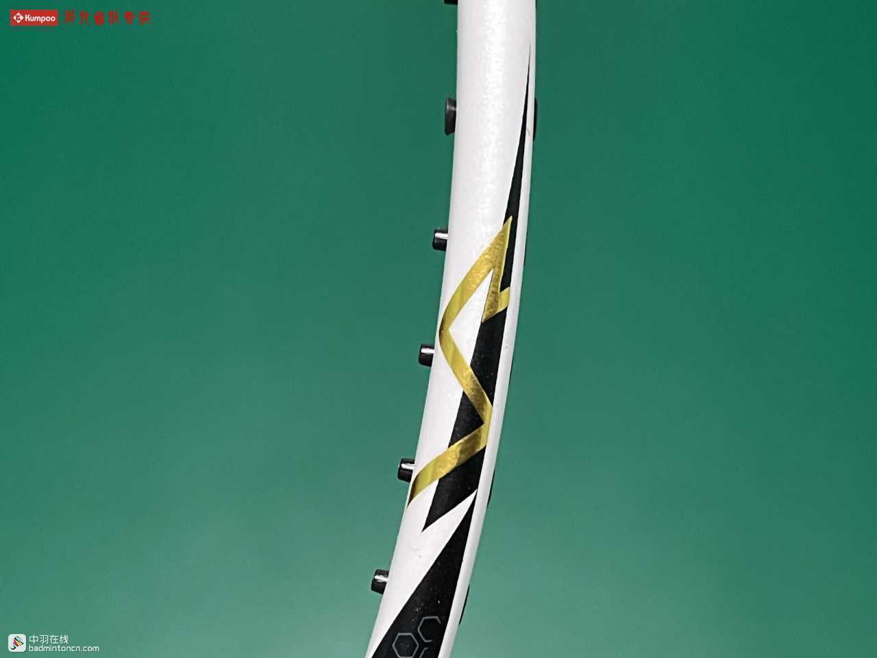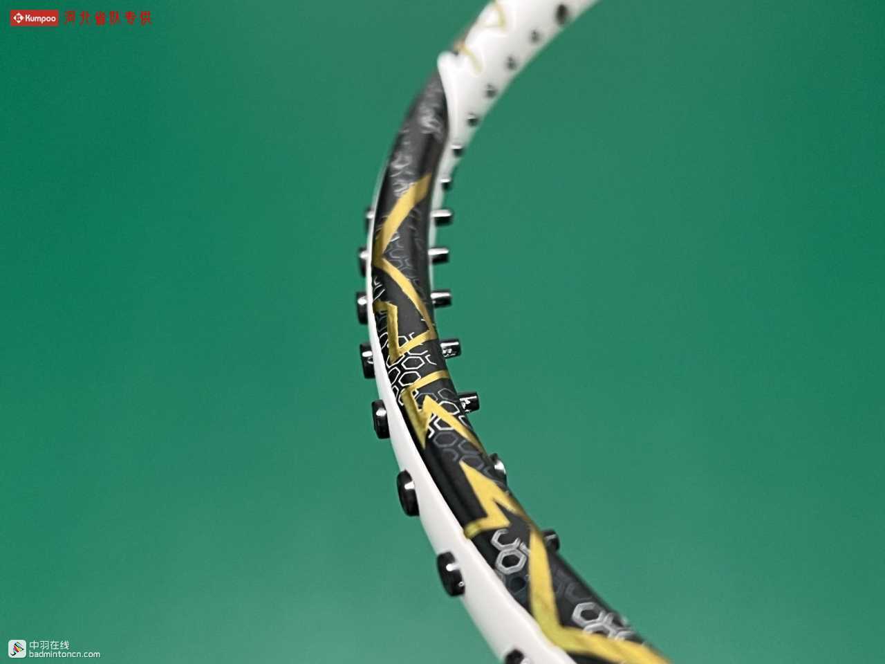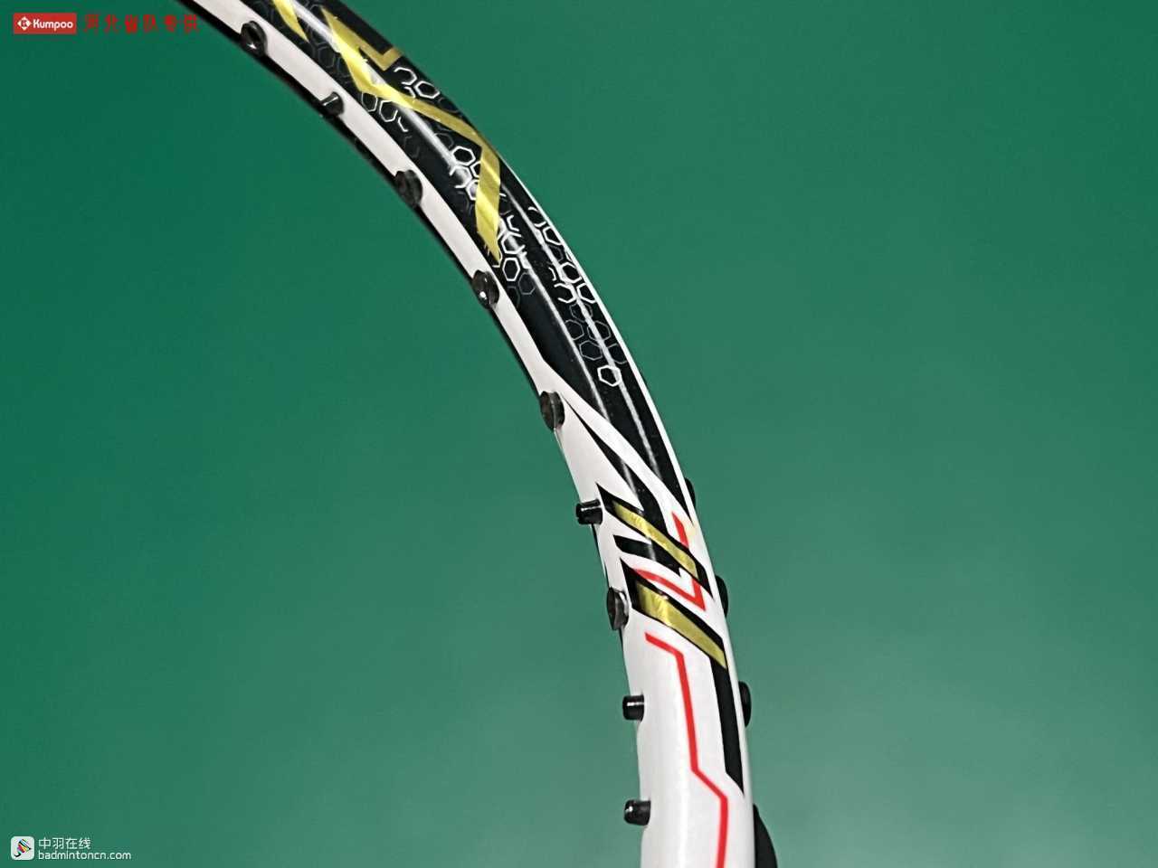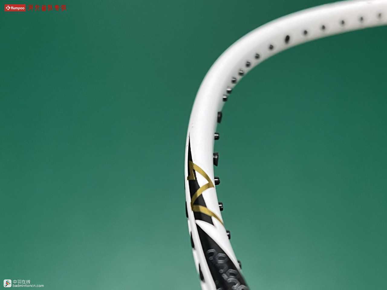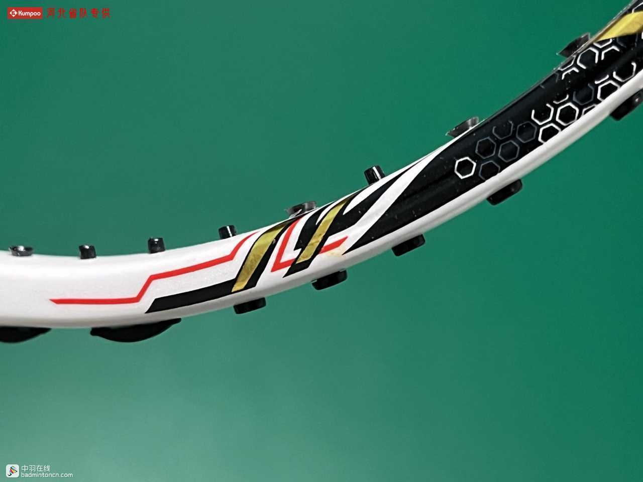拍框的下半部分正反两面加入黑金元素,强烈的对比带来一种凌厉感,形成了整支球拍的标志性涂装。