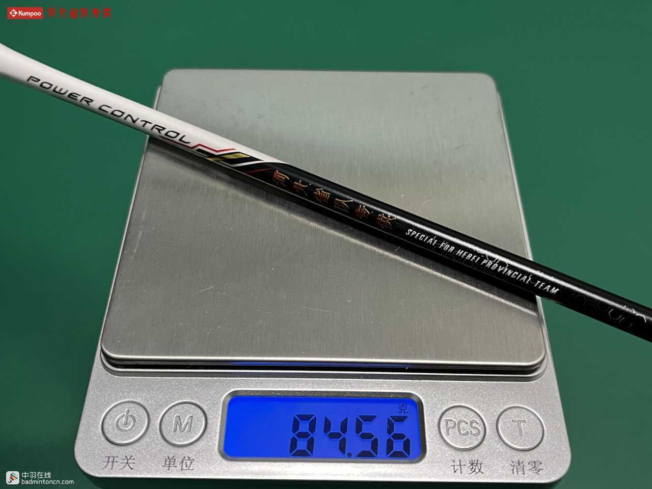 根据实际测量,笔者手中的这支河北省队专供在去掉热缩膜之后,空拍带底胶状态下重约84.56g,平衡点约为301mm,两项参数相较于球拍上所给的参考值都要偏高一点。