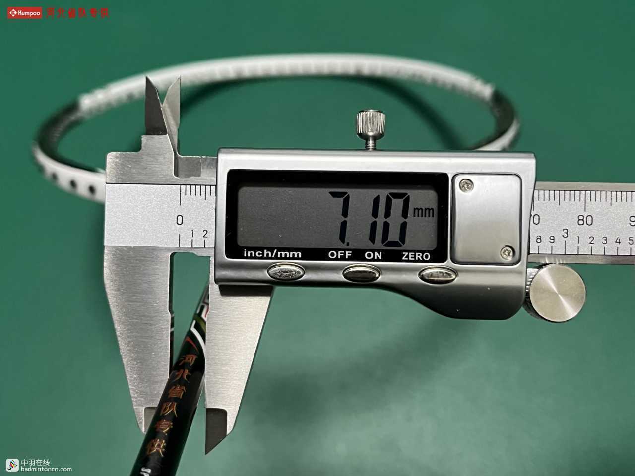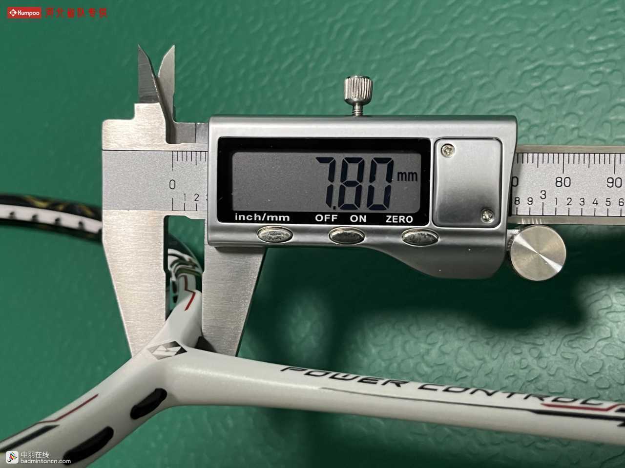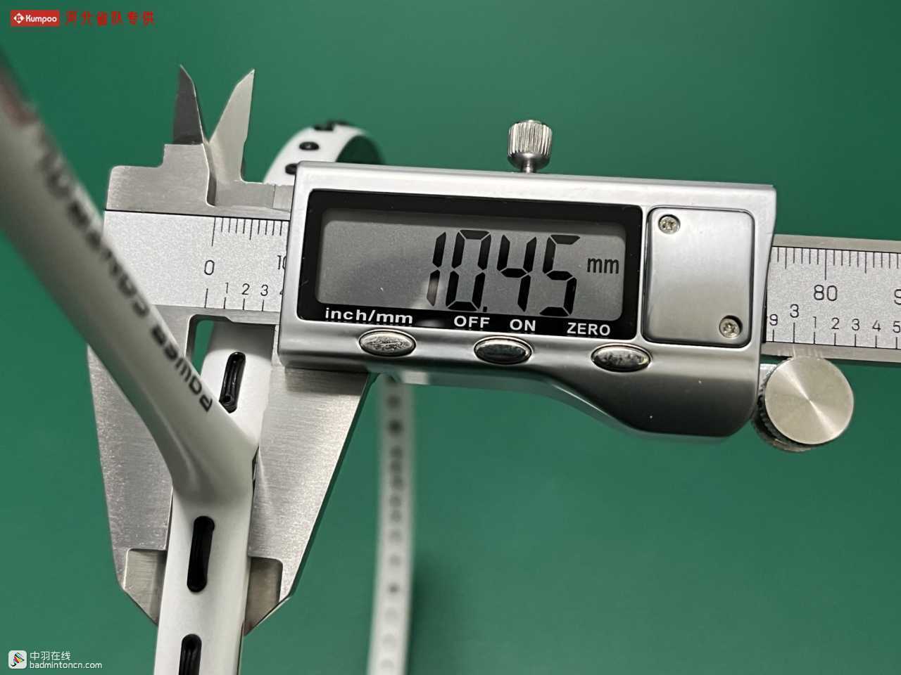 经过实测,河北省队专供拍框底部(靠近T头处)宽度实测约为10.45mm,厚度约为7.80mm。