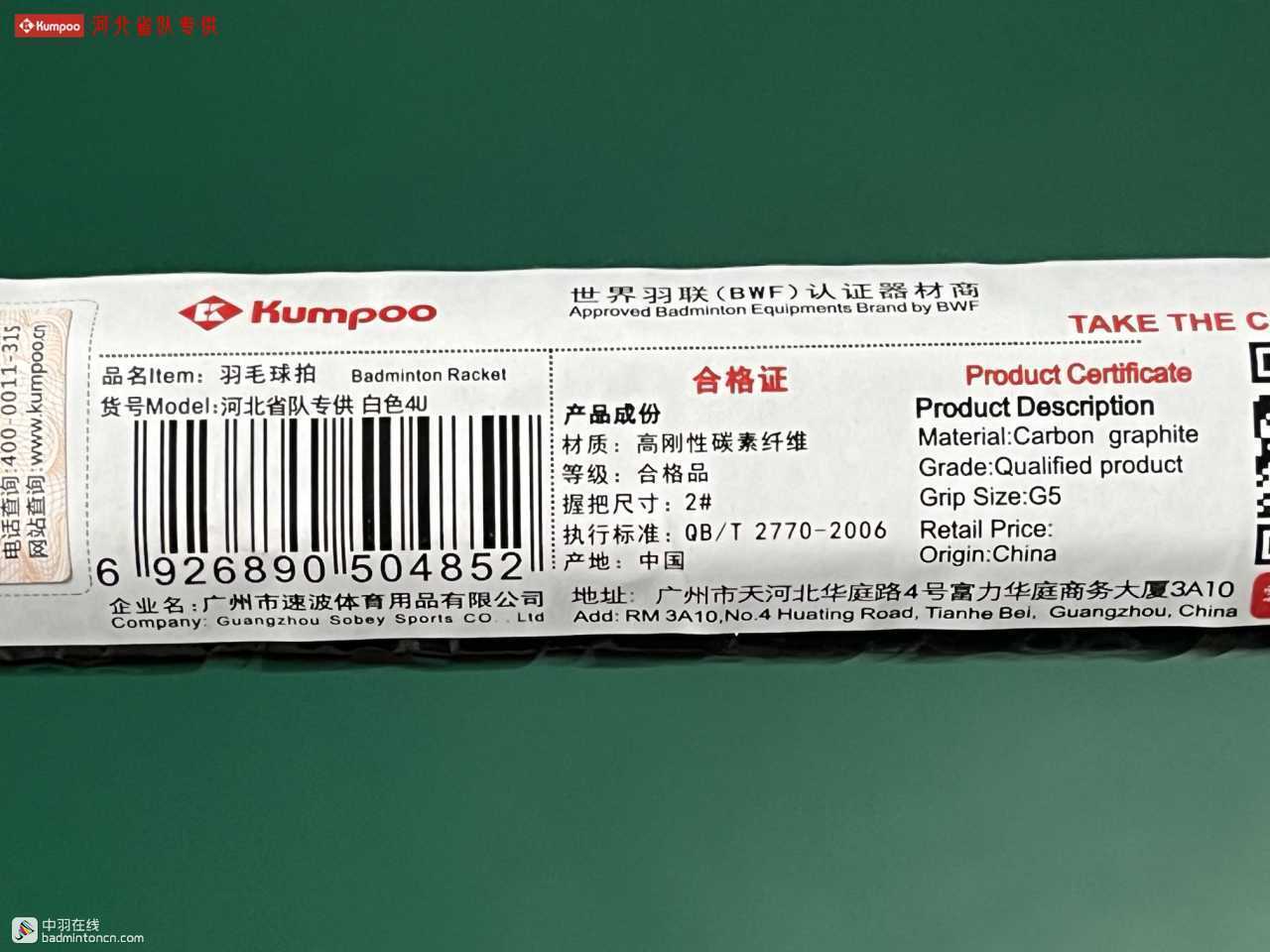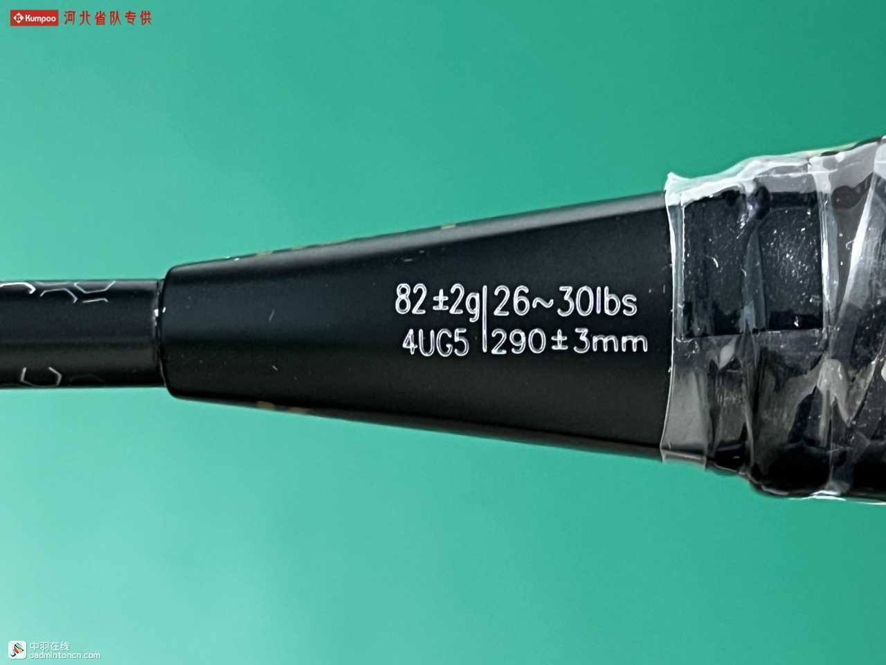 笔者入手的这支河北省队专供为4U/G5的规格,锥盖上所标注的重量在82±2g的范围内,平衡点参考值为290±3mm,建议穿线磅数为26~30磅。