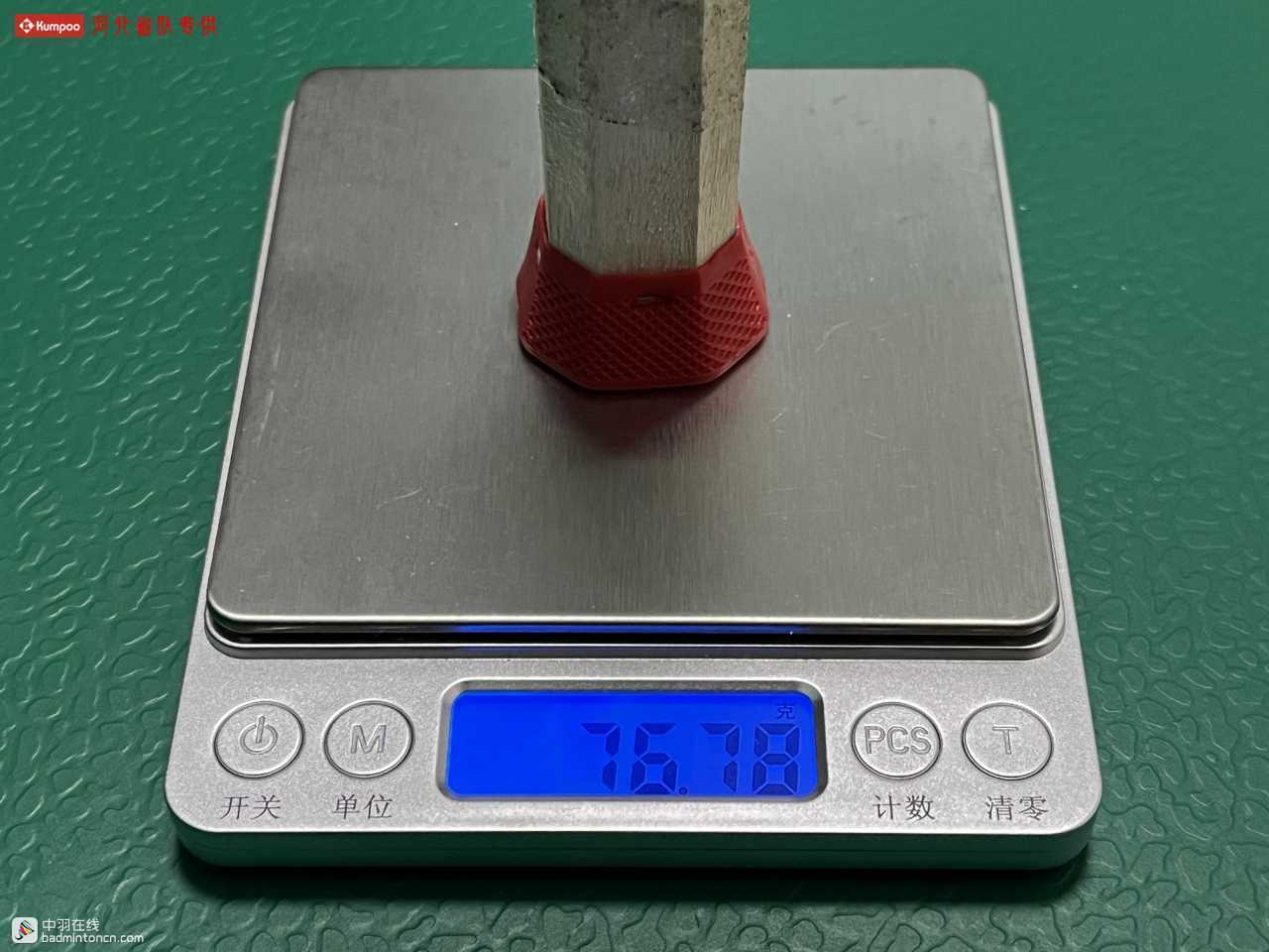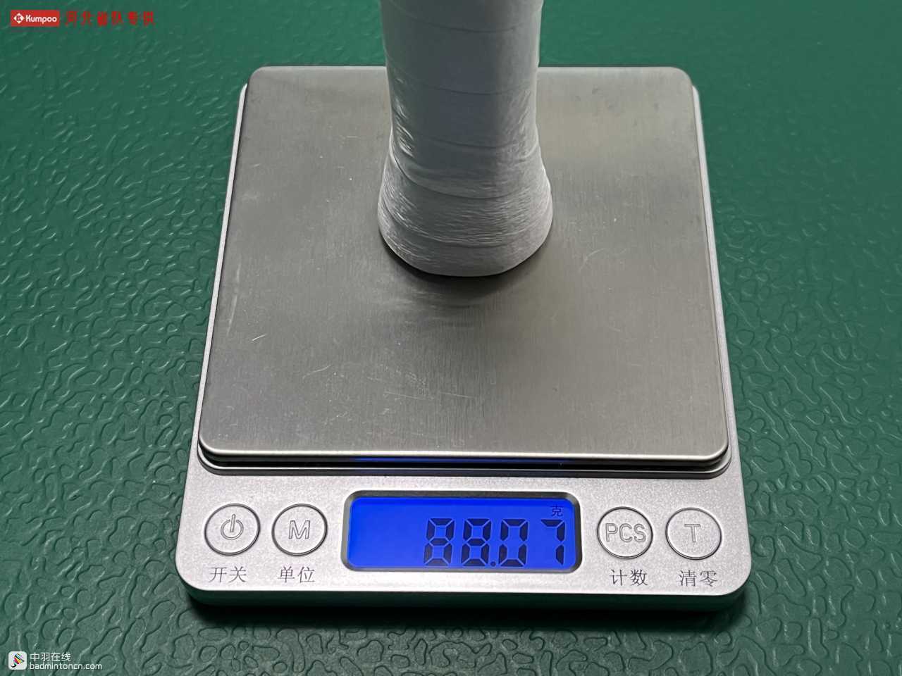 在上线(尤尼克斯BG66UM线,29磅)和手胶(缓震膜+李宁GP1000手胶)后,总重约为88.07g,平衡点约310mm。