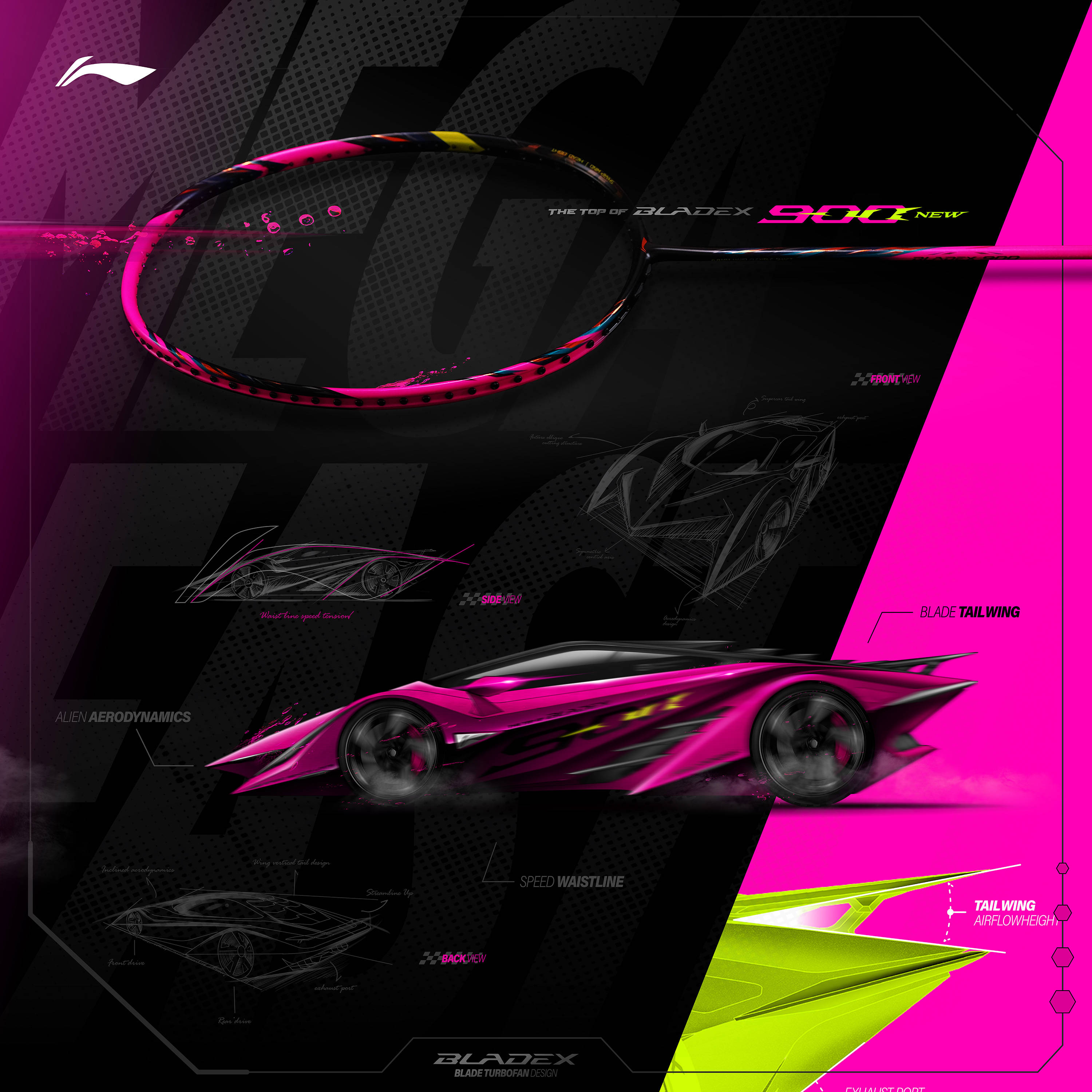 锋影900New的设计理念如天马行空融合超跑的动感和羽毛球拍的功能性。速度线和几何切割巧夺天工精妙勾勒超跑腰线,不仅在视觉上呈现出速度与力量的结合,而且在技术层面上也达到追求降低风阻和提高挥拍速度的效果。锋影线切风格的运用,模仿超跑切割空气的姿态,增强了球拍与空气的互动,让击球时的每一个动作都仿佛注入了超跑的基因。