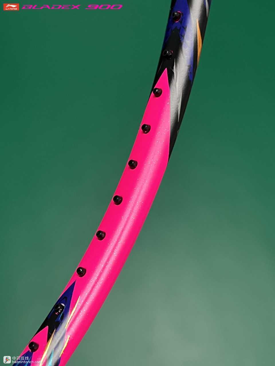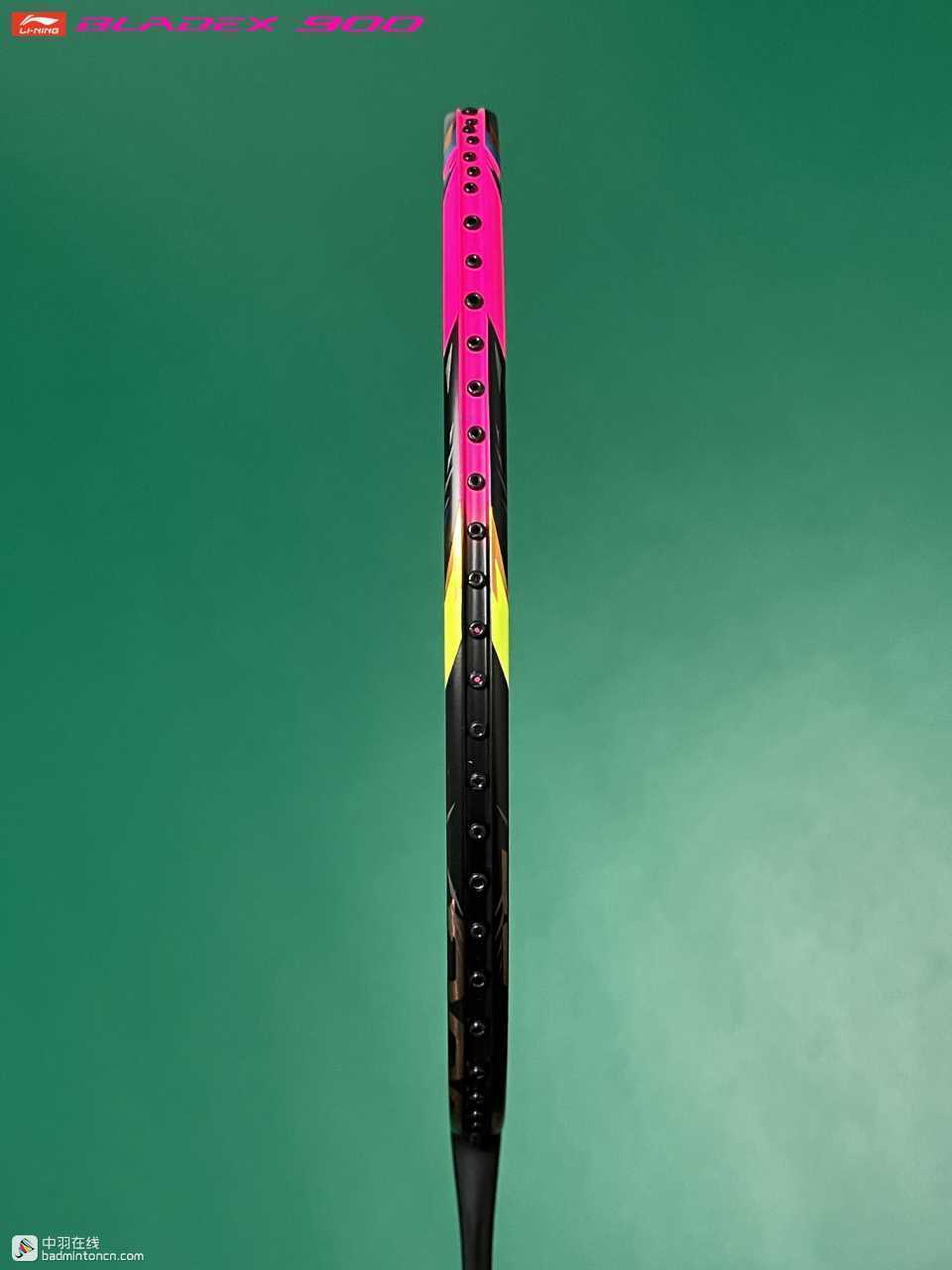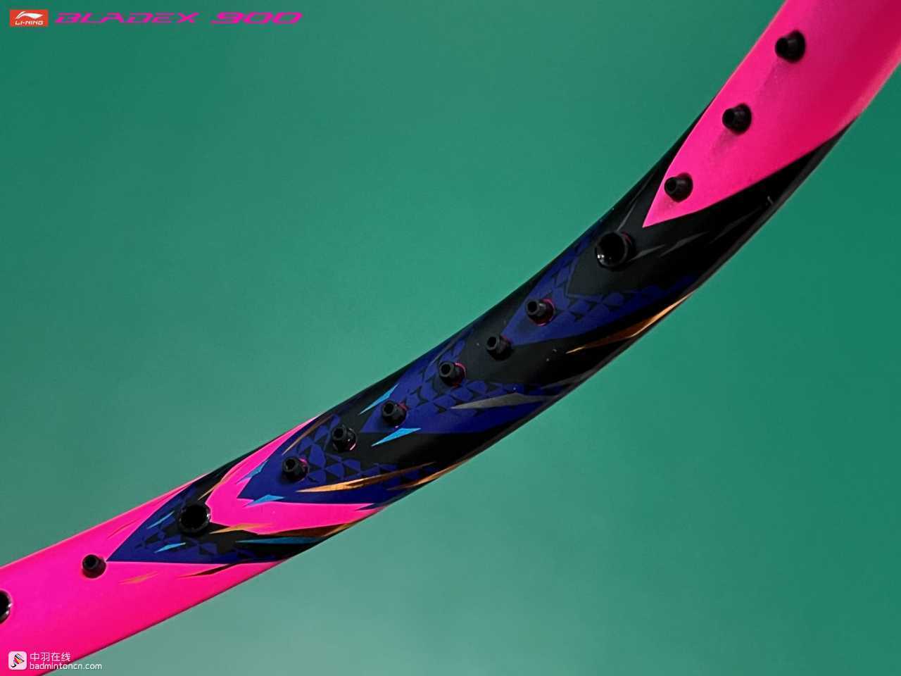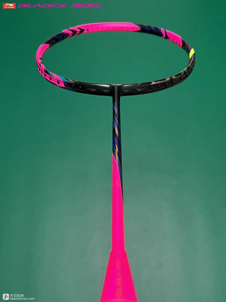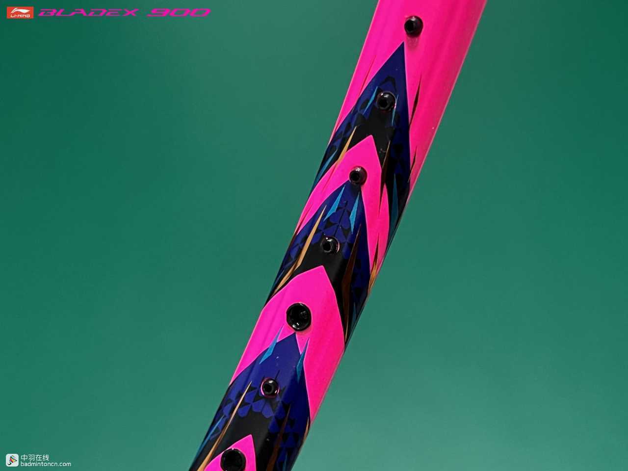 锋影900 NEW是锋影系列中首款外观大面积采用荧光莓红这样高饱和度明亮色系的球拍,这使得球拍整体颇具辨识度,第一眼就能抓人眼球。