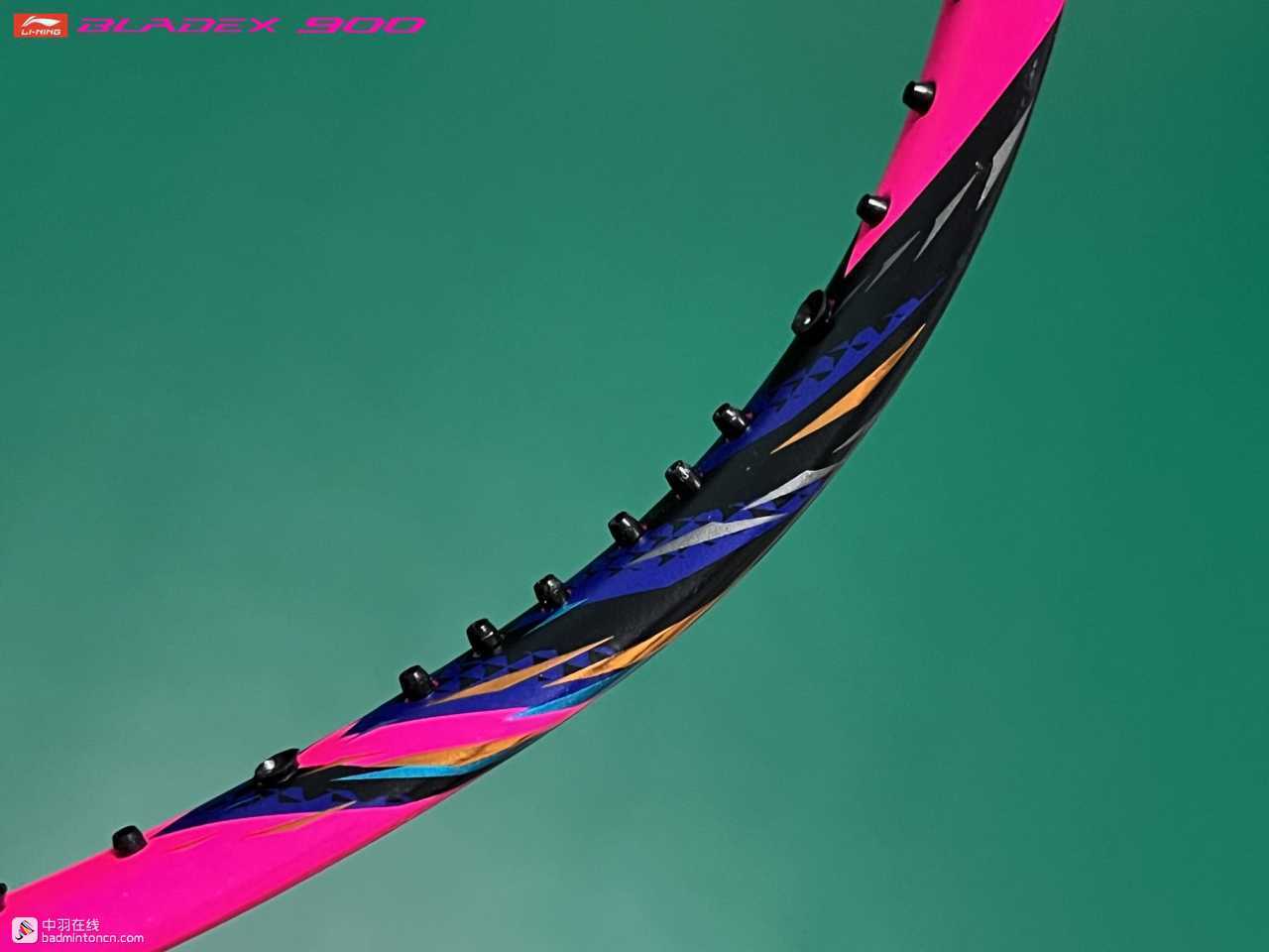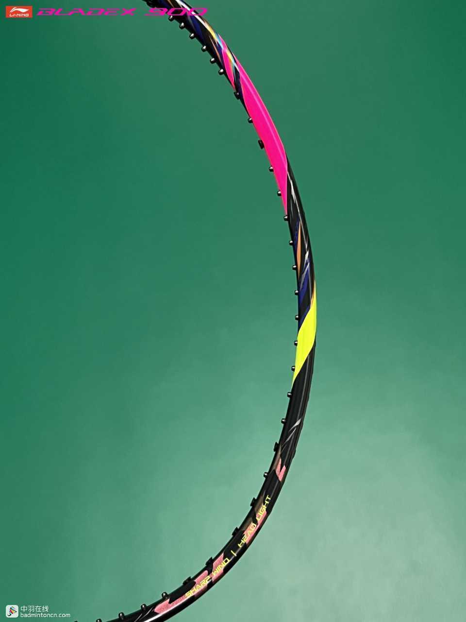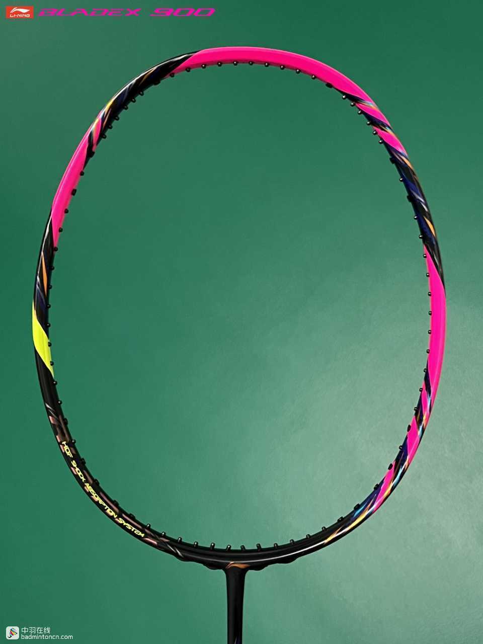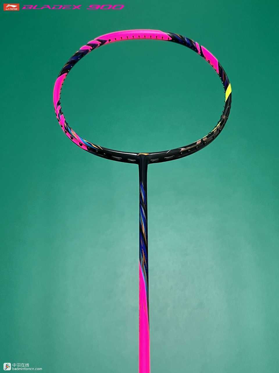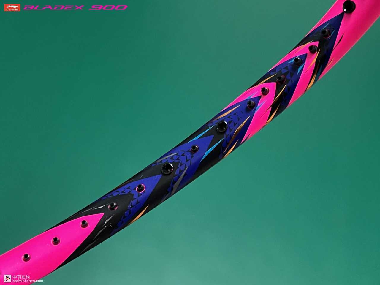 锋影900 NEW是锋影系列中首款外观大面积采用荧光莓红这样高饱和度明亮色系的球拍,这使得球拍整体颇具辨识度,第一眼就能抓人眼球。
