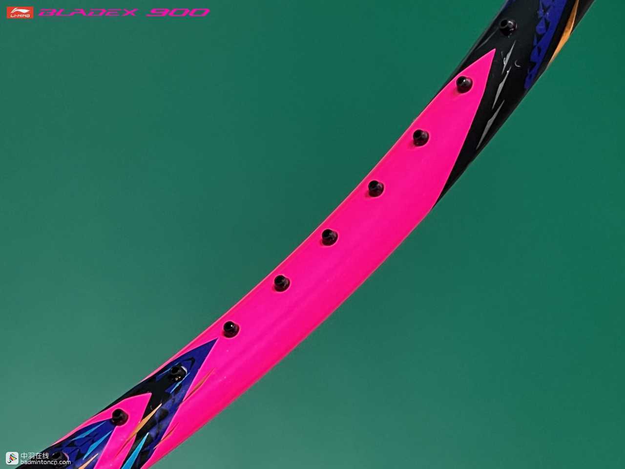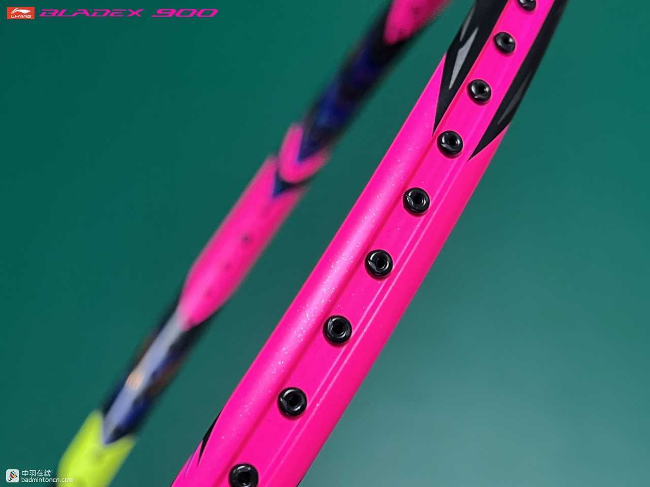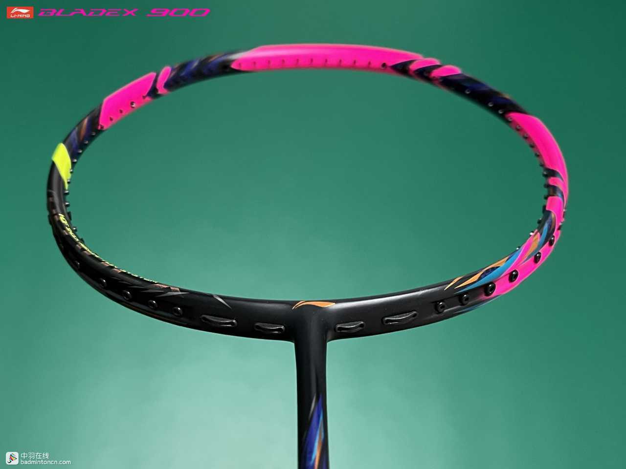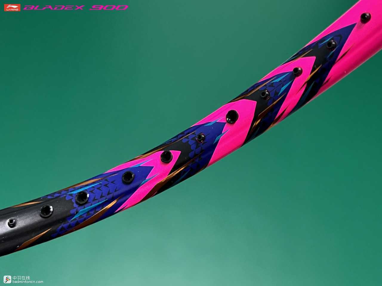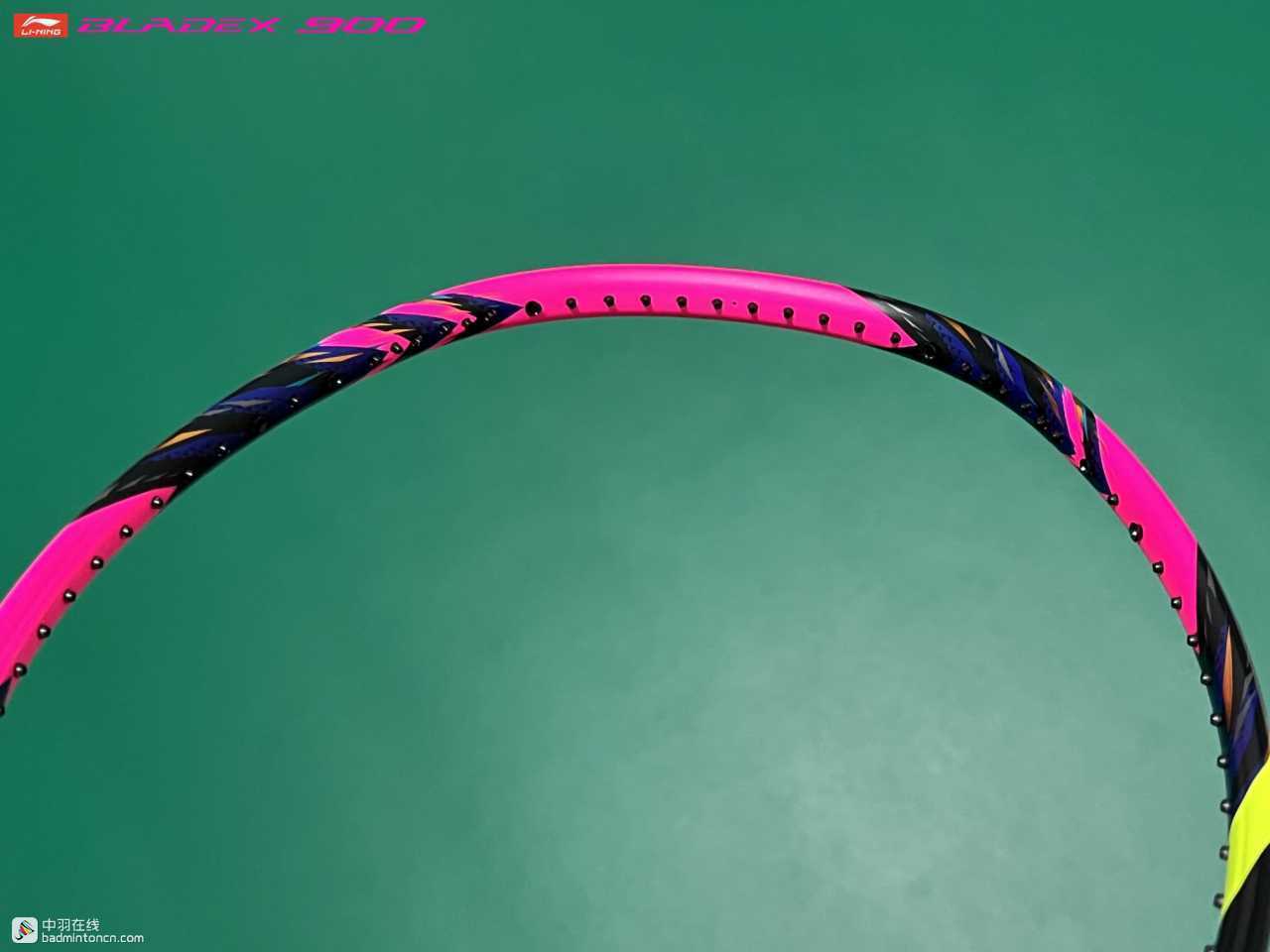 锋影900 NEW是锋影系列中首款外观大面积采用荧光莓红这样高饱和度明亮色系的球拍,这使得球拍整体颇具辨识度,第一眼就能抓人眼球。