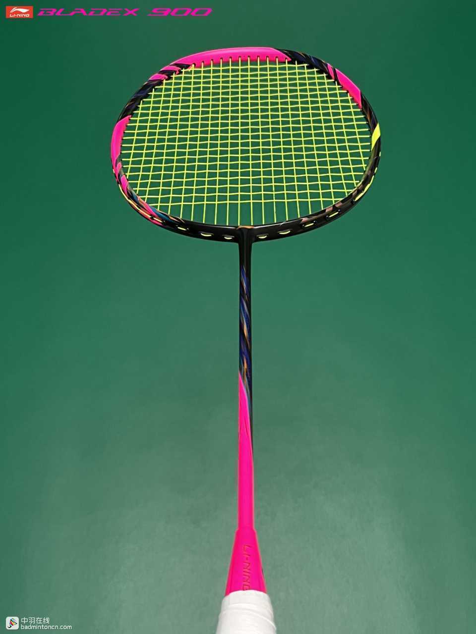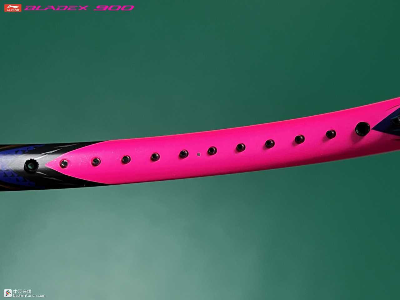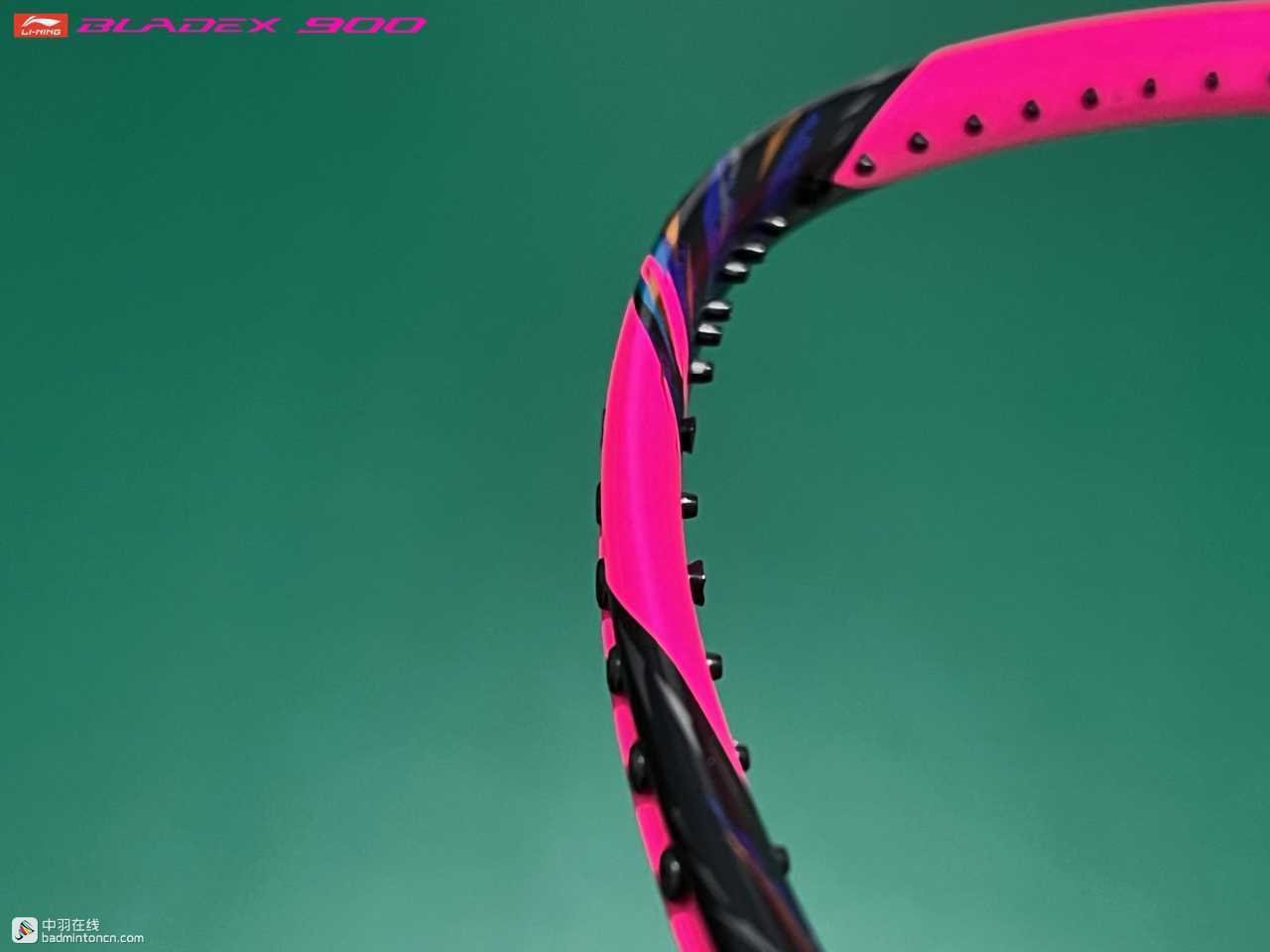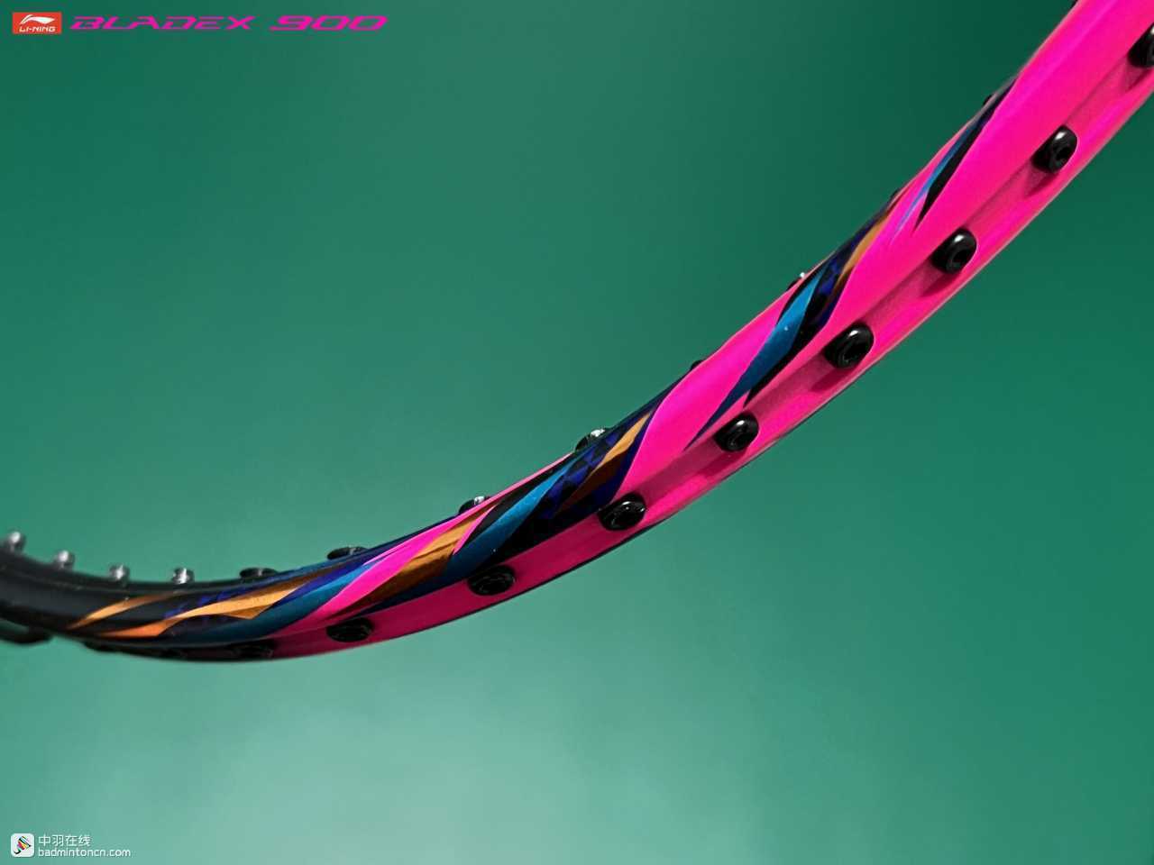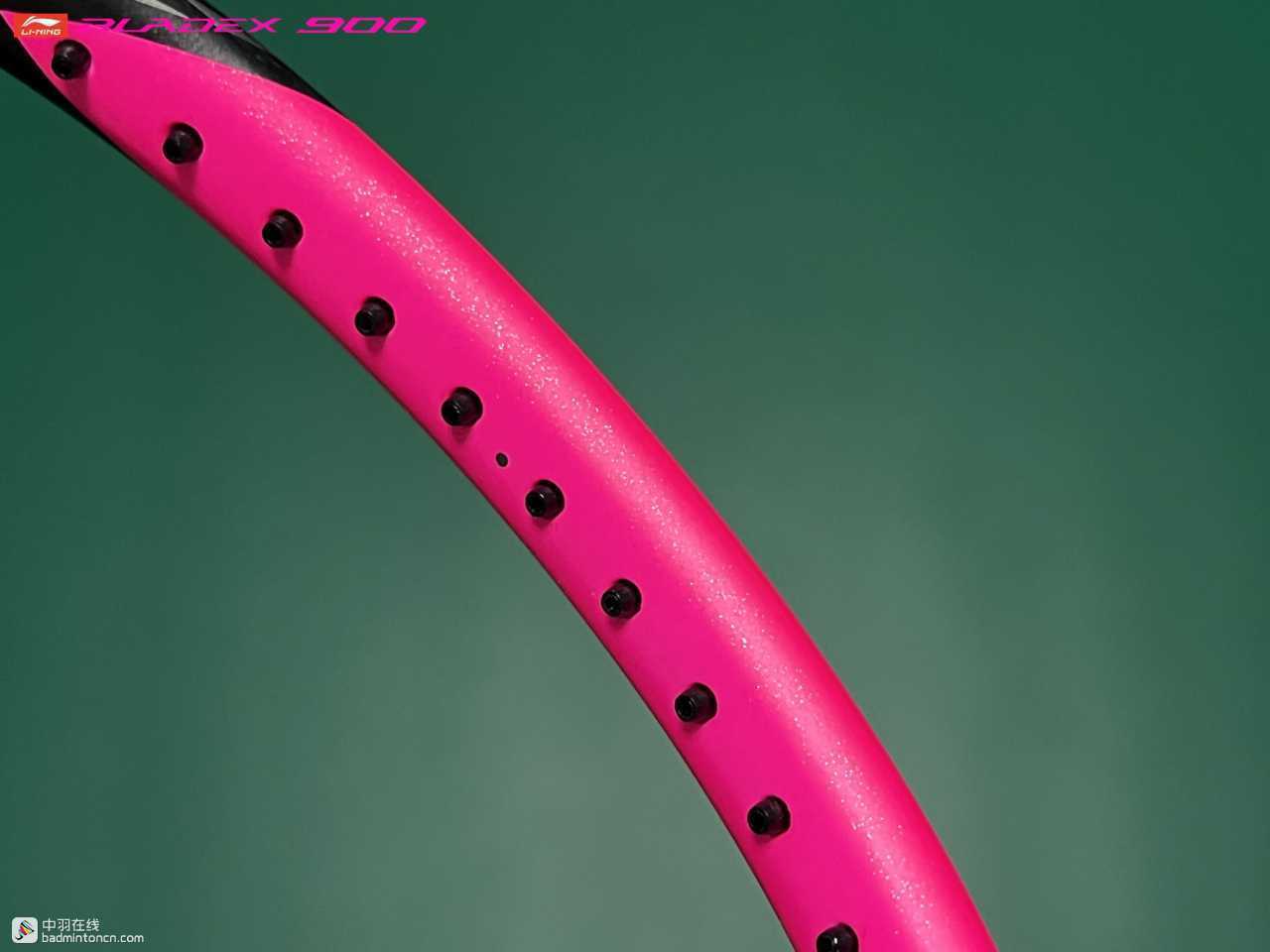 锋影900 NEW是锋影系列中首款外观大面积采用荧光莓红这样高饱和度明亮色系的球拍,这使得球拍整体颇具辨识度,第一眼就能抓人眼球。