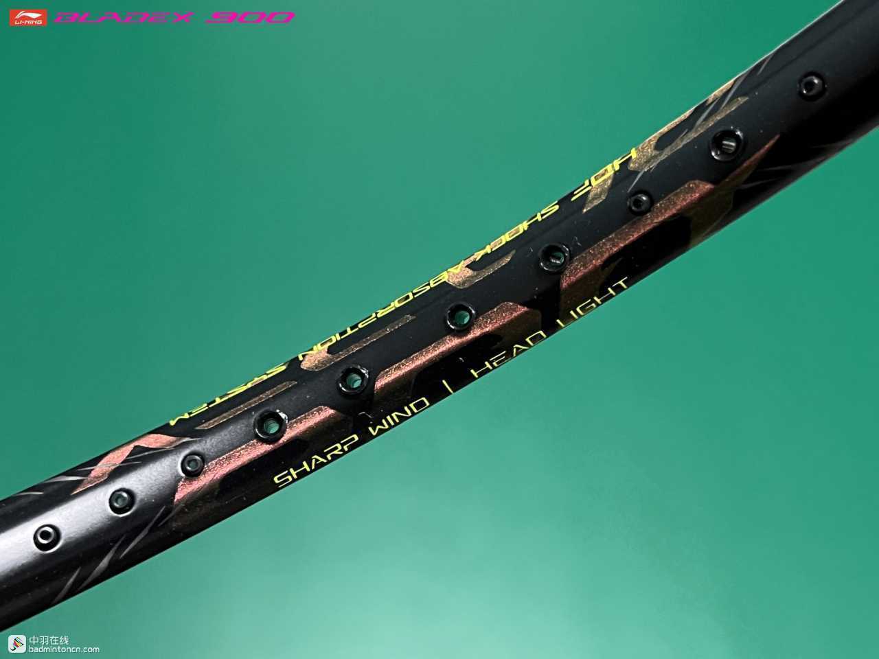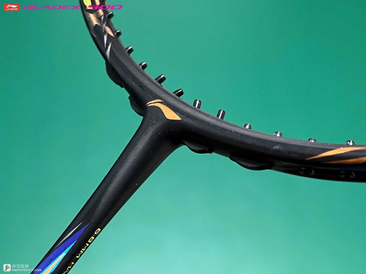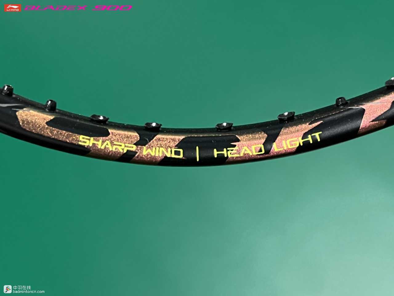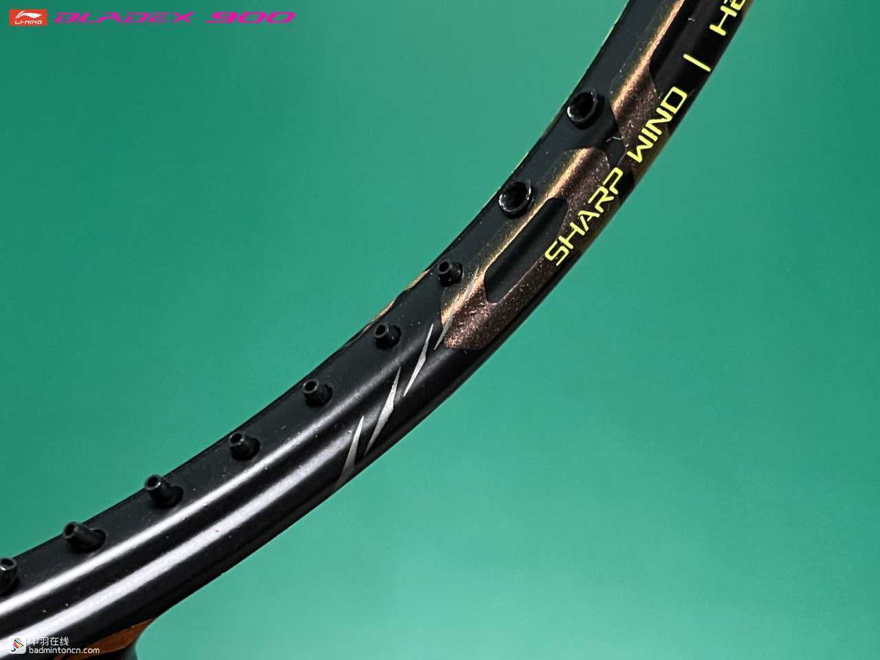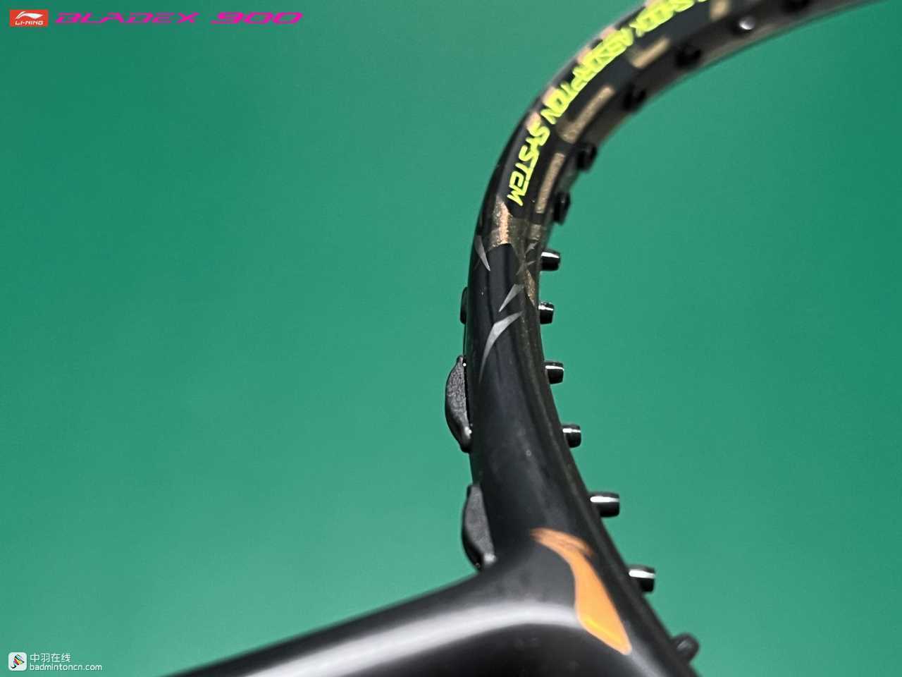 此外在拍框一侧大约4点至5点(7点至8点)的位置,古铜色的字样在两面分别标出了锋影系列名称“BLADEX”和“900”,彰显球拍的身份。