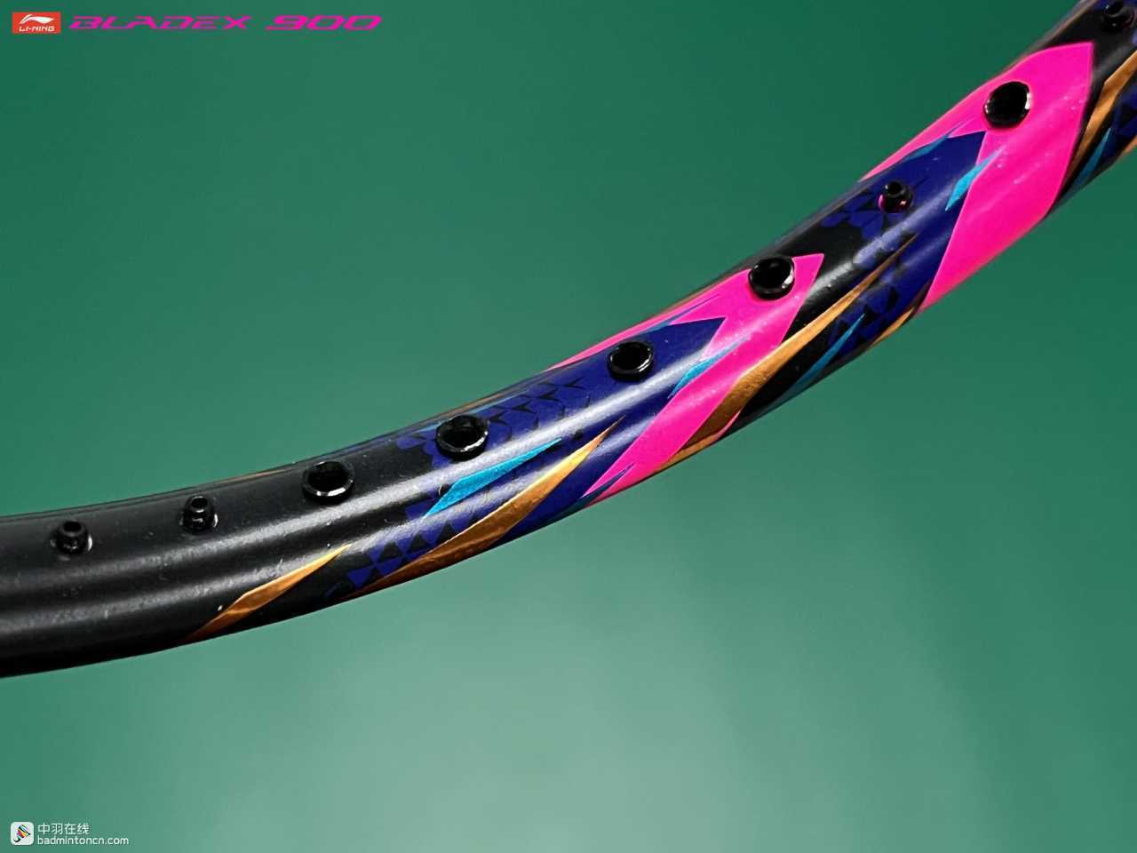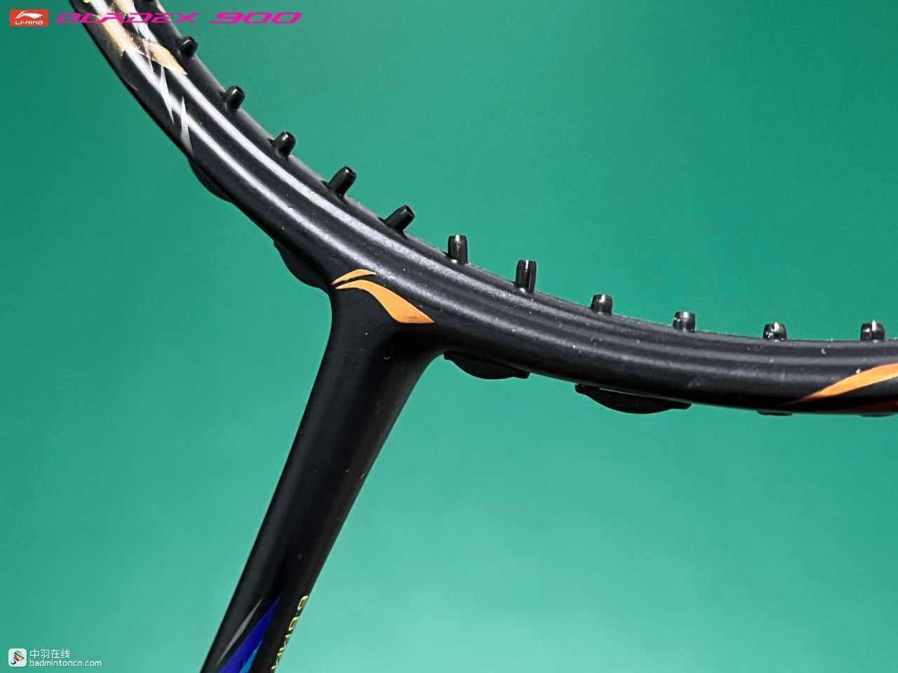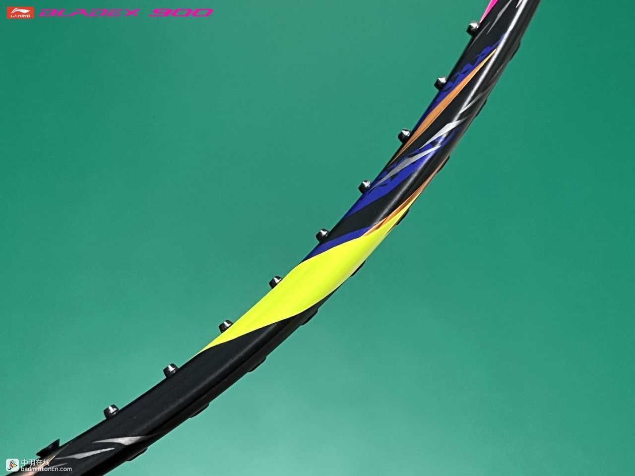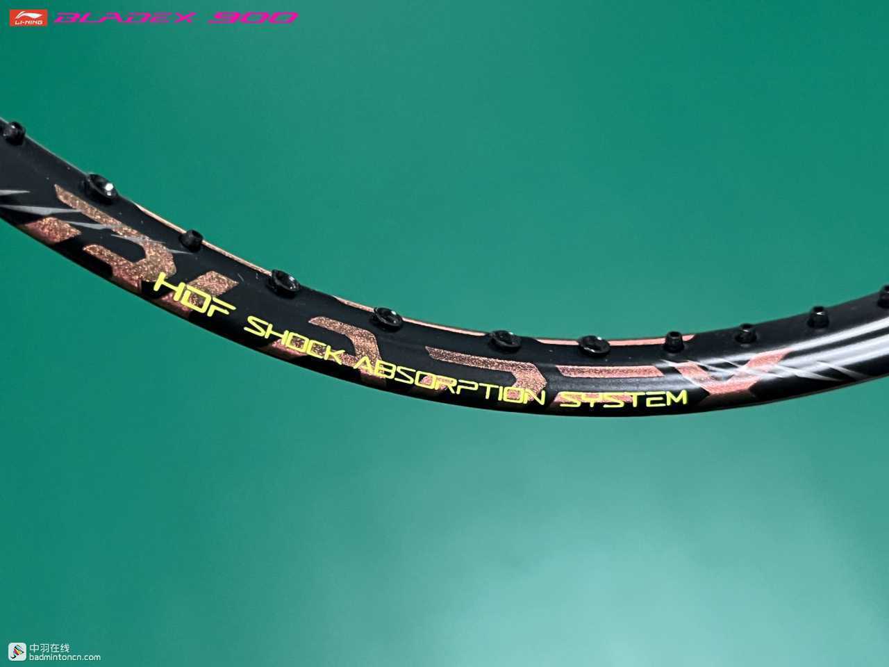 此外在拍框一侧大约4点至5点(7点至8点)的位置,古铜色的字样在两面分别标出了锋影系列名称“BLADEX”和“900”,彰显球拍的身份。