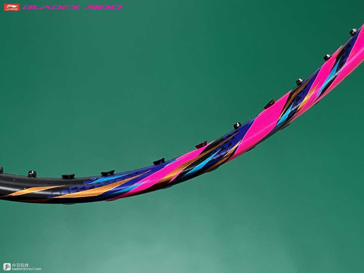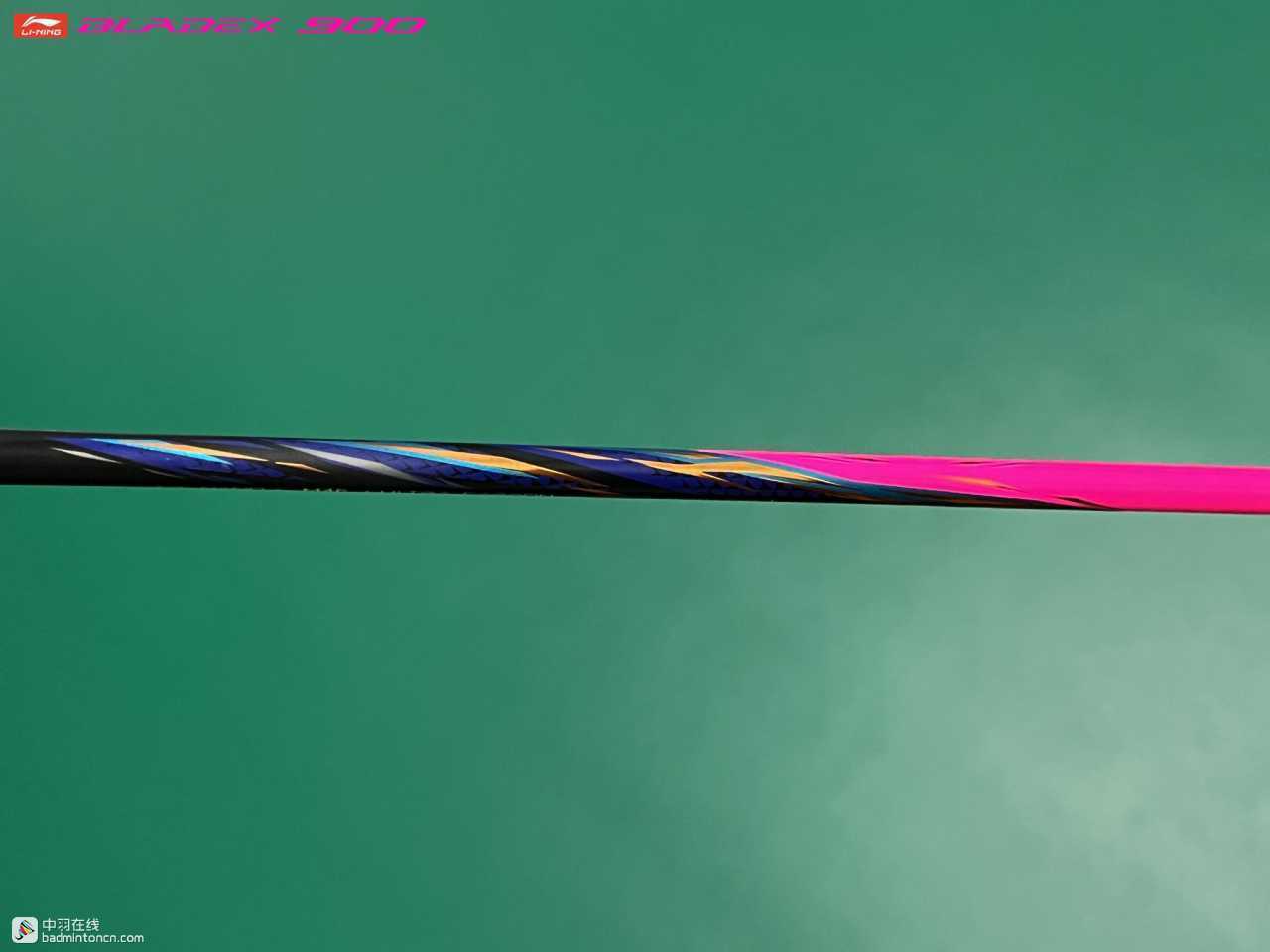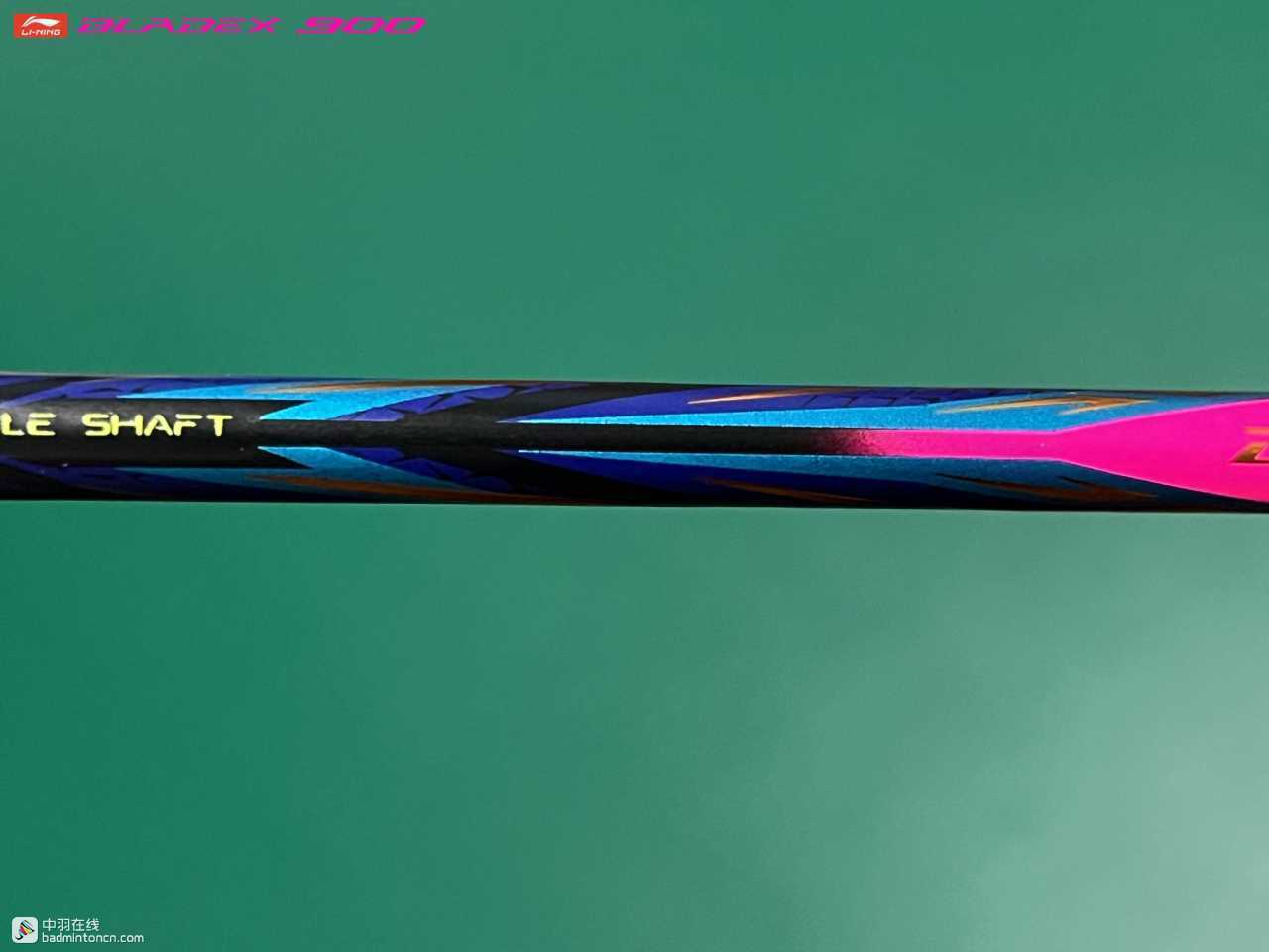 锋影900 NEW的中杆上半部分直至连接三通处为黑色,下半部分直至锥盖则为莓红色,中间部分和拍框一样采用以紫色、银灰色、水蓝色图案以及金色的亮面水标组成的图案作为过渡,就像利如刀刃的疾风,以迅雷不及掩耳之势一扫而过。
