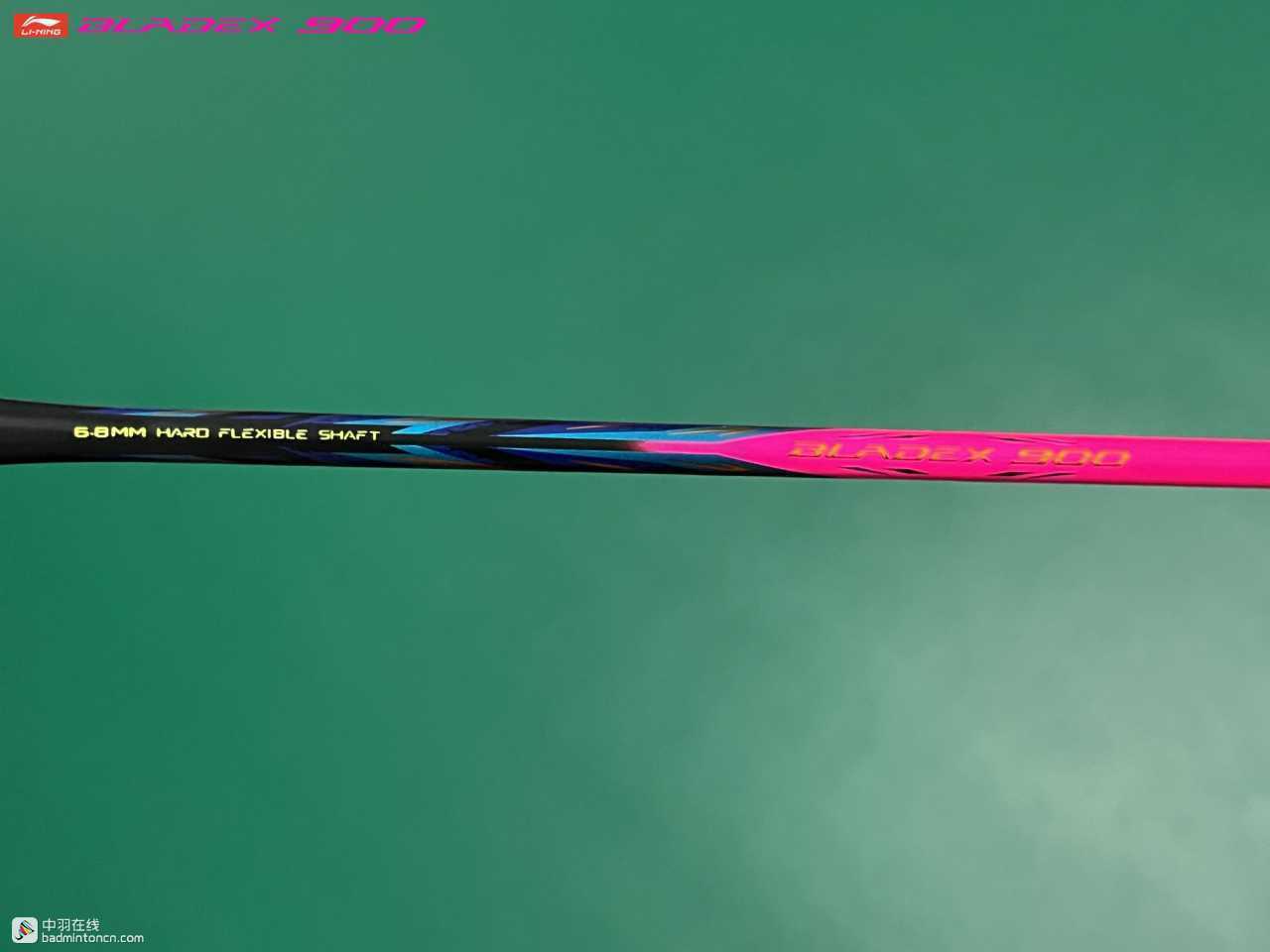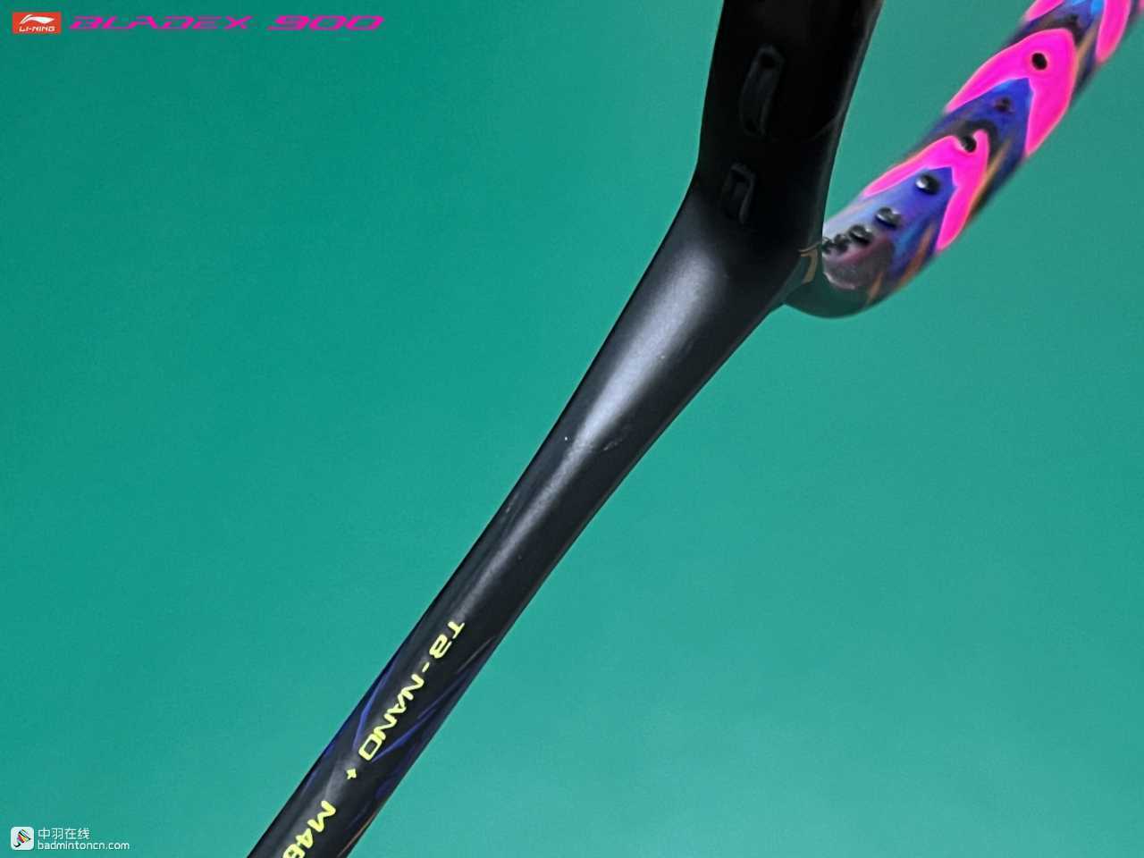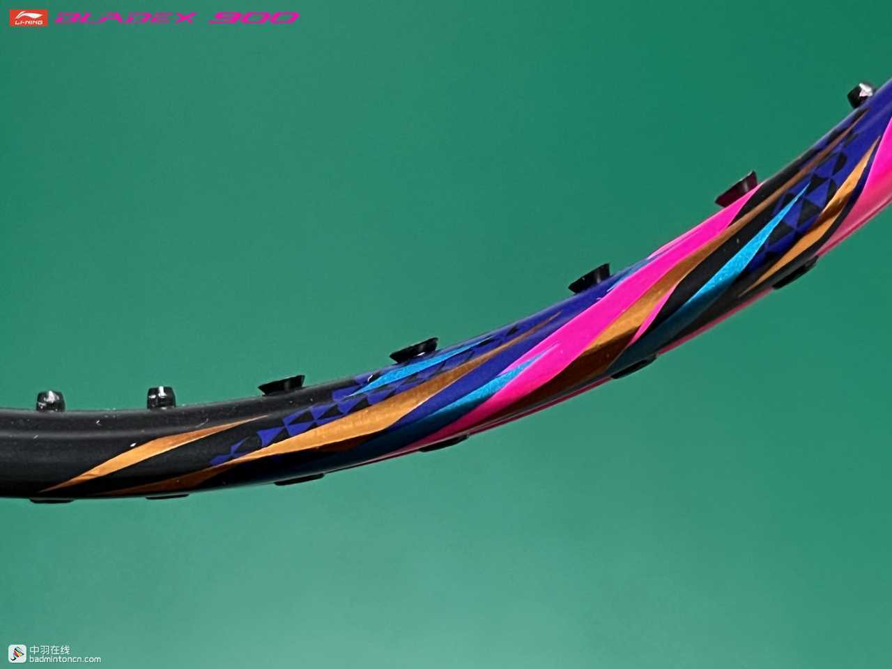 锋影900 NEW的中杆上半部分直至连接三通处为黑色,下半部分直至锥盖则为莓红色,中间部分和拍框一样采用以紫色、银灰色、水蓝色图案以及金色的亮面水标组成的图案作为过渡,就像利如刀刃的疾风,以迅雷不及掩耳之势一扫而过。