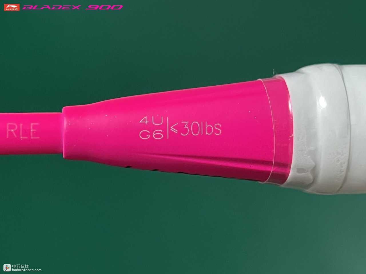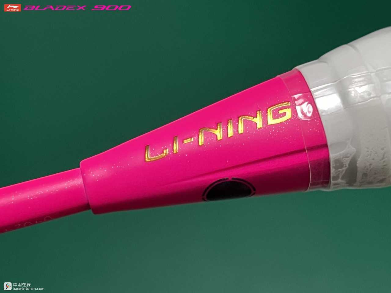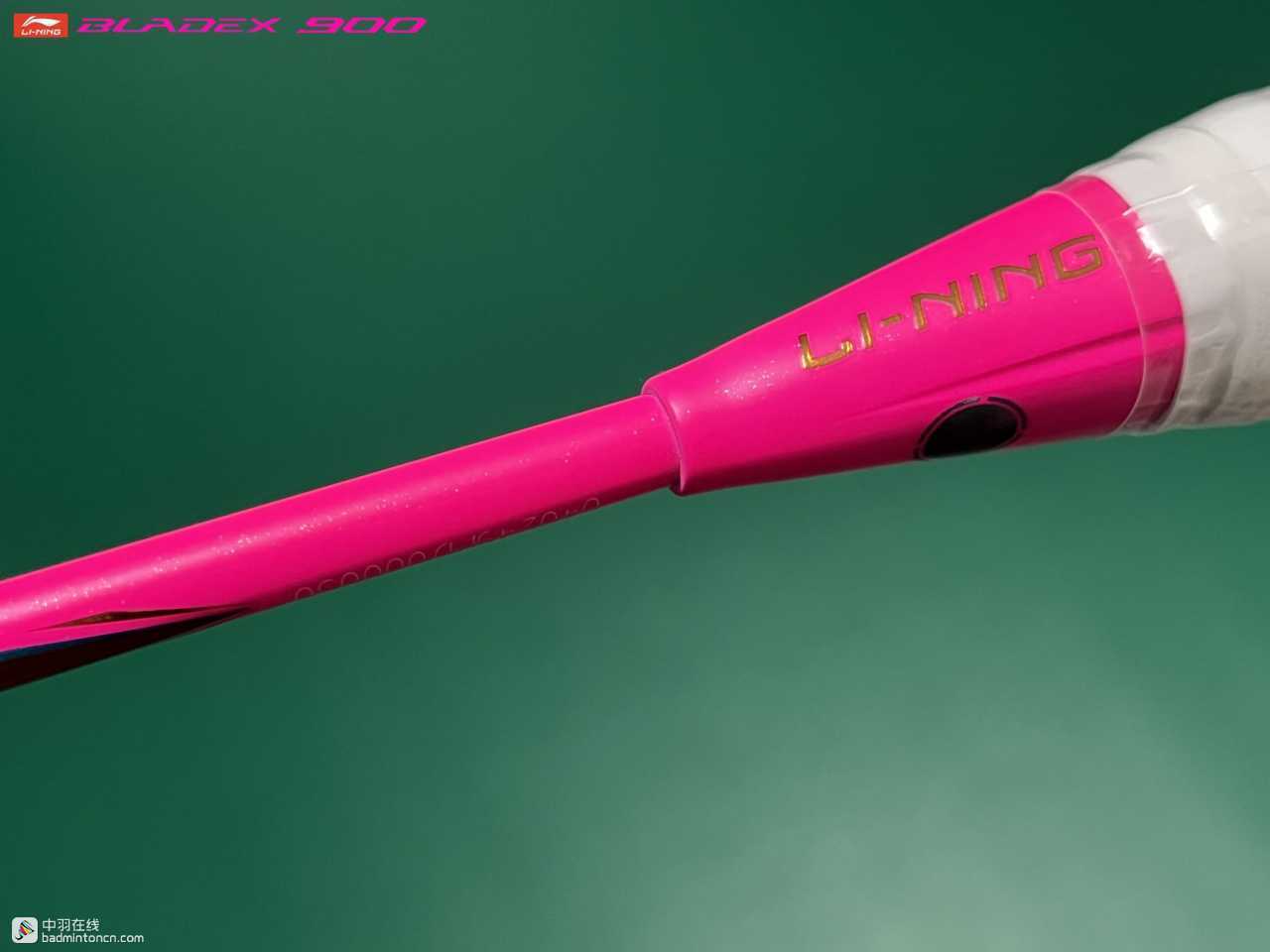 型号名称“BLADEX 900”以金色字印于中杆一侧的莓红色部分之上,颜色搭配乍一看不算非常醒目,但整体打量之下和拍框以及中杆上半部分的金色水标装饰相呼应,显得恰到好处,就像不羁的自由中蕴藏着的那一份雅致。