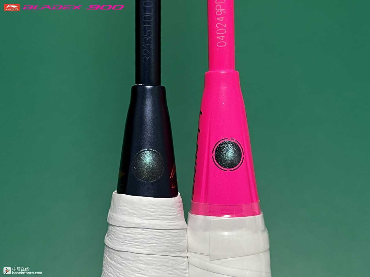锋影900 NEW和锋影900日MAX均为10mm加长,实测球拍总长基本一致,均为674mm左右,因而在二者拍框这大约5mm的长度差中,除了锋影900 NEW的中杆比锋影900日MAX长出的1mm以外,其余部分都补在了锋影900 NEW的手柄上。也就是说,锋影900 NEW采用的是长手柄的设计,这有利于握拍时上下调整握持的位置,以实现在实战中更为灵活的调整,尤其适用于双打里后场和中前场之间的切换,这也非常符合其作为速度型球拍的定位和使用需求。