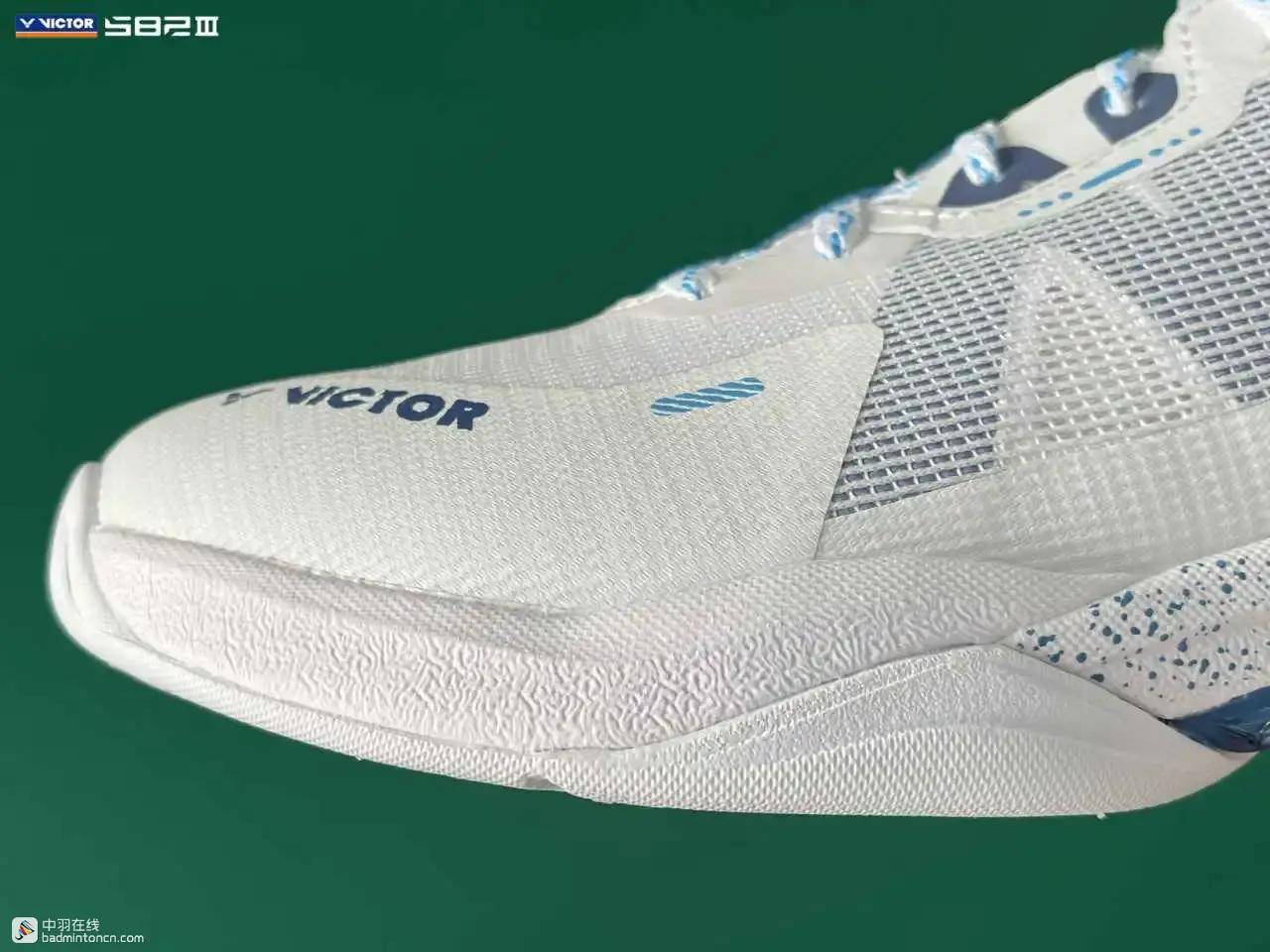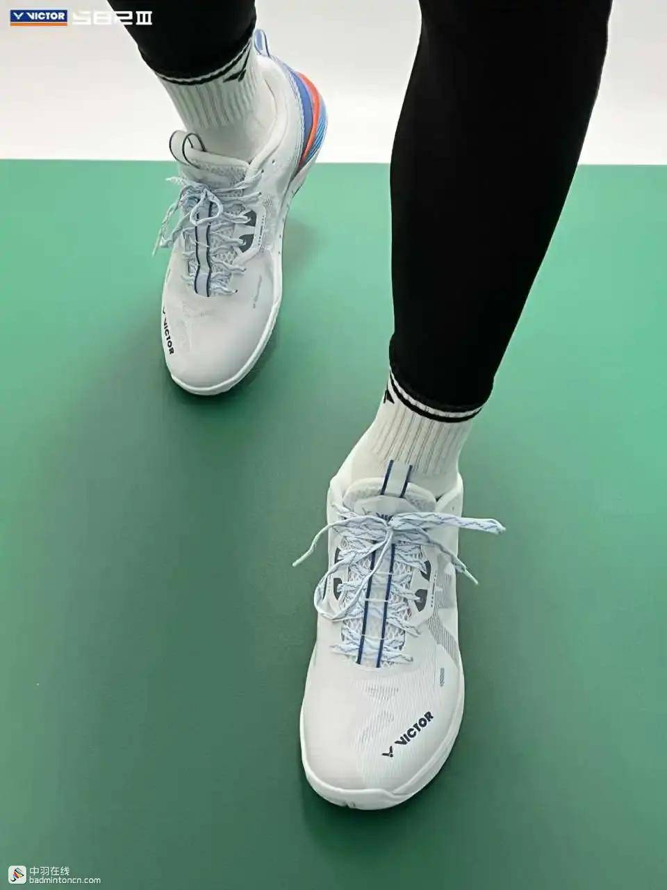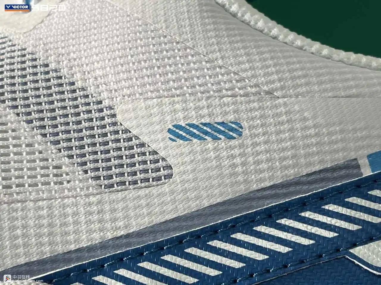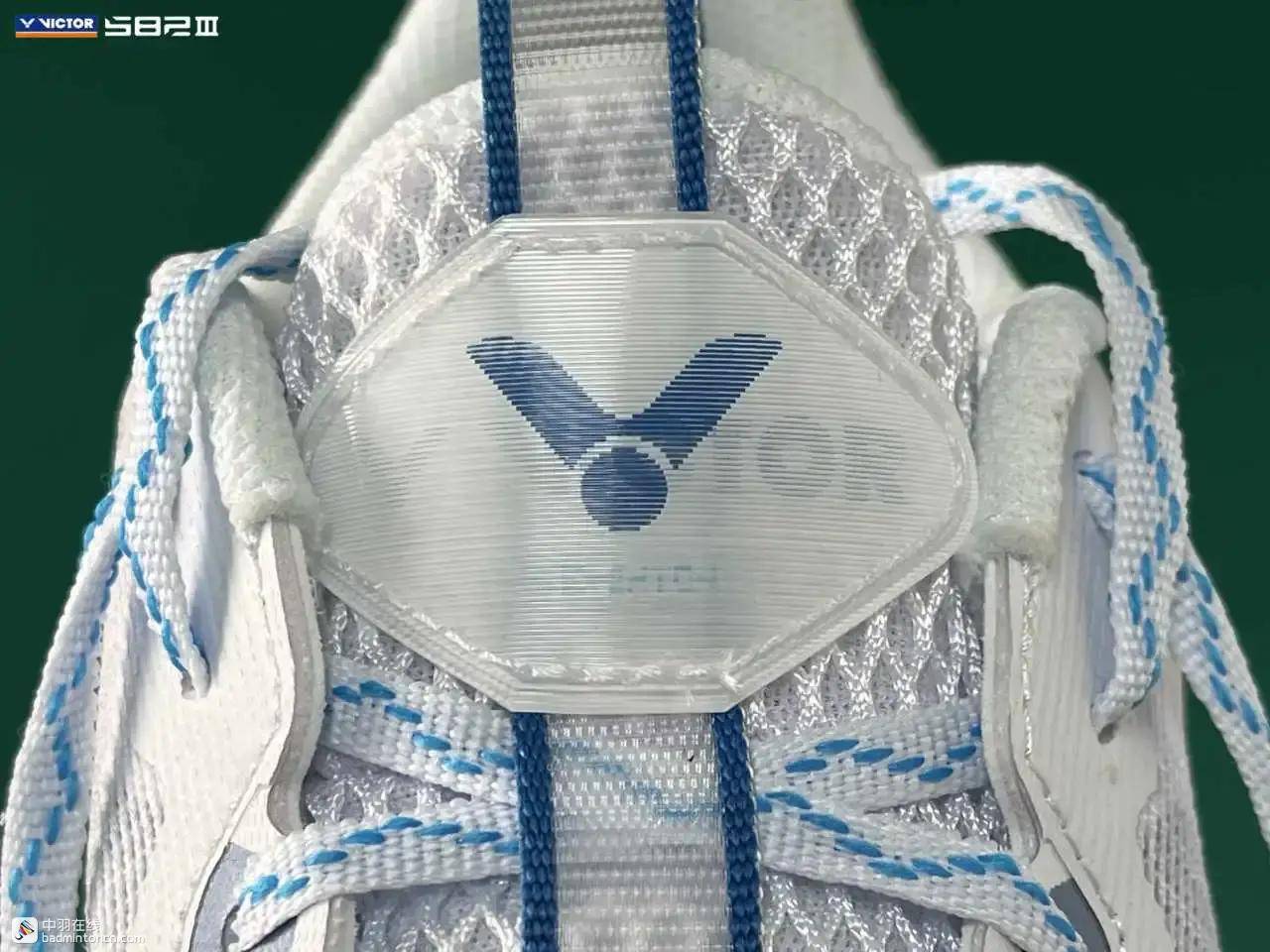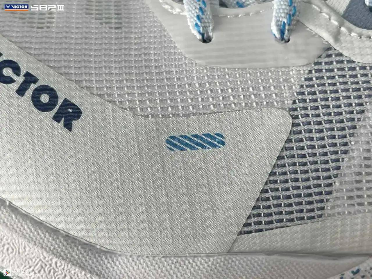 从大底到鞋面、鞋舌,S82 Ⅲ大面积采用白色,视觉一体感出色。前端外侧白色的PU革上,深蓝色的威克多LOGO在醒目的同时也显得低调朴实。