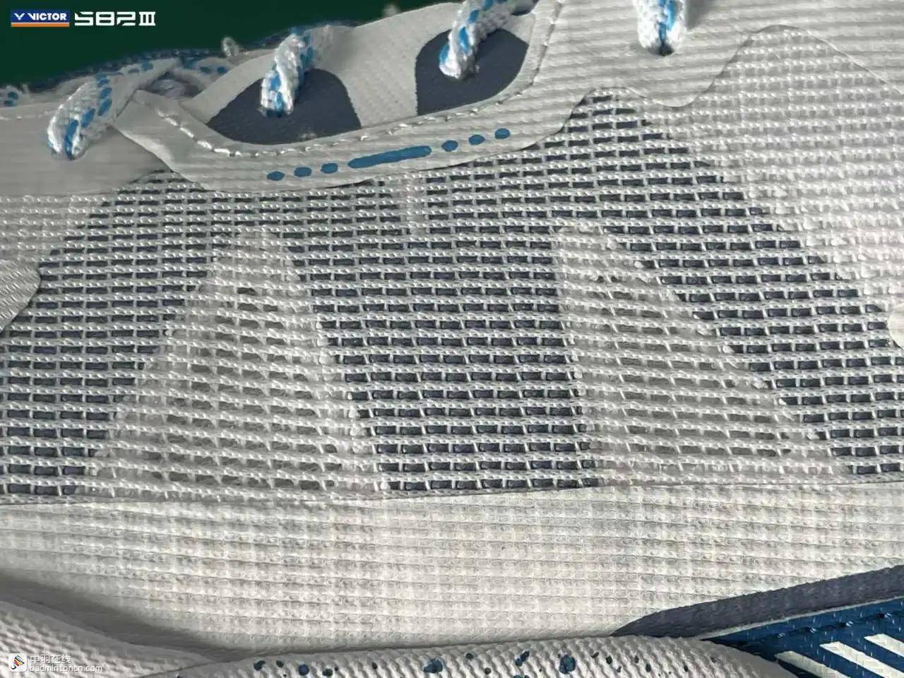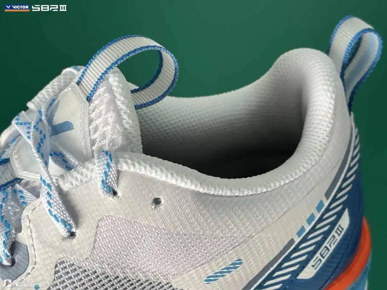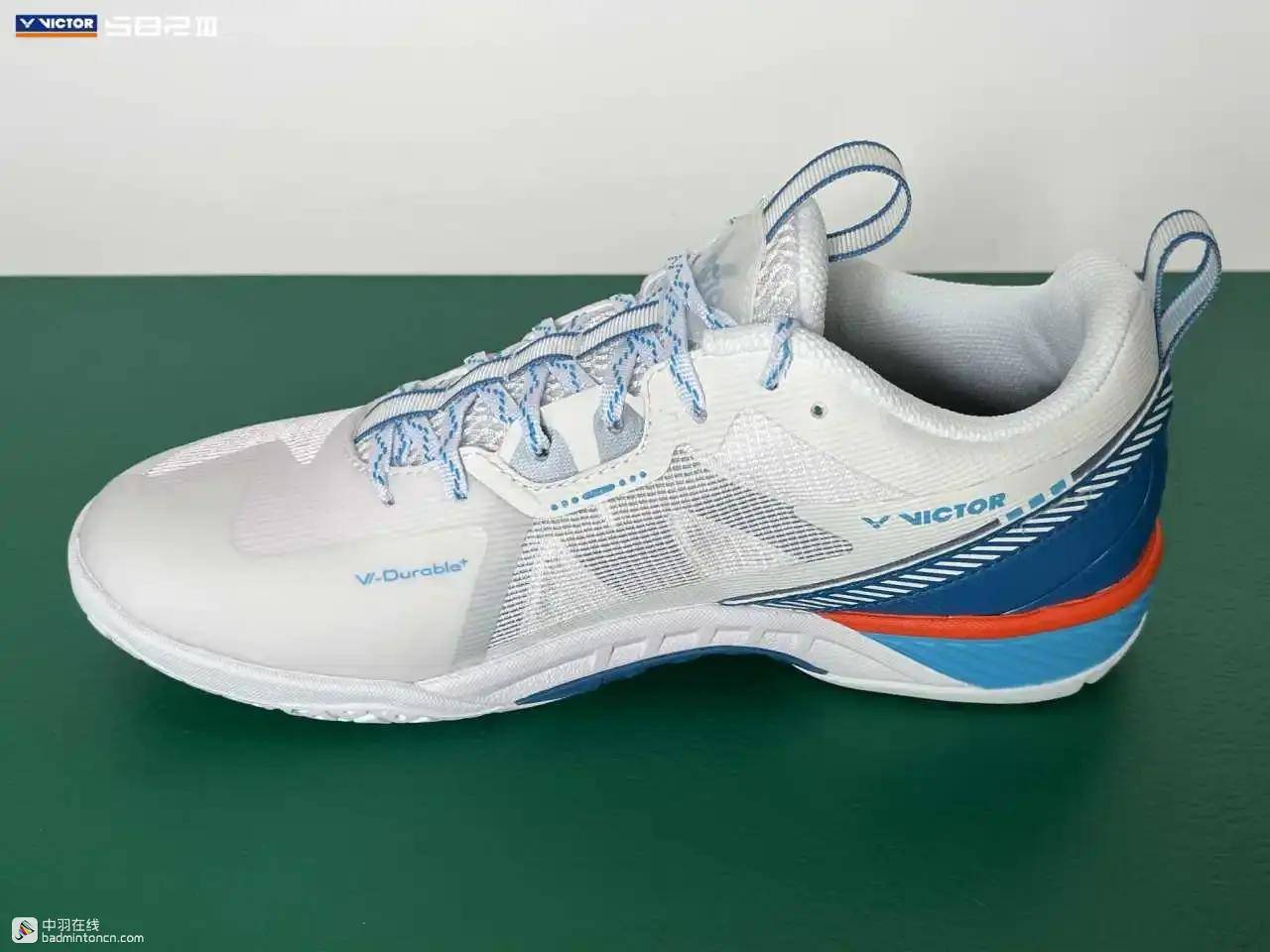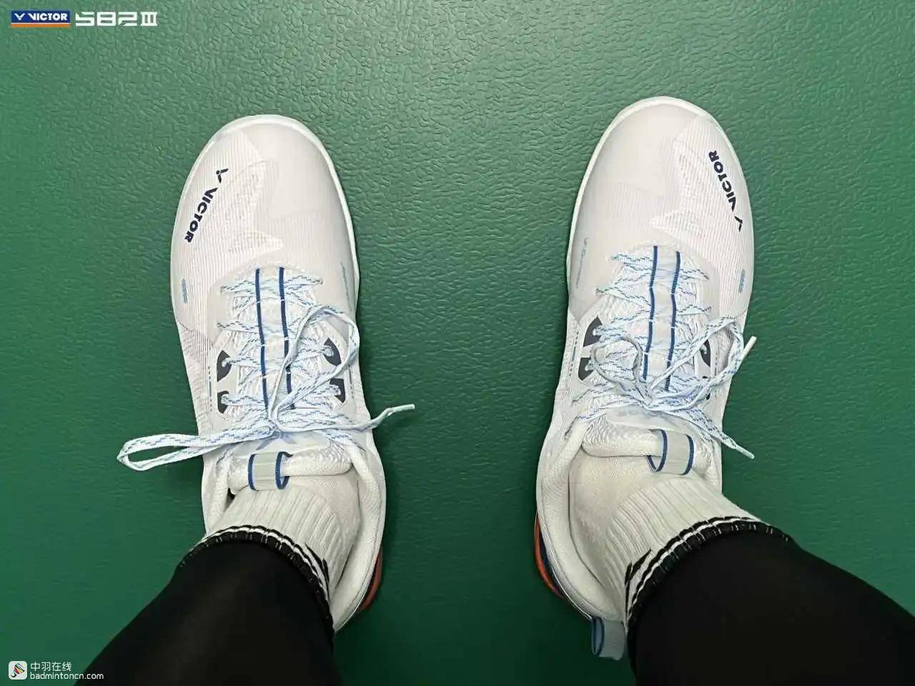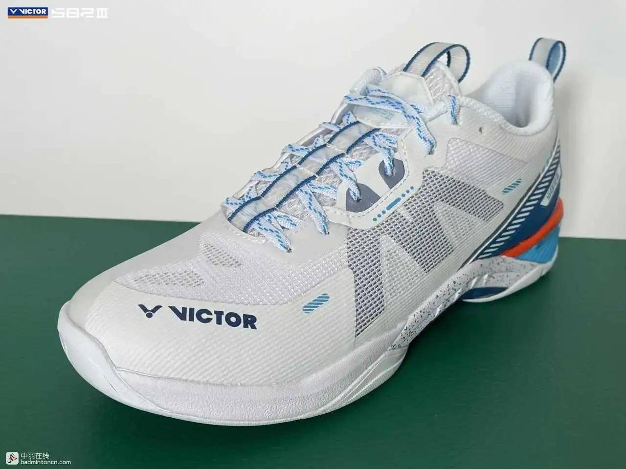 从大底到鞋面、鞋舌,S82 Ⅲ大面积采用白色,视觉一体感出色。前端外侧白色的PU革上,深蓝色的威克多LOGO在醒目的同时也显得低调朴实。