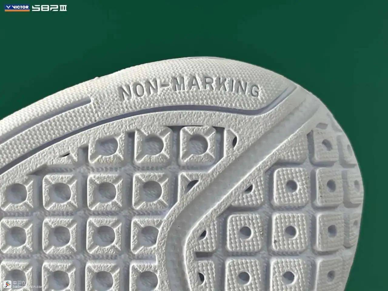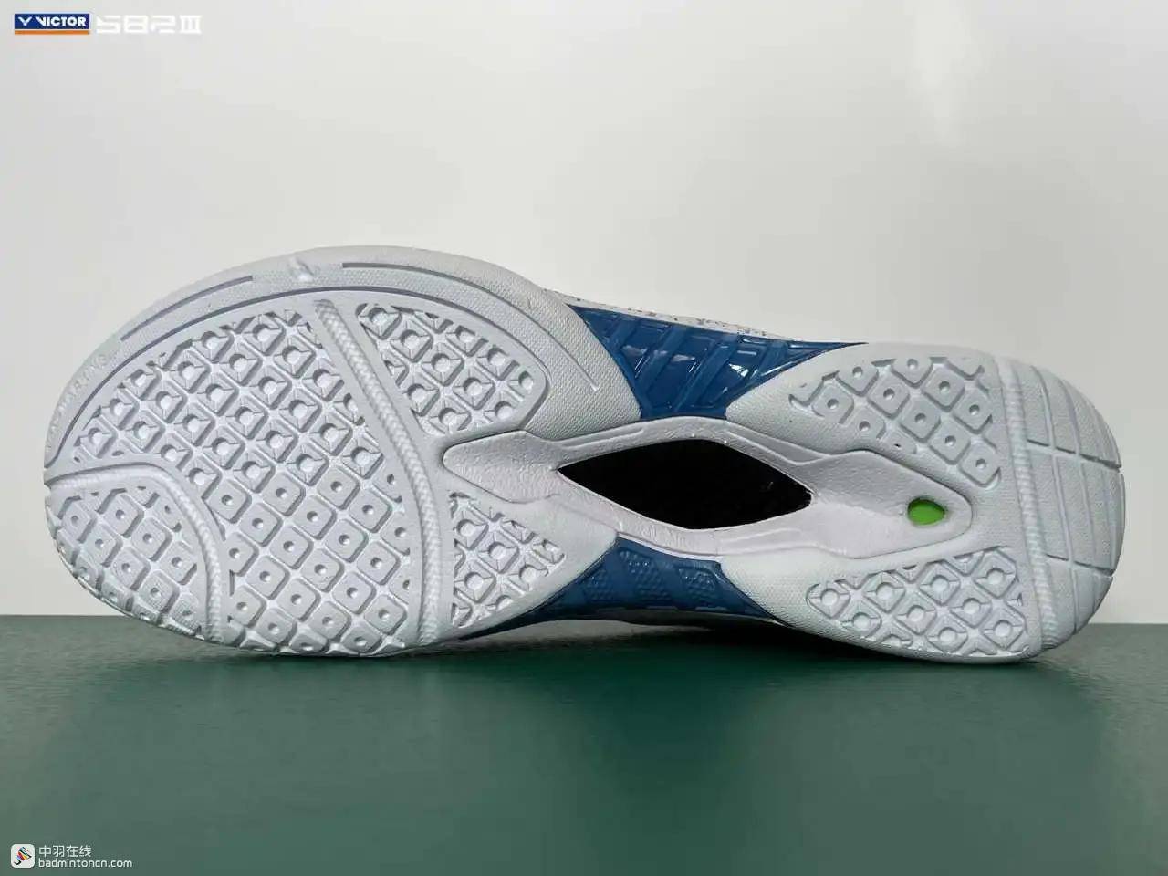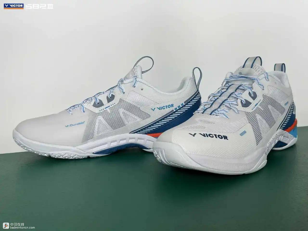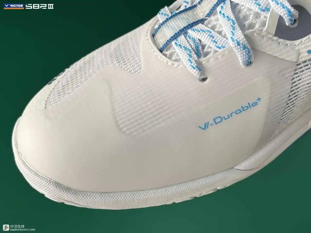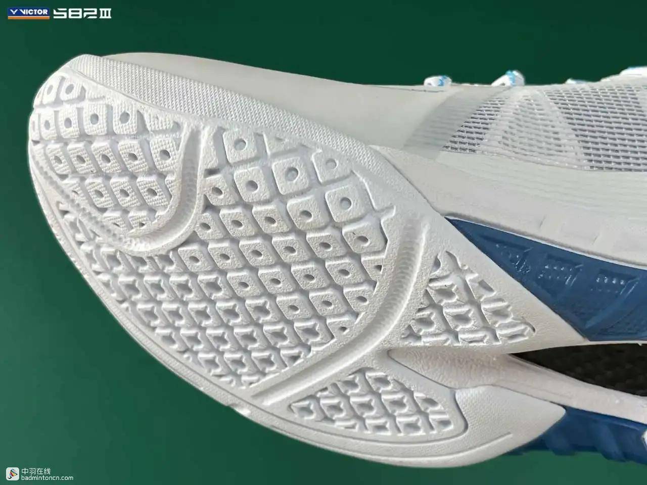 从大底到鞋面、鞋舌,S82 Ⅲ大面积采用白色,视觉一体感出色。前端外侧白色的PU革上,深蓝色的威克多LOGO在醒目的同时也显得低调朴实。