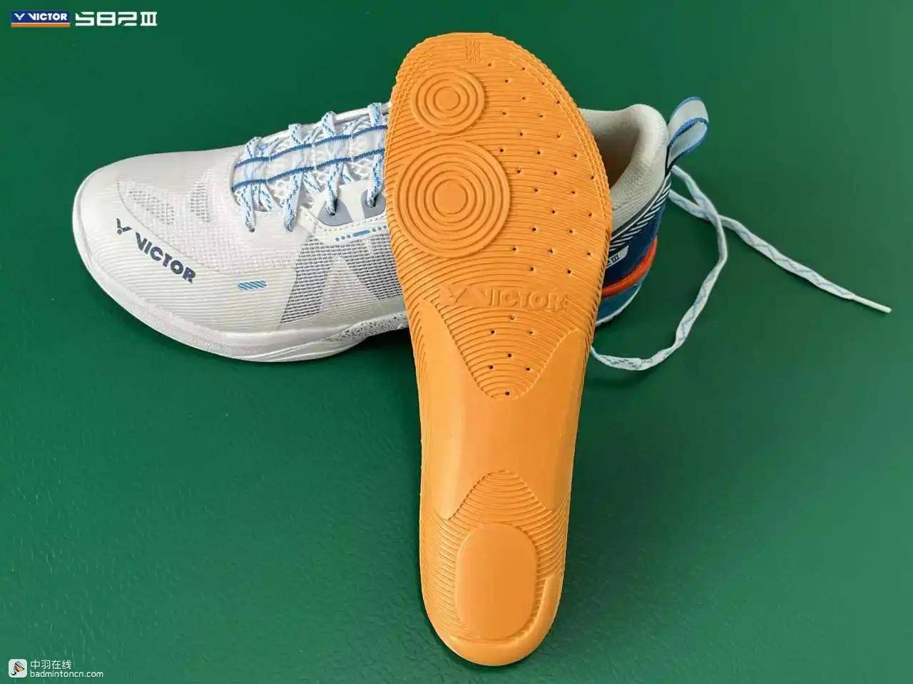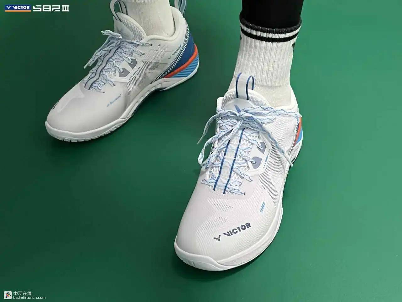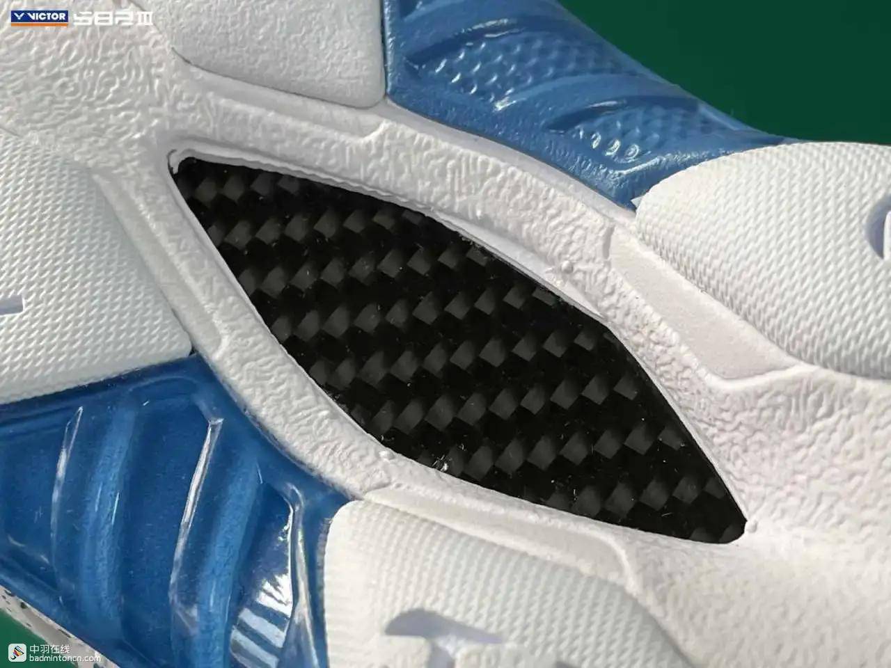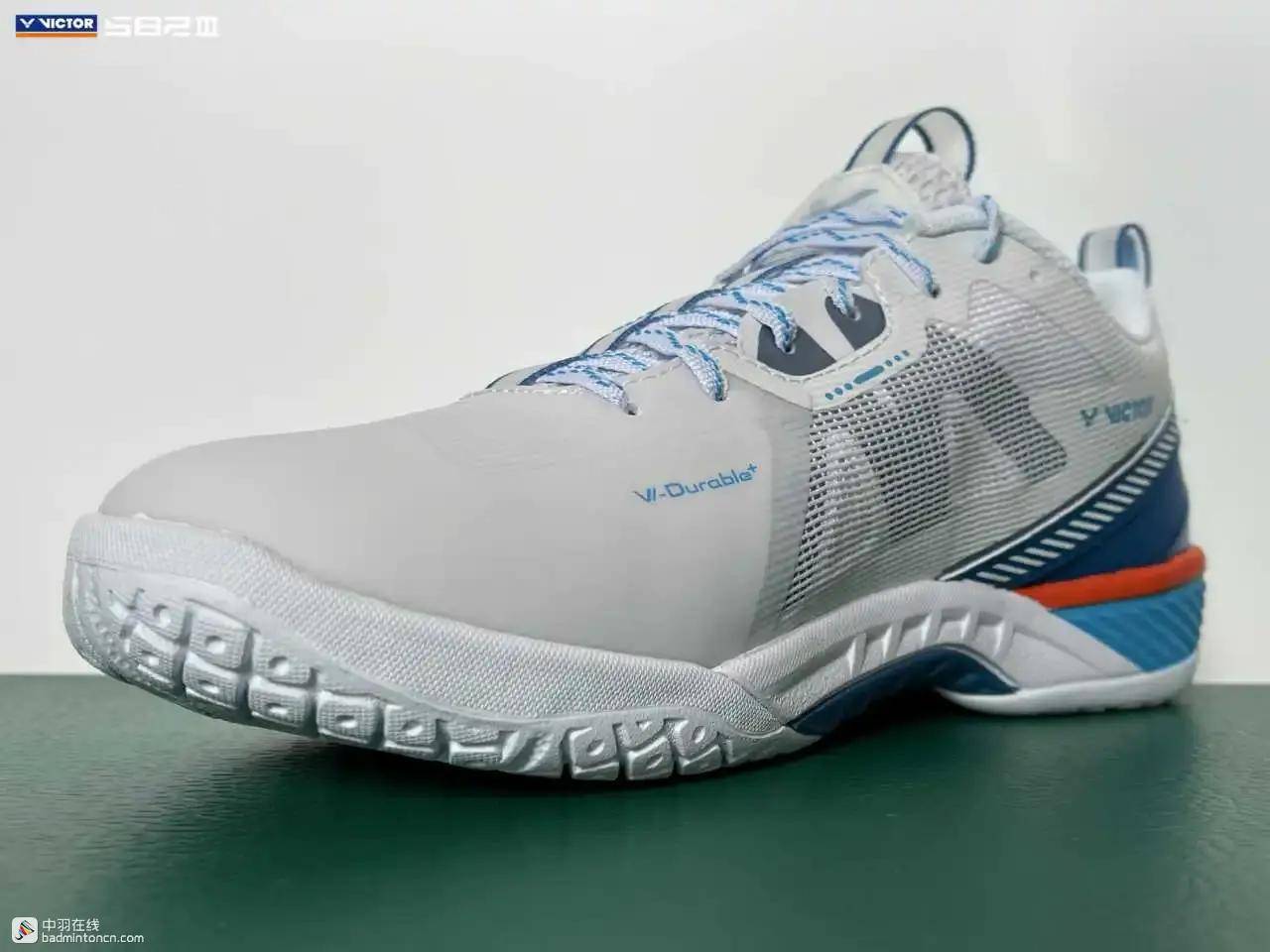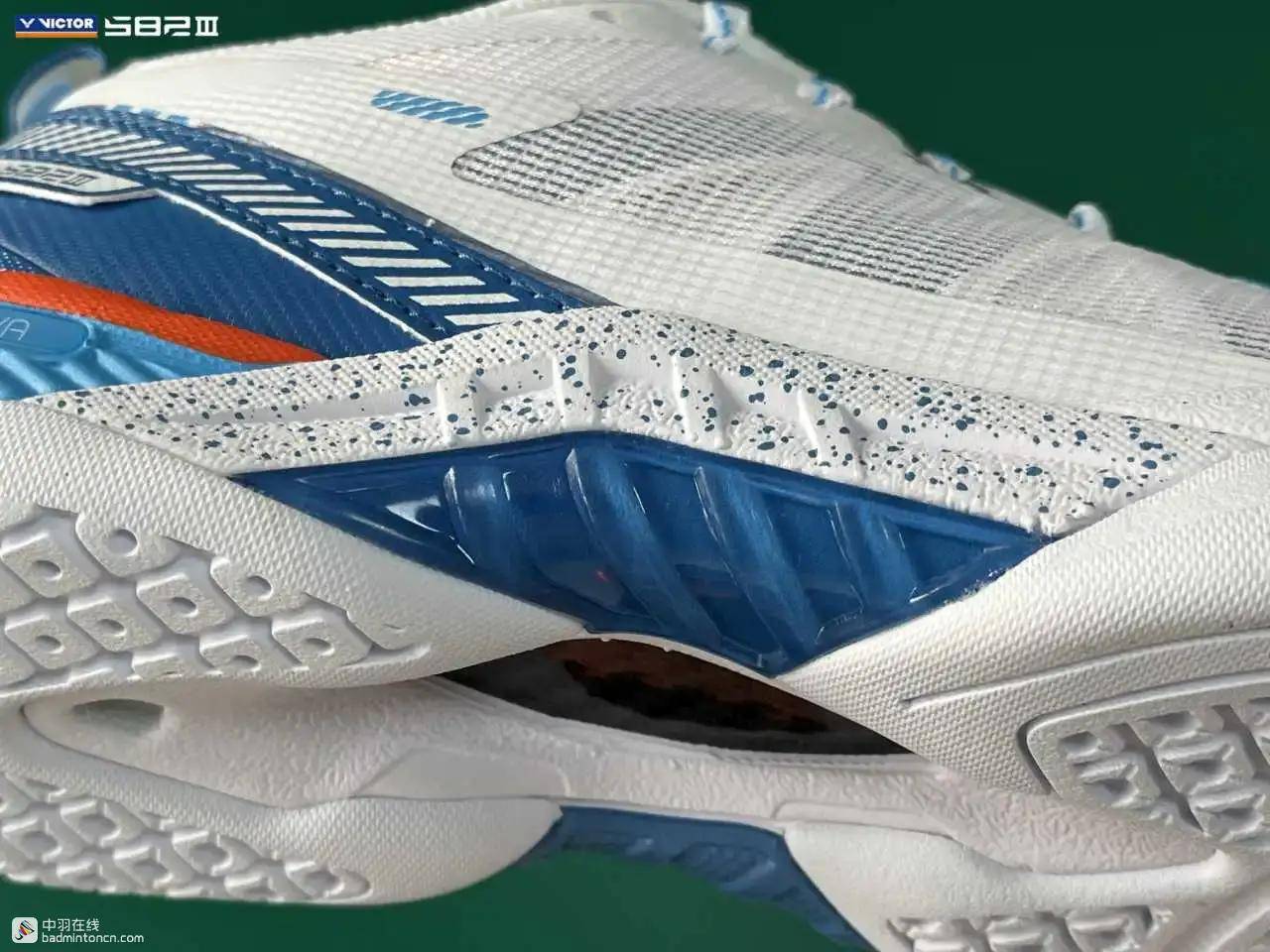 从大底到鞋面、鞋舌,S82 Ⅲ大面积采用白色,视觉一体感出色。前端外侧白色的PU革上,深蓝色的威克多LOGO在醒目的同时也显得低调朴实。