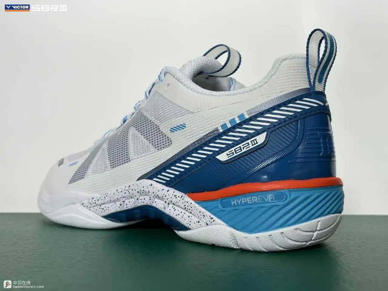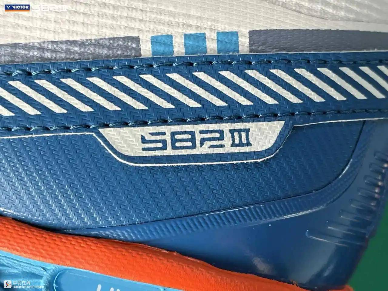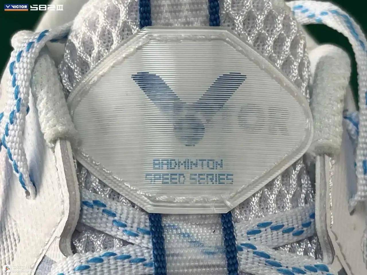 其中的内容包括S82 Ⅲ型号名称、威克多LOGO和品牌名称、以及“BADMINTON SPEED SERIES”即速度类羽毛球鞋的标注。对多种信息标注的一体化整合,也避免了将过多文字标注在鞋面上而造成的杂乱,保证了外观的精简美观。