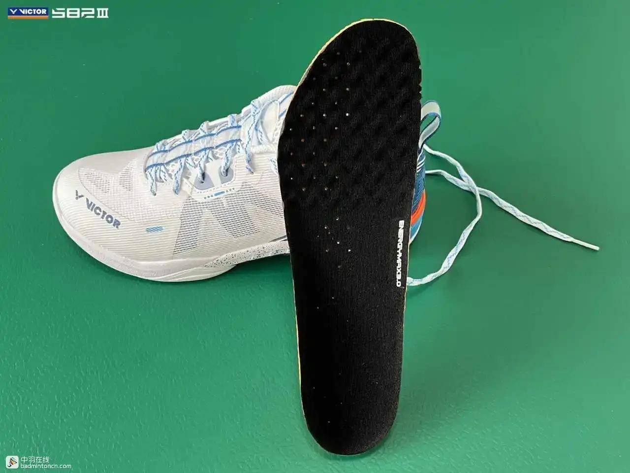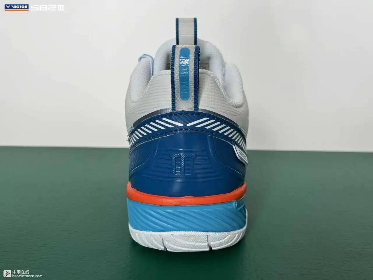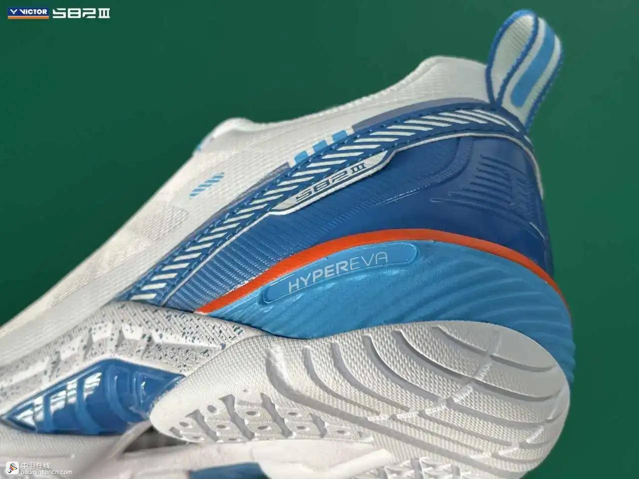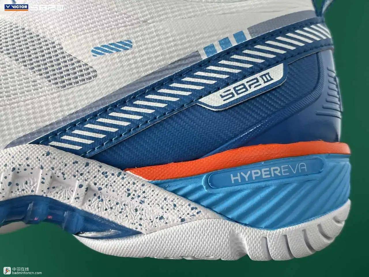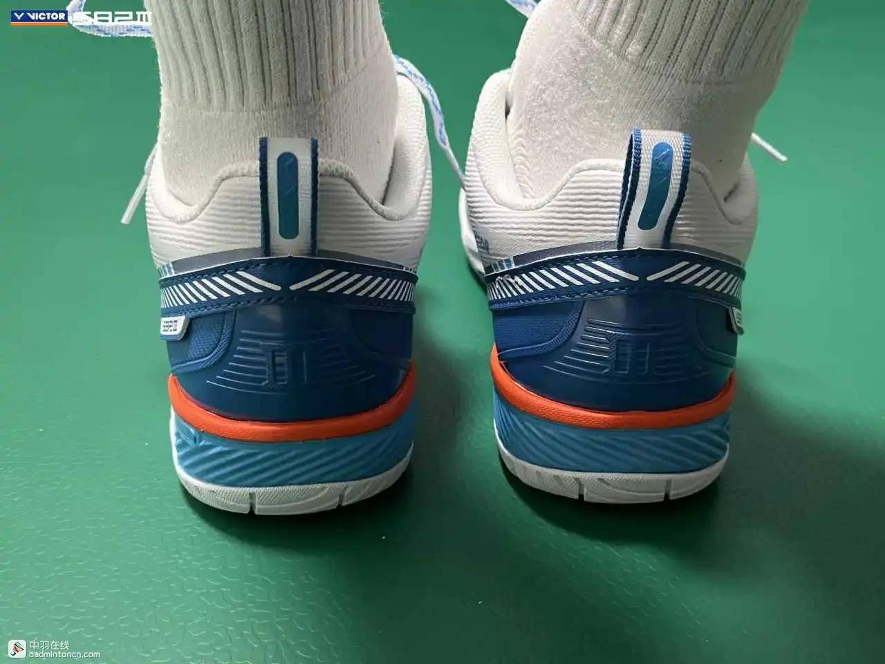 内侧的外观布局基本和外侧一致,以蓝灰色的“M”形为中心,两侧分布有蓝色的科技名称标识、以及后跟处蓝色的“VICTOR”和LOGO。