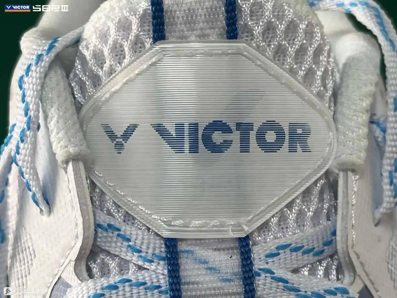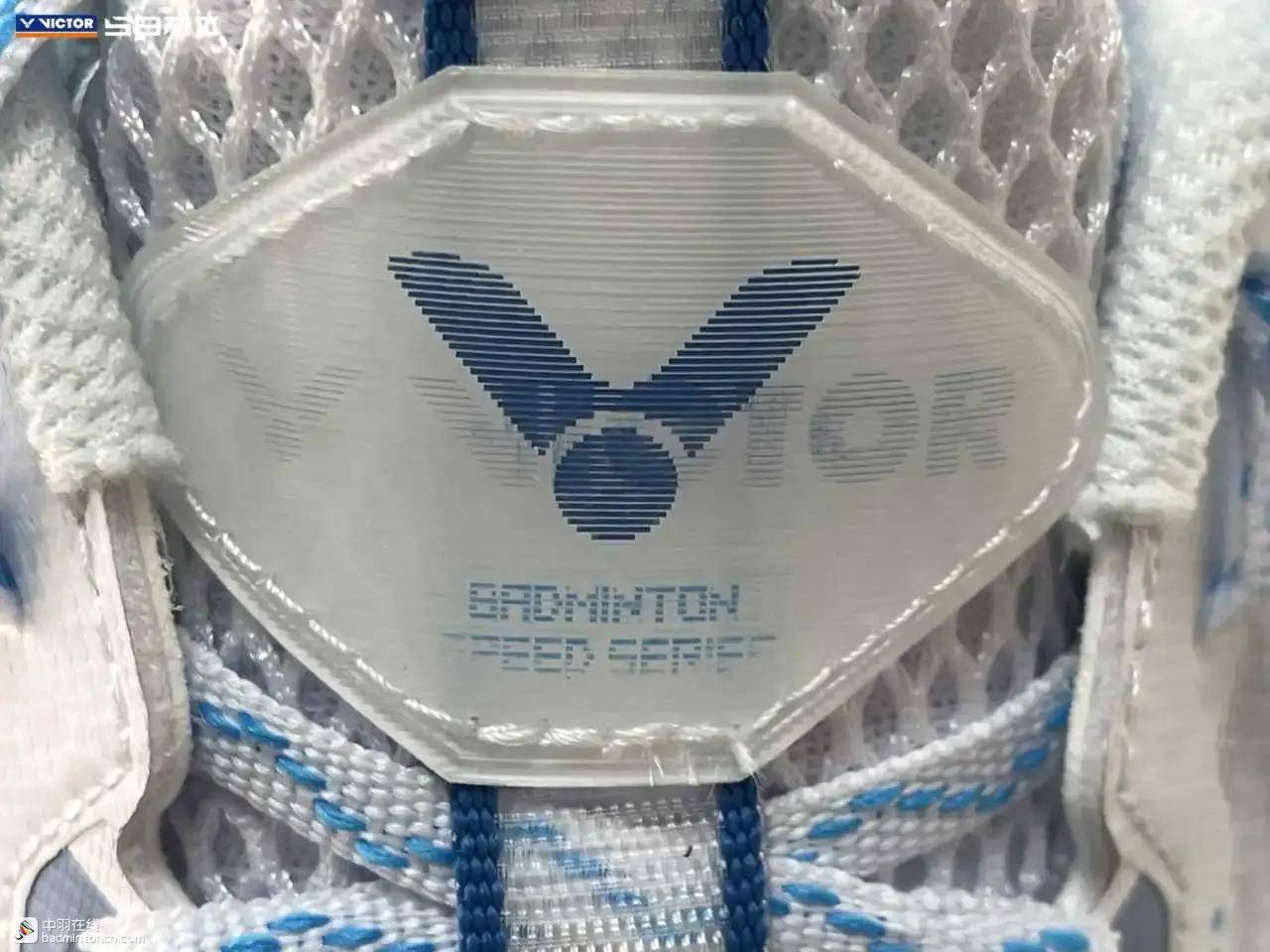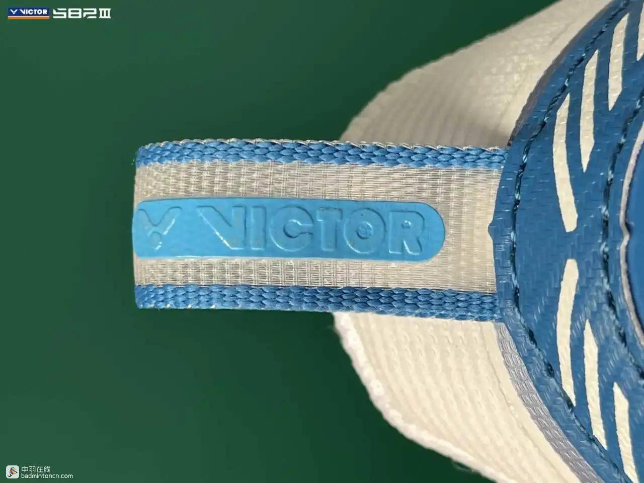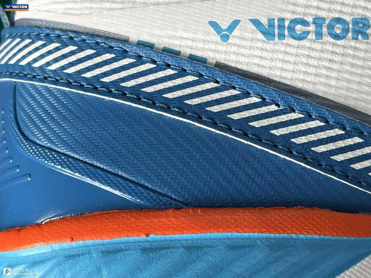 贴在后跟提拉环上的蓝色TPU薄膜上也以浮雕的形式标上了“VICTOR”和LOGO。