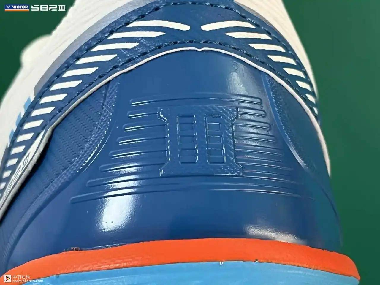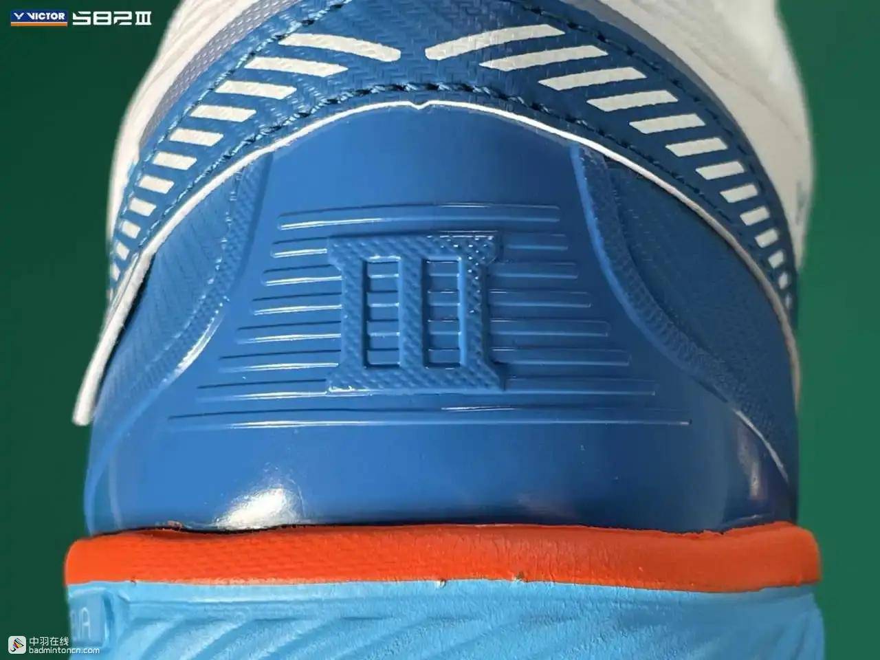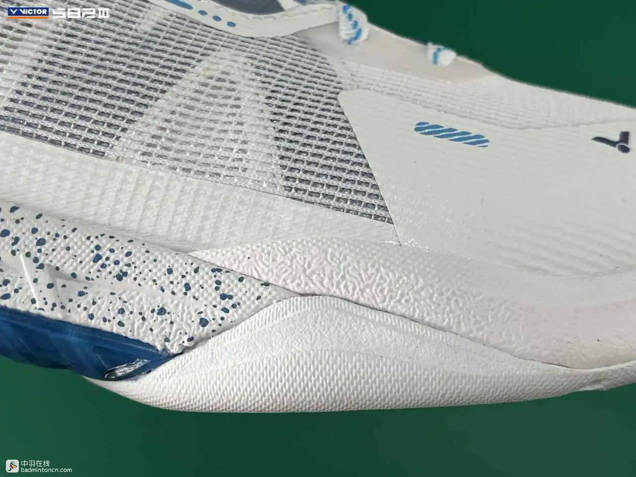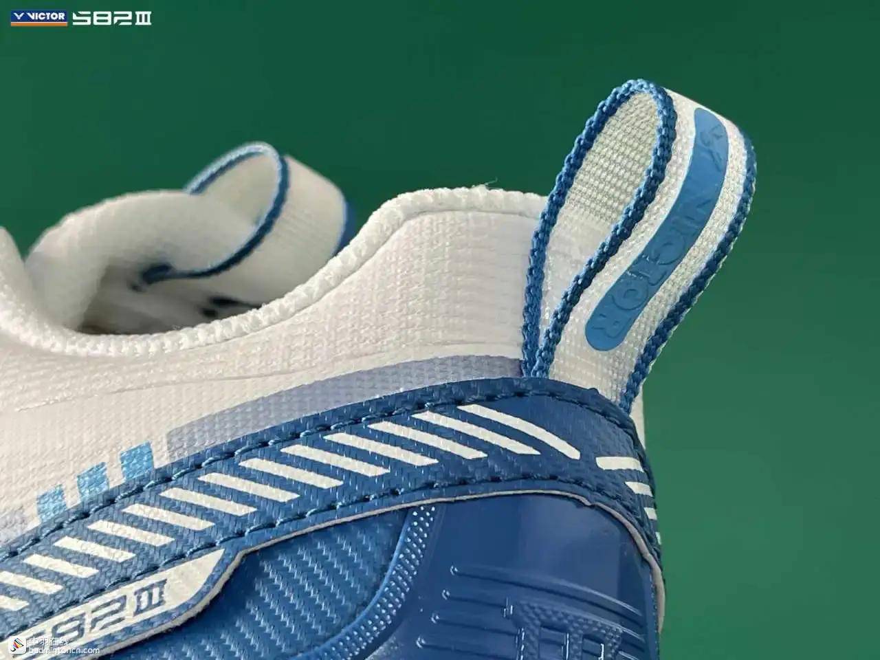 贴在后跟提拉环上的蓝色TPU薄膜上也以浮雕的形式标上了“VICTOR”和LOGO。