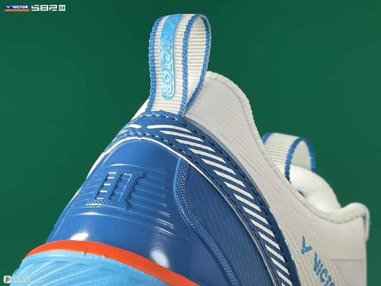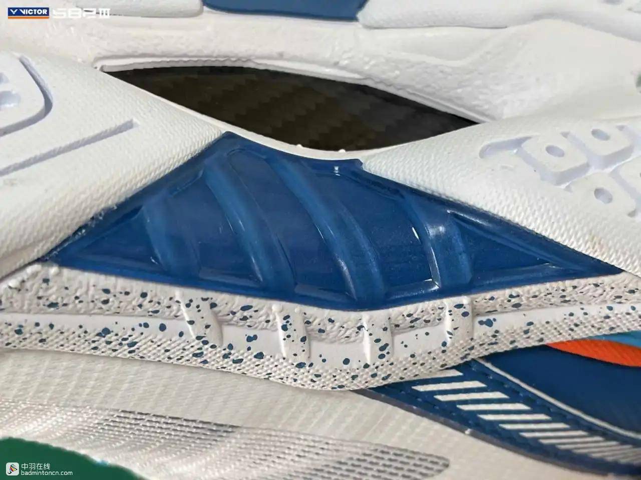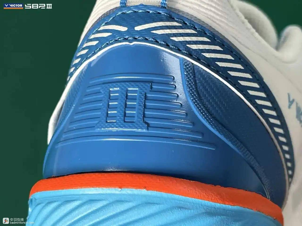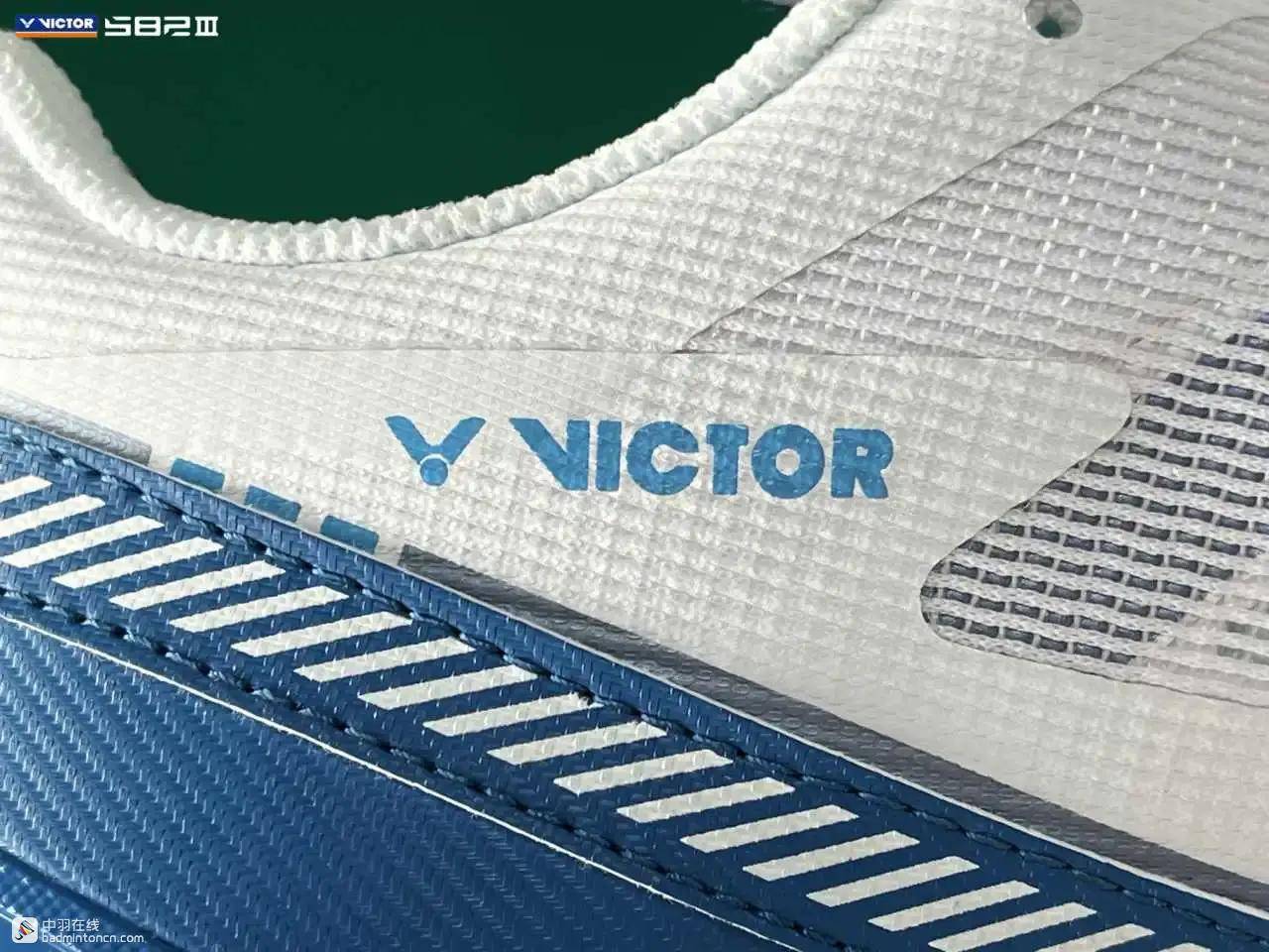 贴在后跟提拉环上的蓝色TPU薄膜上也以浮雕的形式标上了“VICTOR”和LOGO。