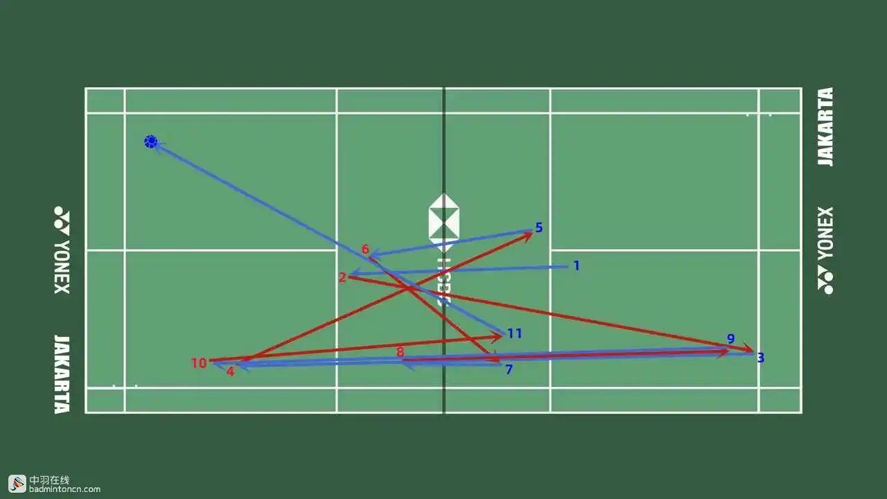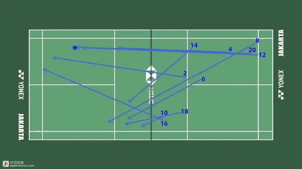间歇后第一分,11:8,石宇奇就通过提高推挑的弧度,限制了安东森头顶突击的威力,然后从容地接杀挡对角得分。