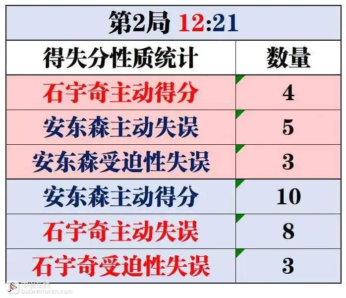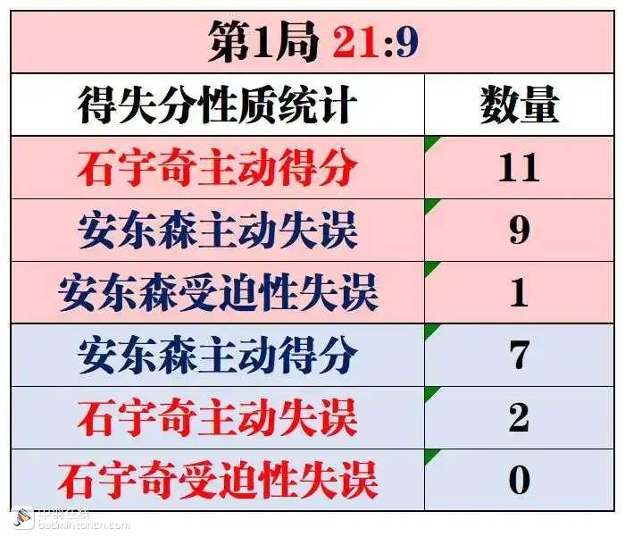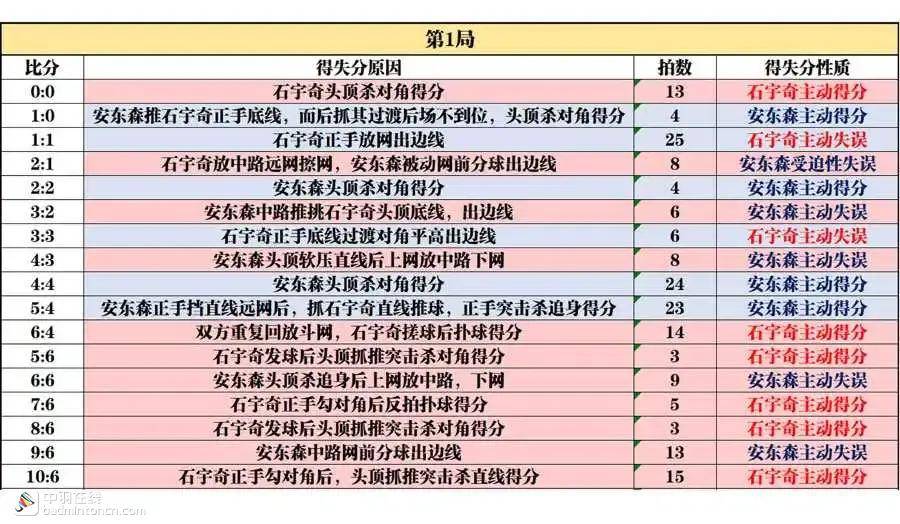 纵观首局,算上安东森的受迫性失误,石宇奇凭借12个主动球牢牢占据上风,而在失误率的控制上也更为出色,仅在开局阶段有两个主动失误,而安东森的主动失误多达9个。可以说在各方面石宇奇都表现更为出色。