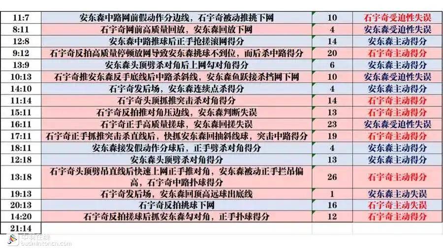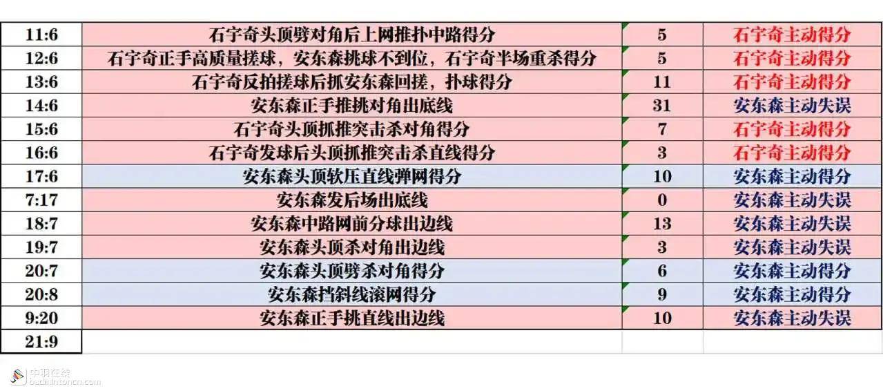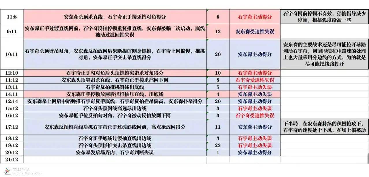 但是,随着比赛继续进行,安东森的速度优势开始放大,前半局石宇奇更多地还是保持跟随,到了下半局,或许是遇到了体能极点,在场上有些跟不上安东森的速度,尤其是在12:14的多拍之后,就完全丧失了节奏。最终,安东森打出了一波10:2的攻势,12:14之后更是连得7分,一鼓作气拿下第二局,算是回敬了石宇奇在首局后半段的连续得分。