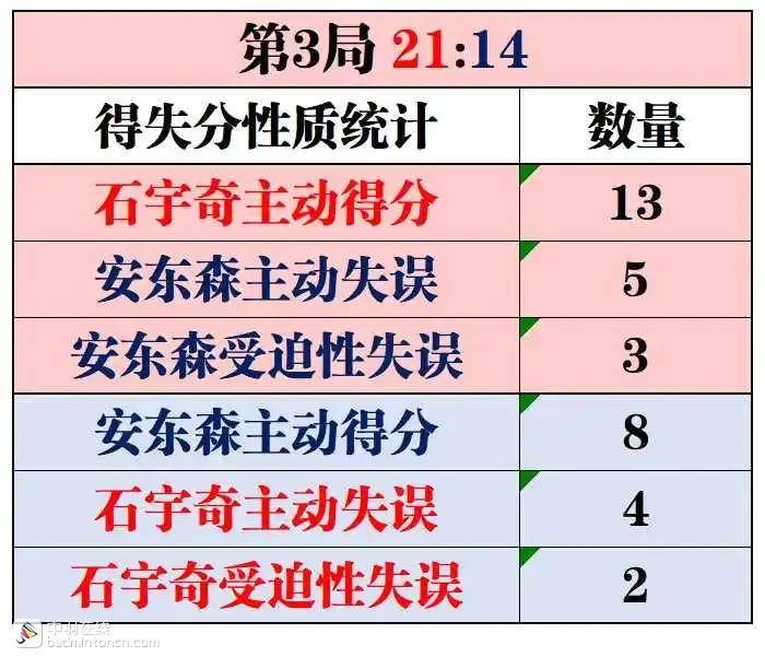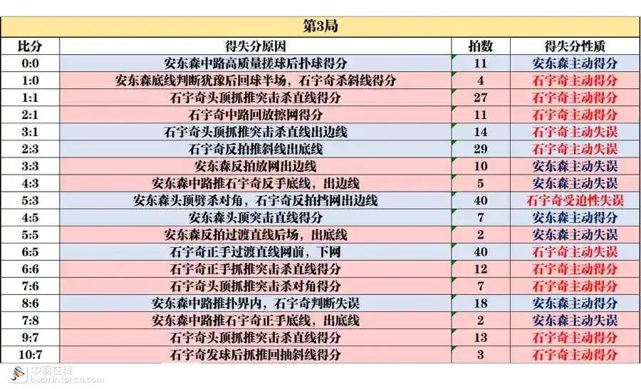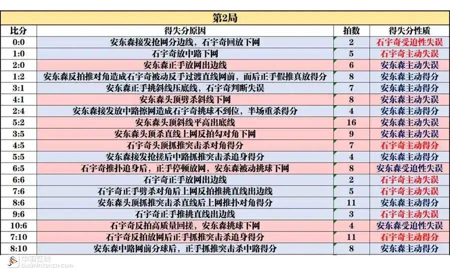 第三局双方的失误总数相差不大,但是石宇奇的主动得分球数量明显多于安东森,而进一步分析其构成的话,包括7个抓推突击、3球直接通过高质量网前球得分或者创造一击致命的绝对机会,而安东森的突击得分较之第二局明显少了,得分的方式也比较散,这说明他的战术执行并不成功,在失去了速度优势之后,就难以掌控场上的主动了。