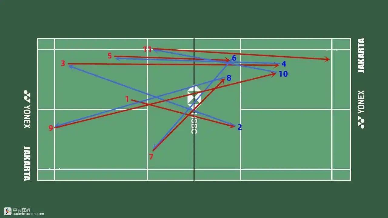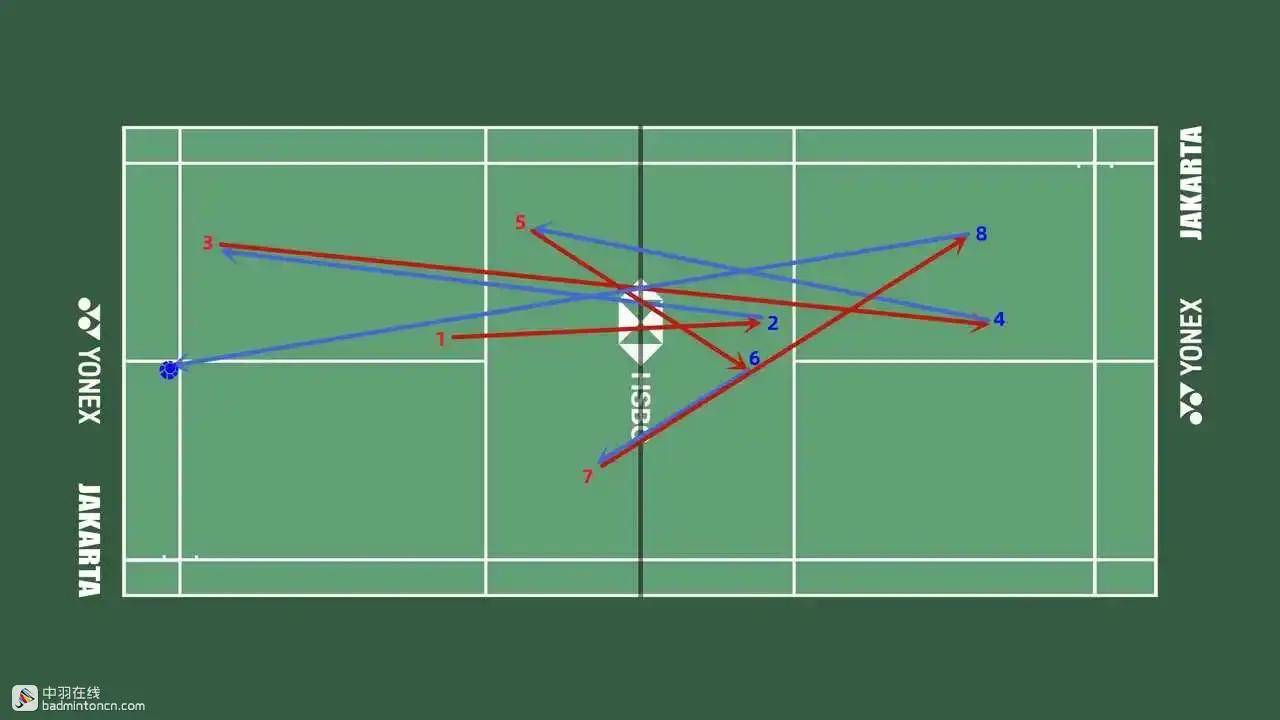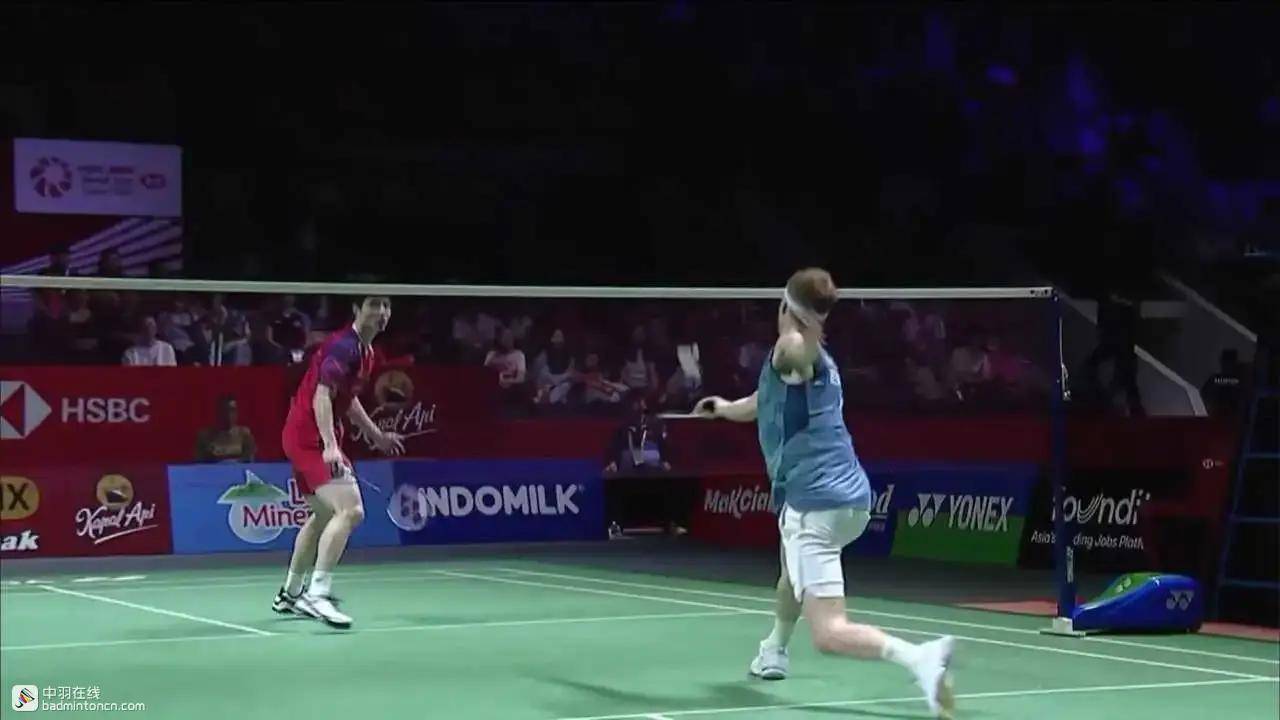 8:10,安东森接杀追身球后,在中路网前大胆分球,诱使石宇奇推挑,而后抓推突击。在第6拍网前分球后,可以看到安东森有一个提前向正手区侧身的步伐,这体现了他非常强的抓推意识,因此这拍打得非常突然。