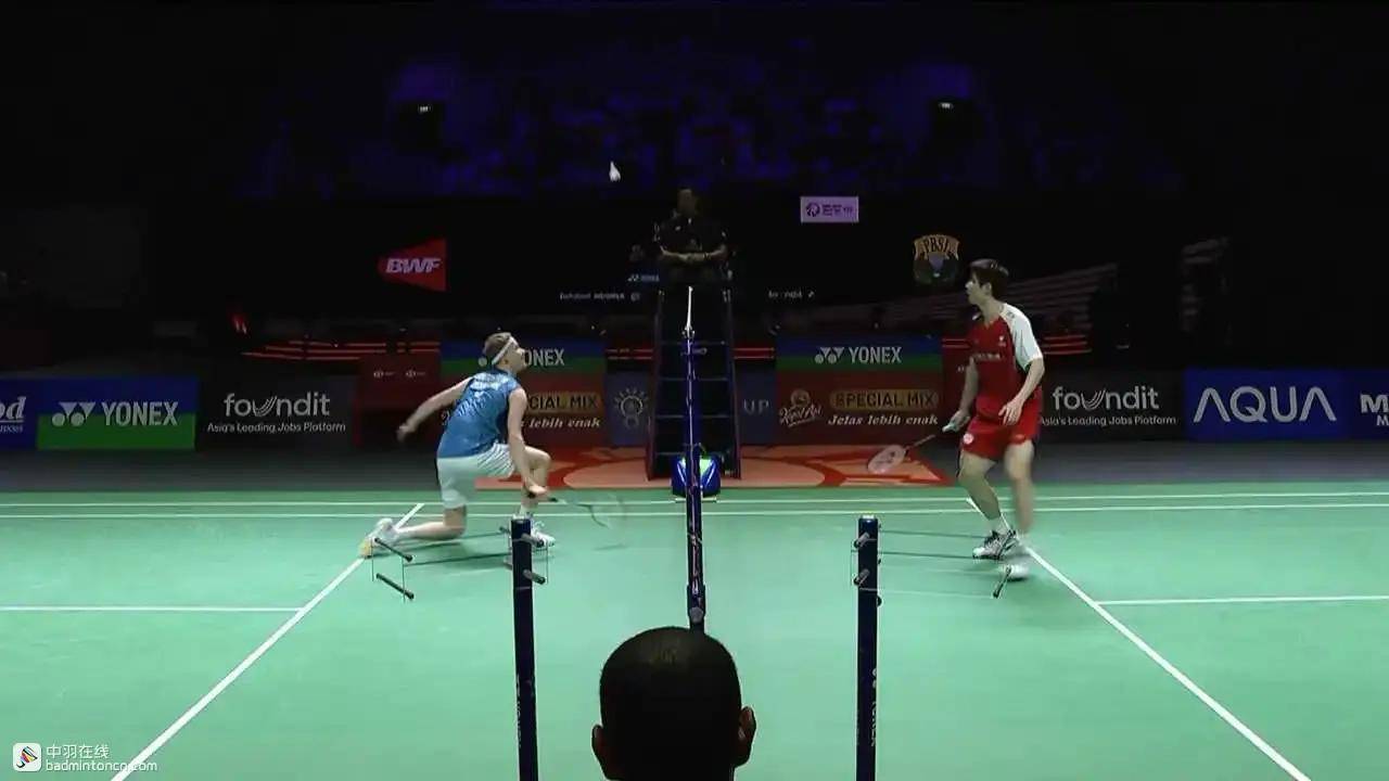 17:11,接近局末,分差逐渐拉开,石宇奇毫无保留地展现出强大的进攻能力,反拍挡网后迅速抓推突击杀直线,落点很深,虽然安东森反拍接杀回出斜线,但石宇奇连贯很快,从右半场区迅速移动到左半场区前场,拦截杀中路得分。