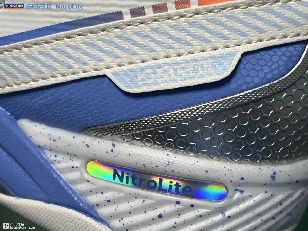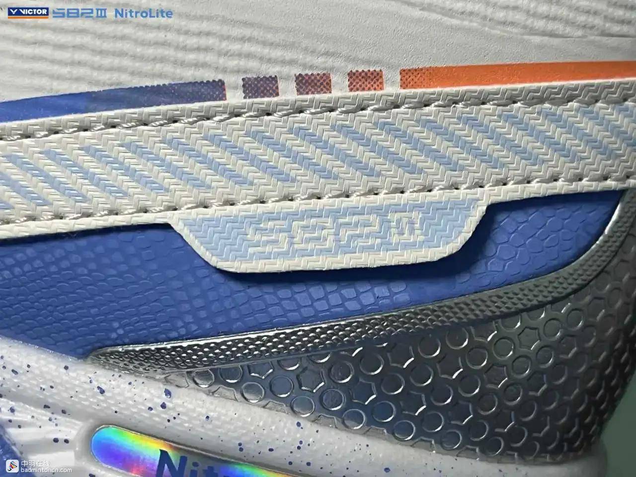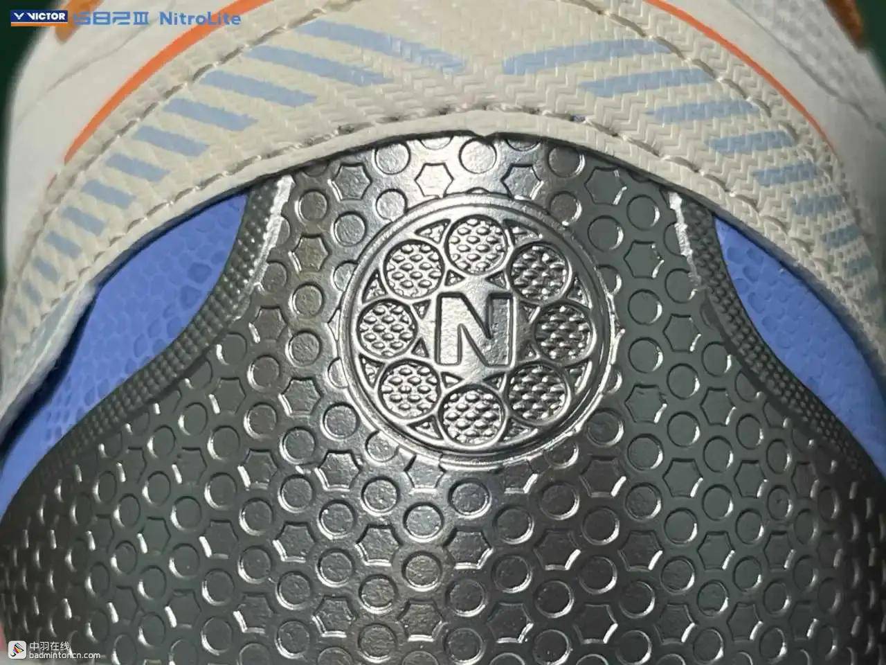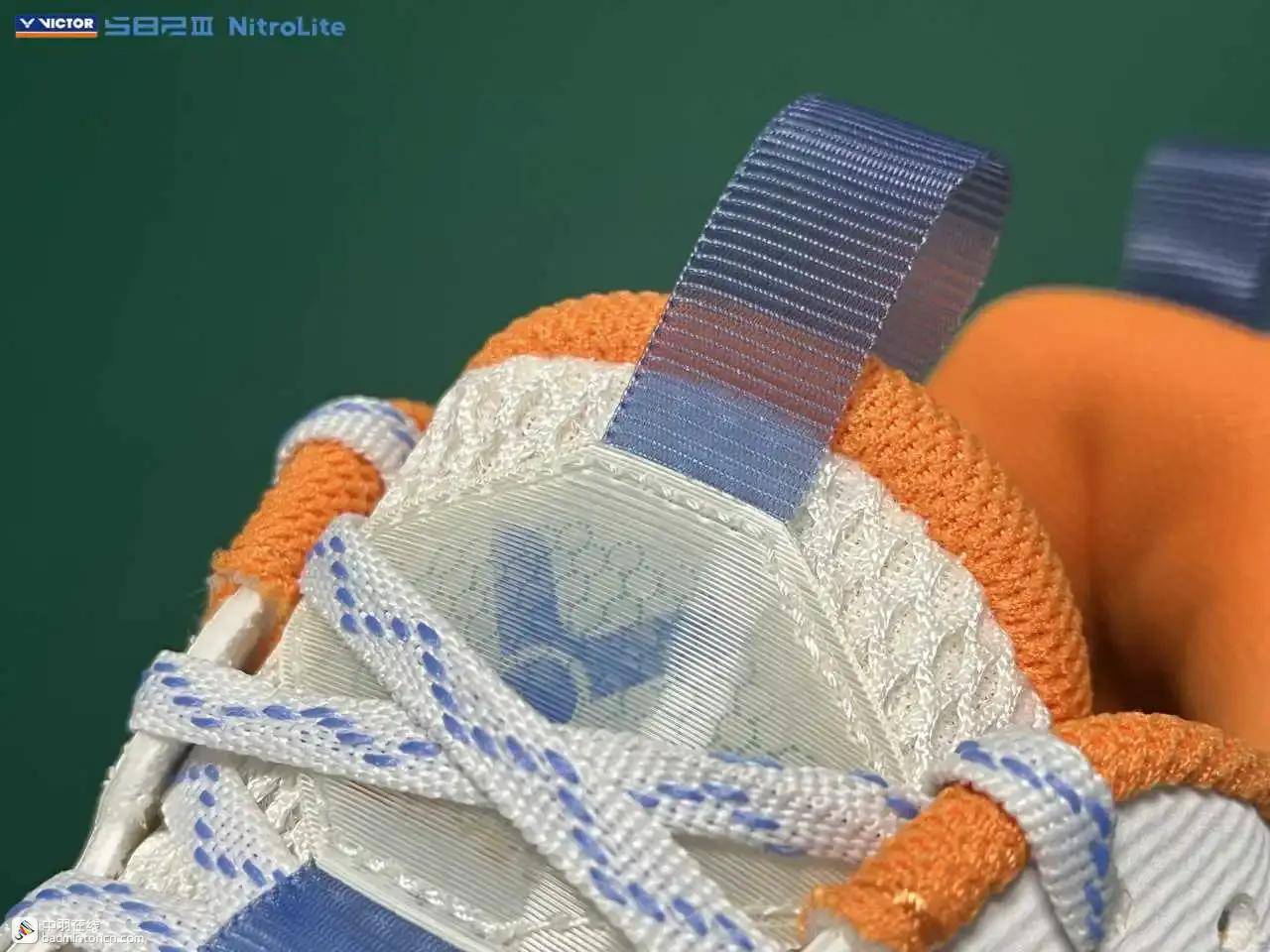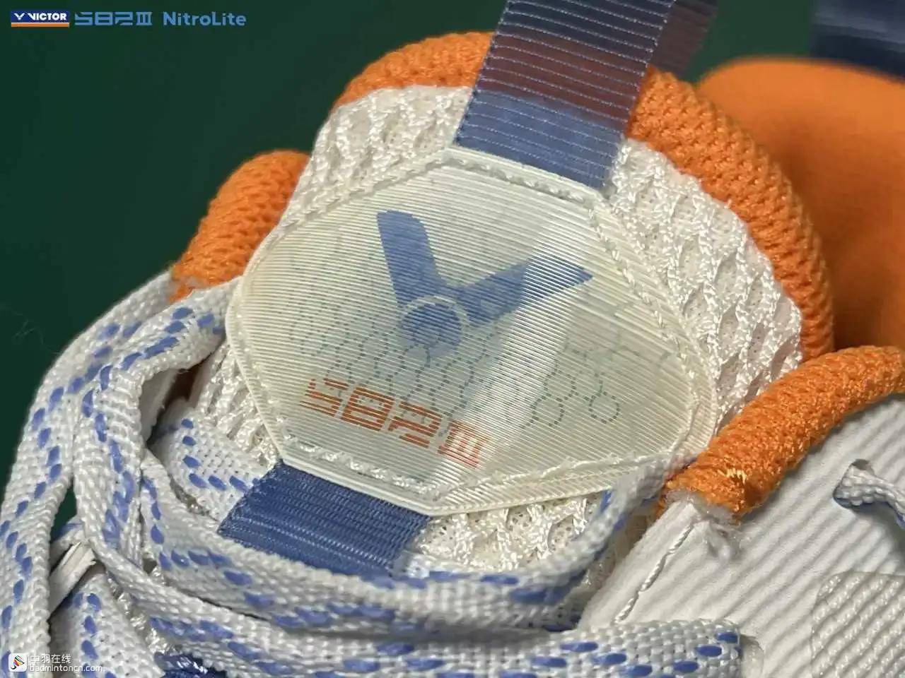 在鞋舌的上端,表面做了光栅处理和白色TPU片同样是延续了S82 Ⅲ的设计,随着视角的改变,光栅表面会轮流呈现出橙色的“S82 Ⅲ”和“NitroLite”字样,上方蓝色的威克多LOGO不断闪动着,背景则依次浮现出两种不同大小的分子状圆圈图案,暗示着球鞋的主打科技——超临界氮气发泡科技。