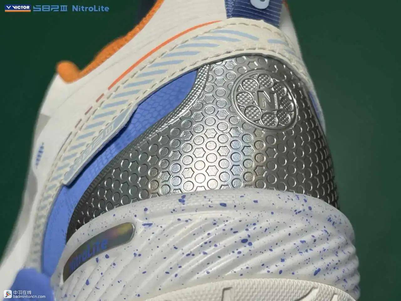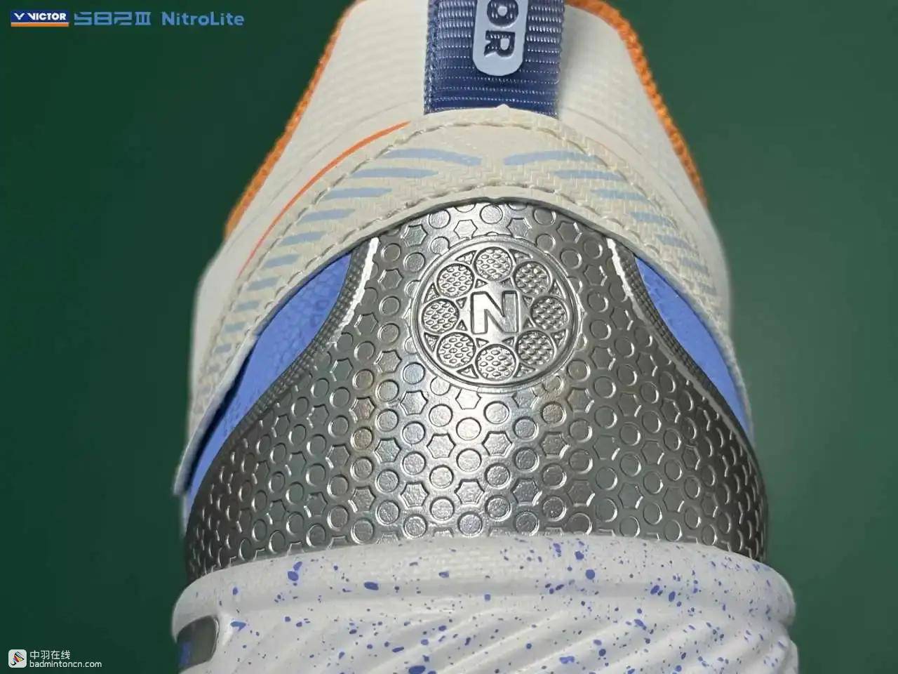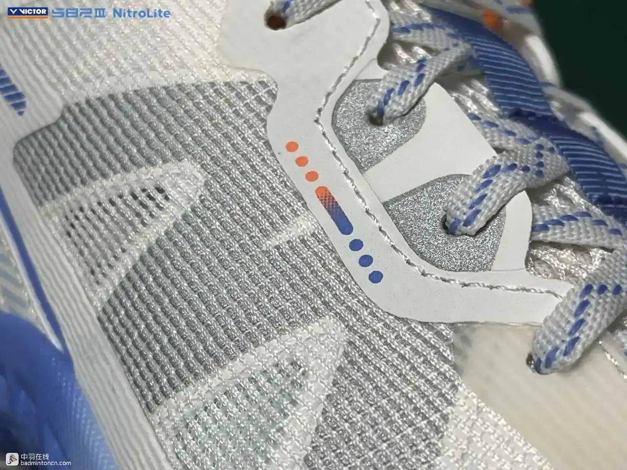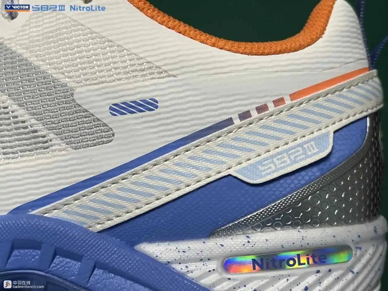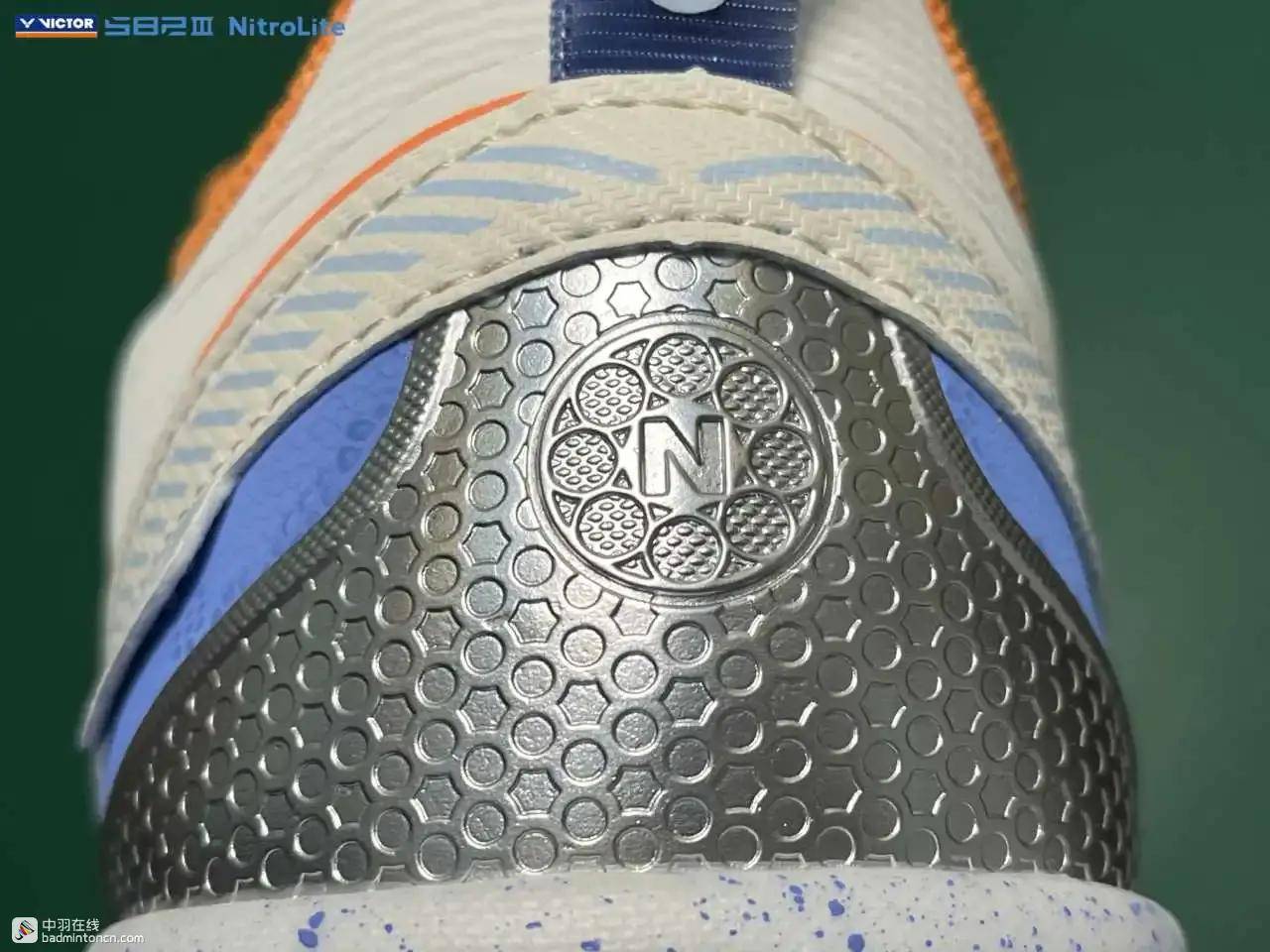 在鞋舌的上端,表面做了光栅处理和白色TPU片同样是延续了S82 Ⅲ的设计,随着视角的改变,光栅表面会轮流呈现出橙色的“S82 Ⅲ”和“NitroLite”字样,上方蓝色的威克多LOGO不断闪动着,背景则依次浮现出两种不同大小的分子状圆圈图案,暗示着球鞋的主打科技——超临界氮气发泡科技。