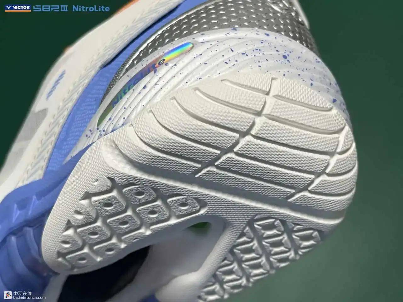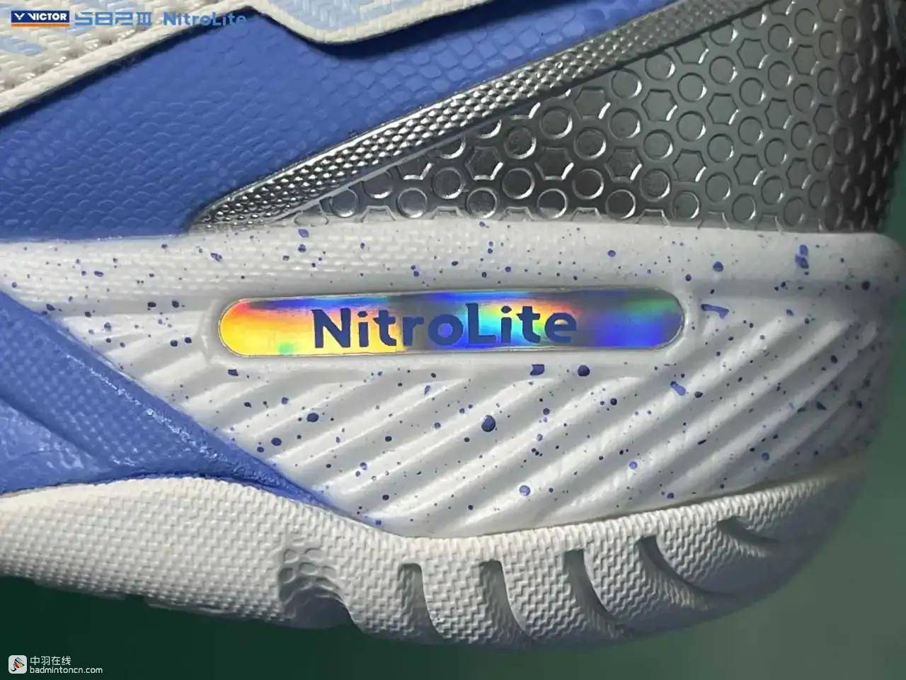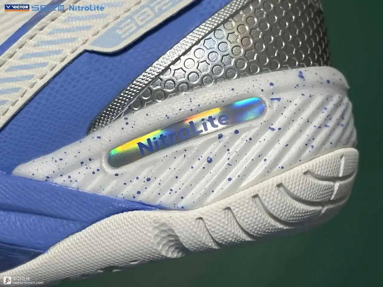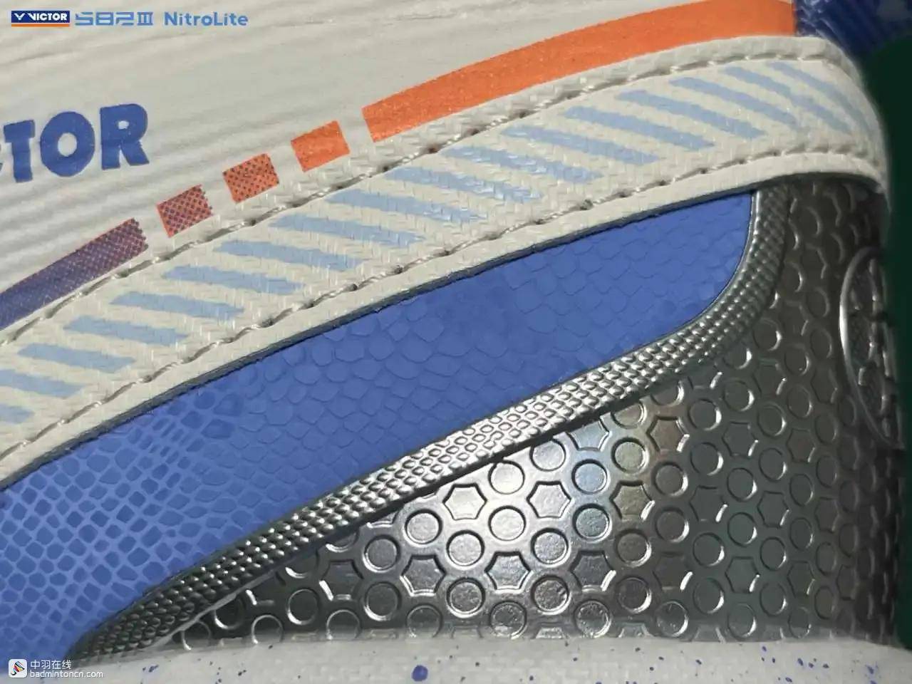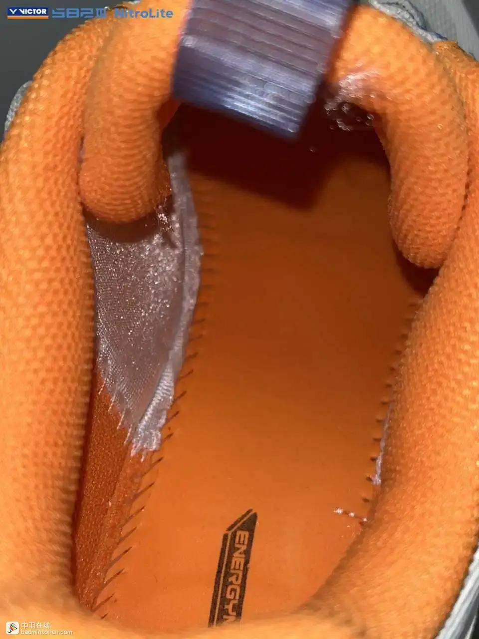 在鞋舌的上端,表面做了光栅处理和白色TPU片同样是延续了S82 Ⅲ的设计,随着视角的改变,光栅表面会轮流呈现出橙色的“S82 Ⅲ”和“NitroLite”字样,上方蓝色的威克多LOGO不断闪动着,背景则依次浮现出两种不同大小的分子状圆圈图案,暗示着球鞋的主打科技——超临界氮气发泡科技。