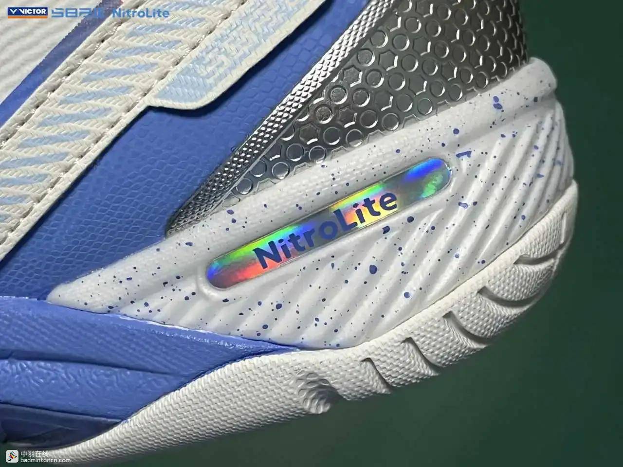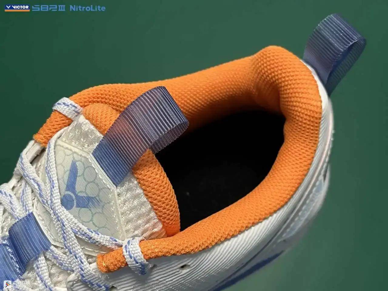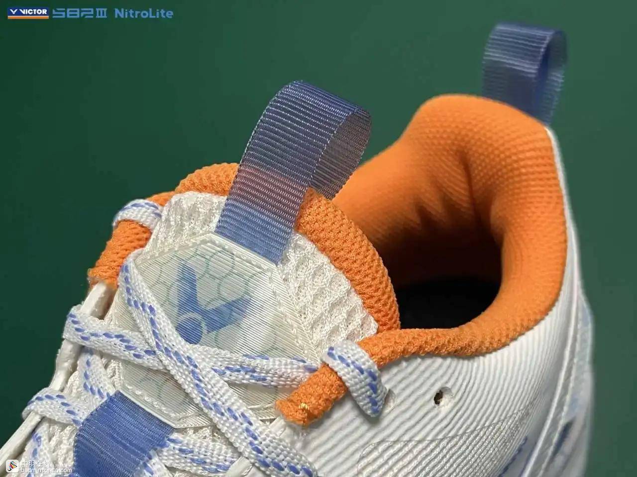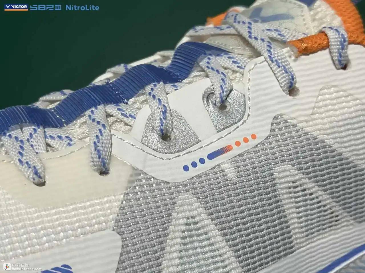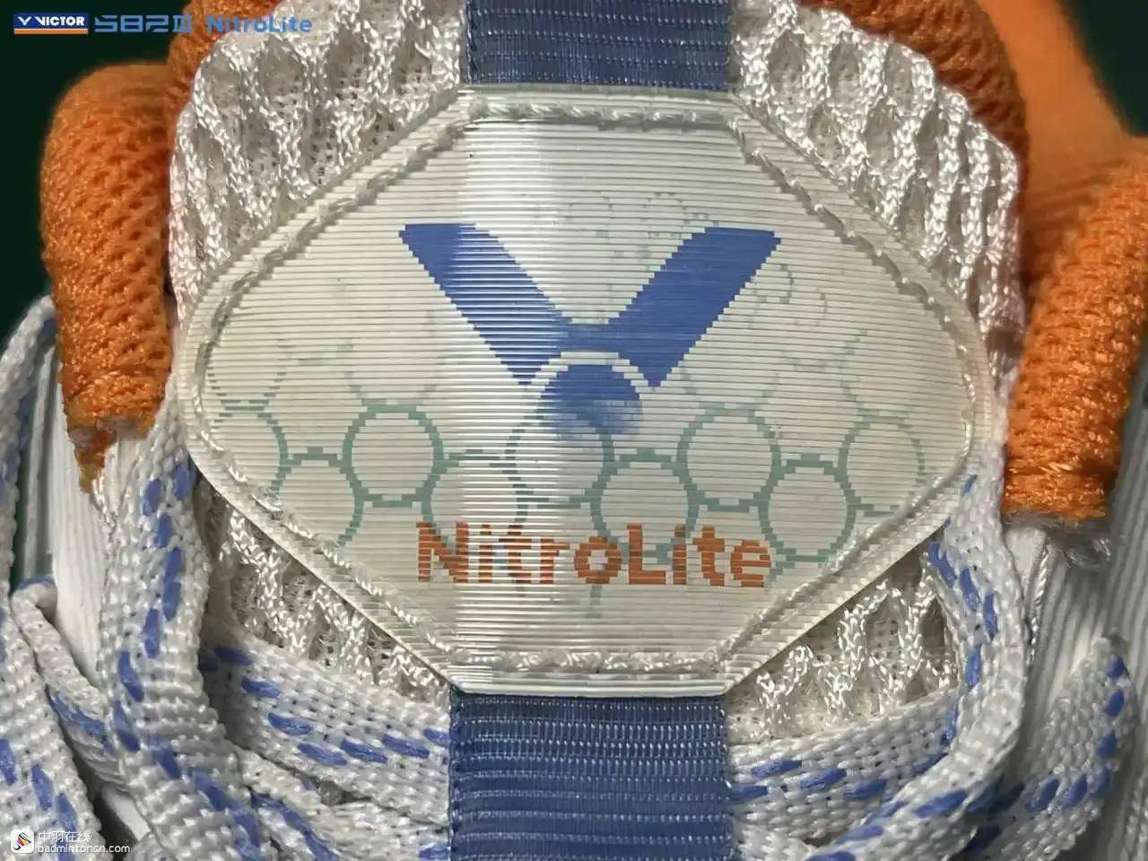 在鞋舌的上端,表面做了光栅处理和白色TPU片同样是延续了S82 Ⅲ的设计,随着视角的改变,光栅表面会轮流呈现出橙色的“S82 Ⅲ”和“NitroLite”字样,上方蓝色的威克多LOGO不断闪动着,背景则依次浮现出两种不同大小的分子状圆圈图案,暗示着球鞋的主打科技——超临界氮气发泡科技。