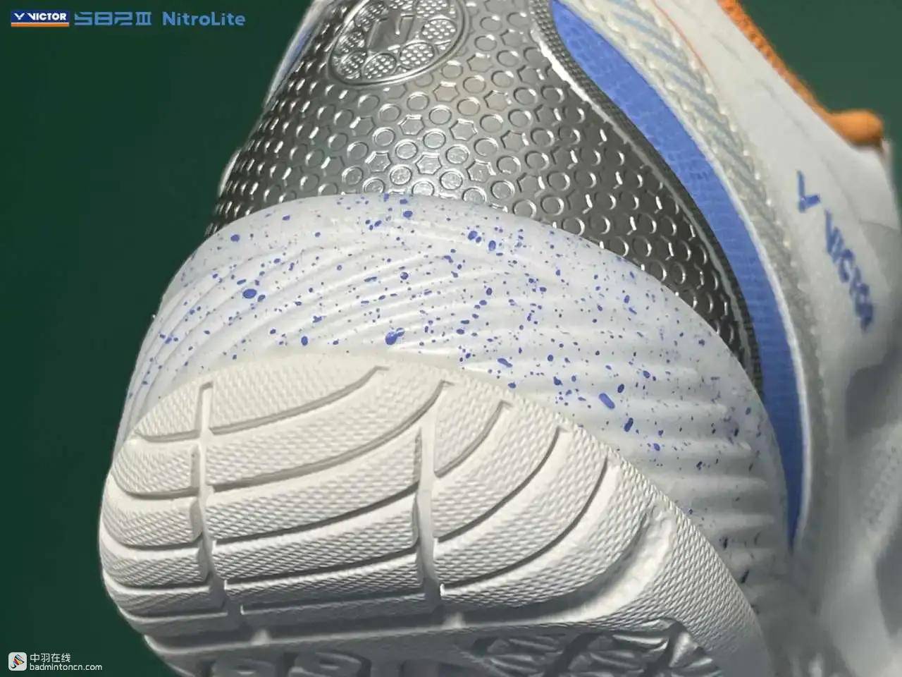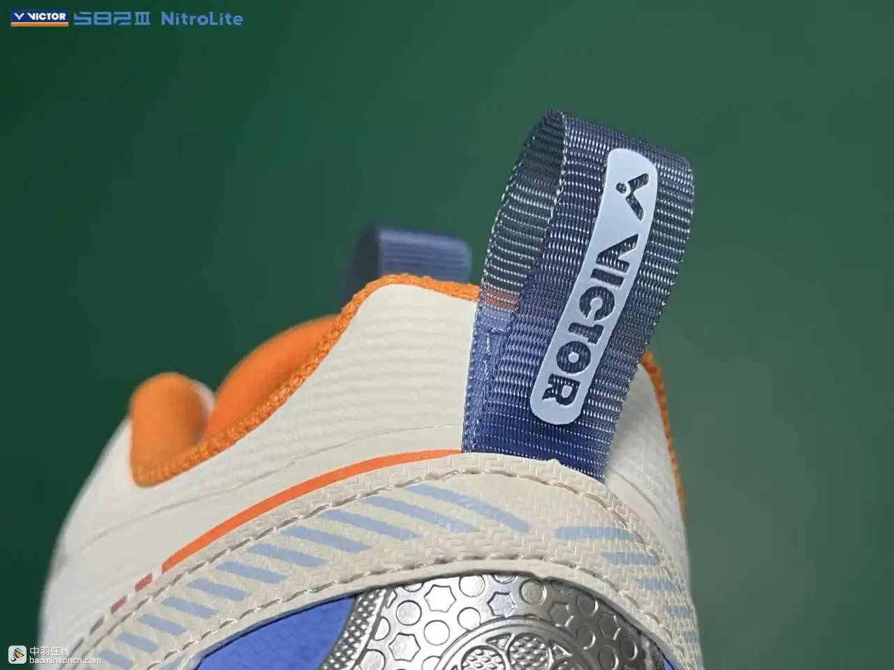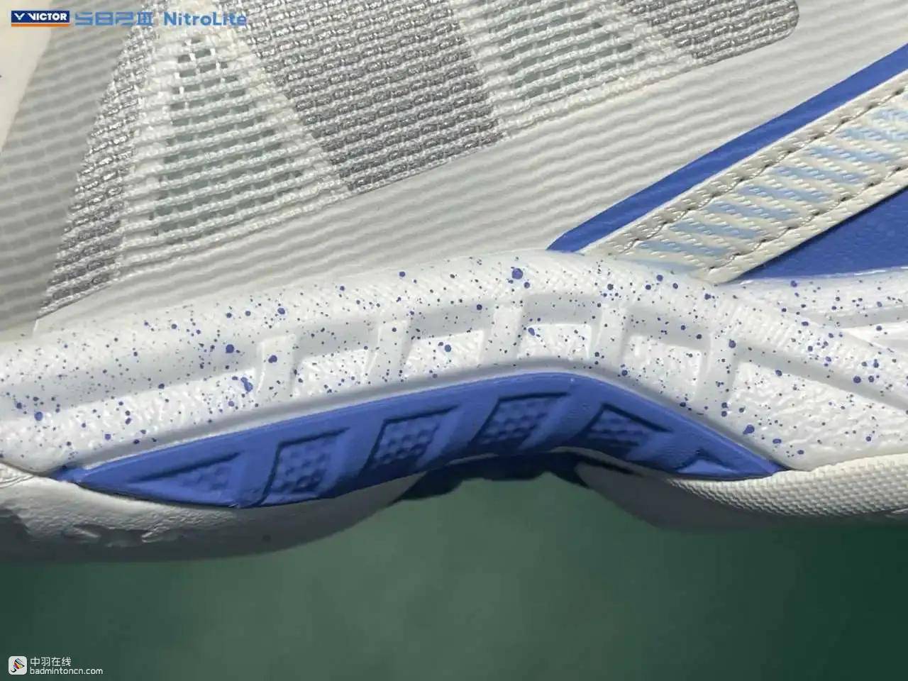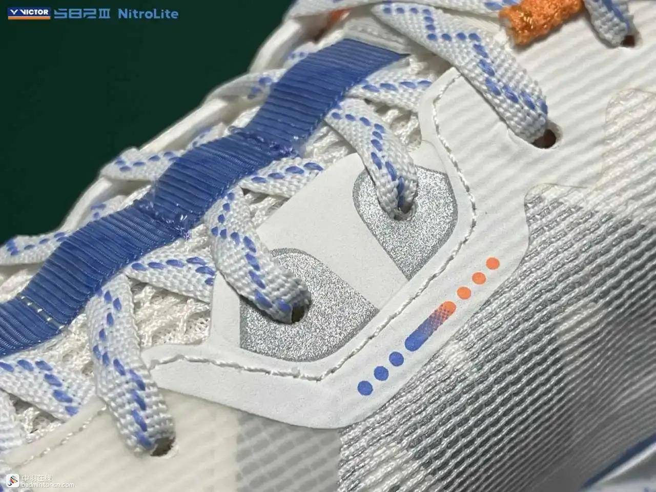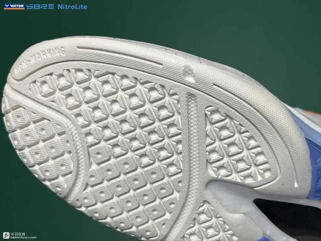 在鞋舌的上端,表面做了光栅处理和白色TPU片同样是延续了S82 Ⅲ的设计,随着视角的改变,光栅表面会轮流呈现出橙色的“S82 Ⅲ”和“NitroLite”字样,上方蓝色的威克多LOGO不断闪动着,背景则依次浮现出两种不同大小的分子状圆圈图案,暗示着球鞋的主打科技——超临界氮气发泡科技。