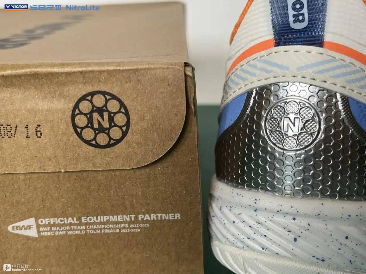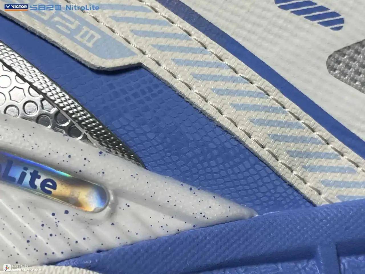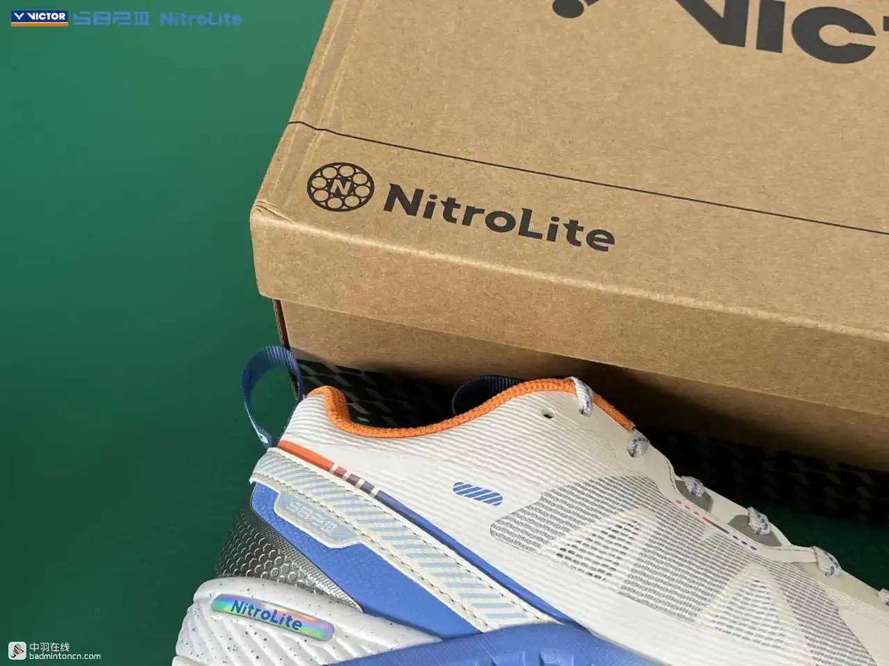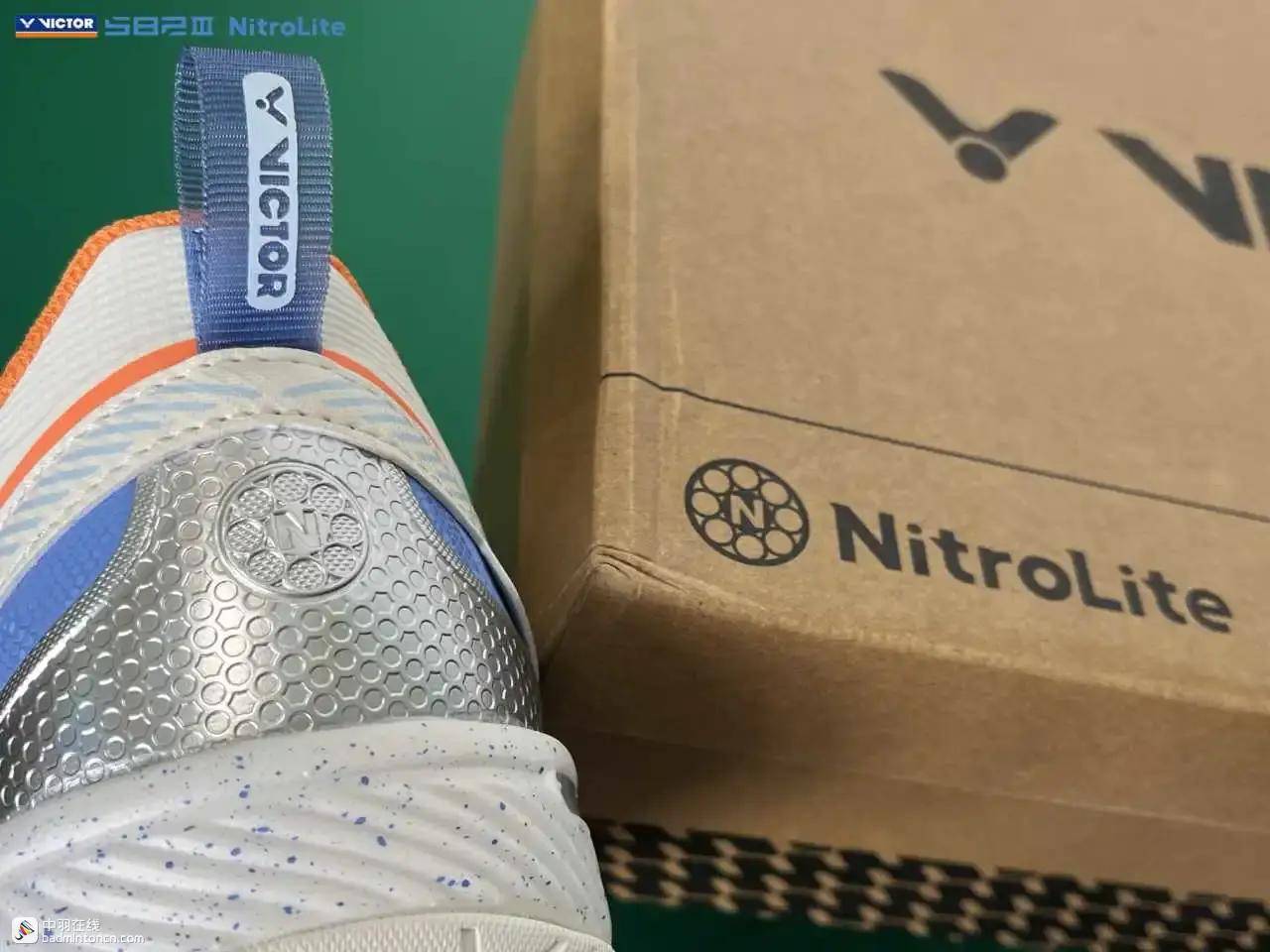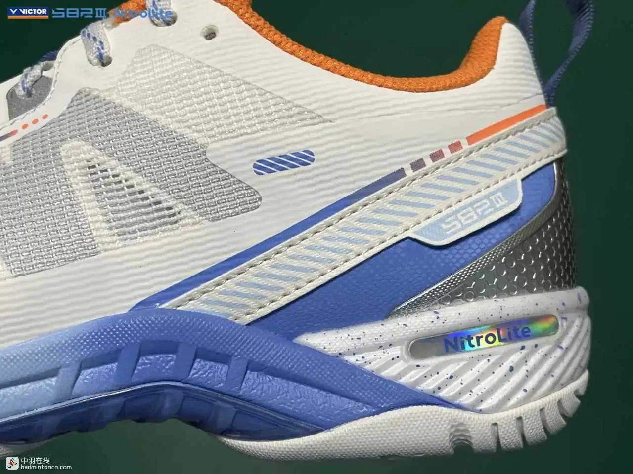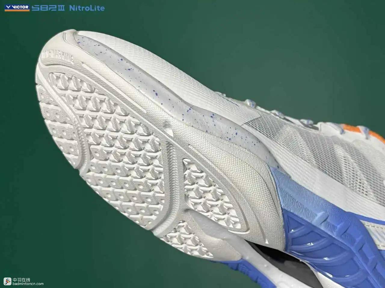 在鞋舌的上端,表面做了光栅处理和白色TPU片同样是延续了S82 Ⅲ的设计,随着视角的改变,光栅表面会轮流呈现出橙色的“S82 Ⅲ”和“NitroLite”字样,上方蓝色的威克多LOGO不断闪动着,背景则依次浮现出两种不同大小的分子状圆圈图案,暗示着球鞋的主打科技——超临界氮气发泡科技。
