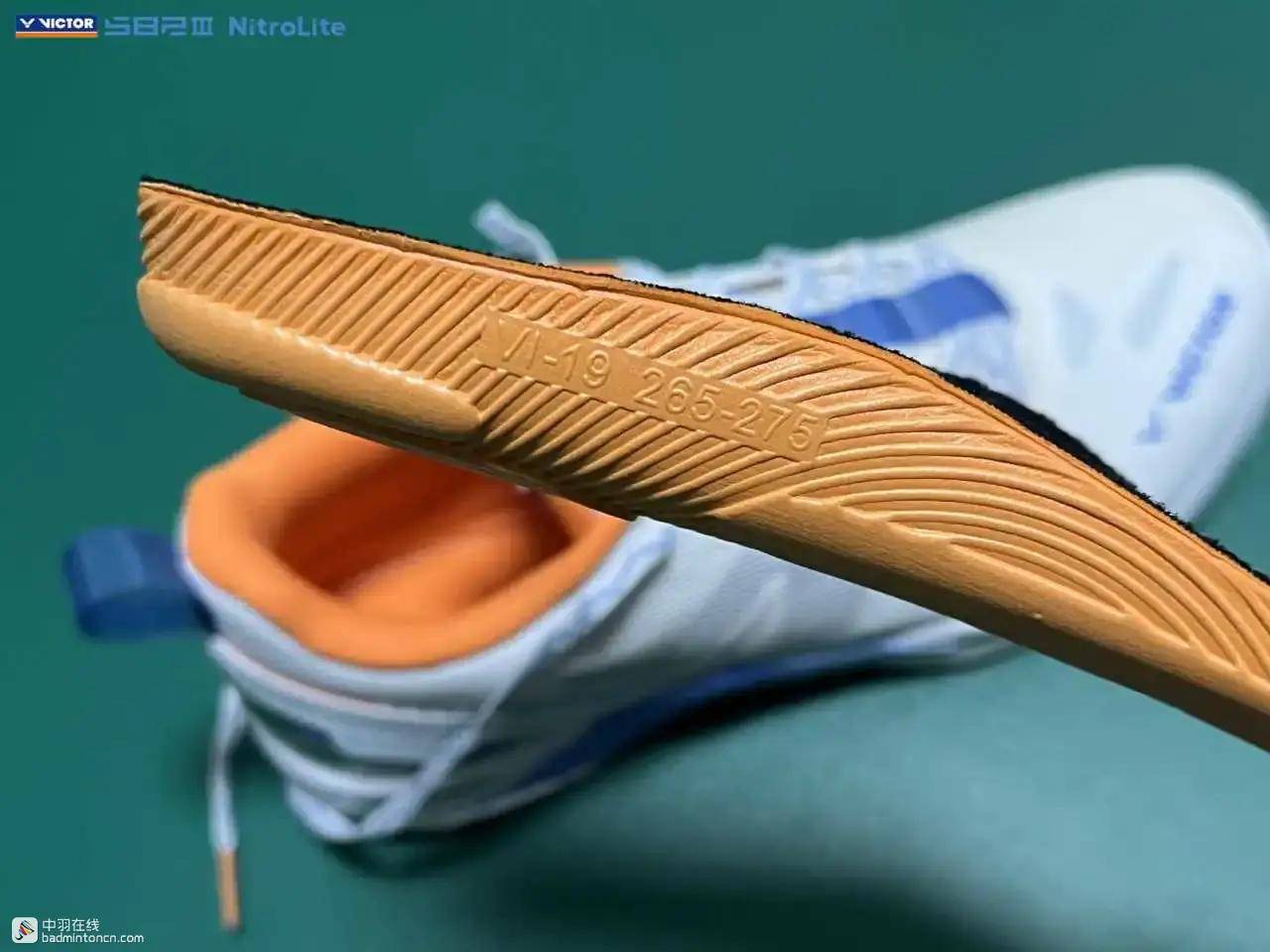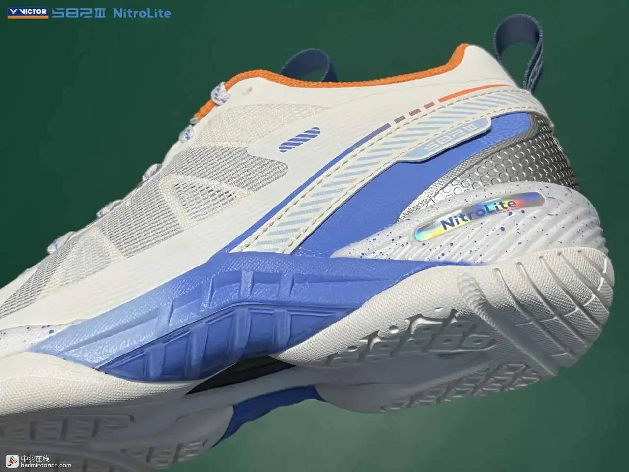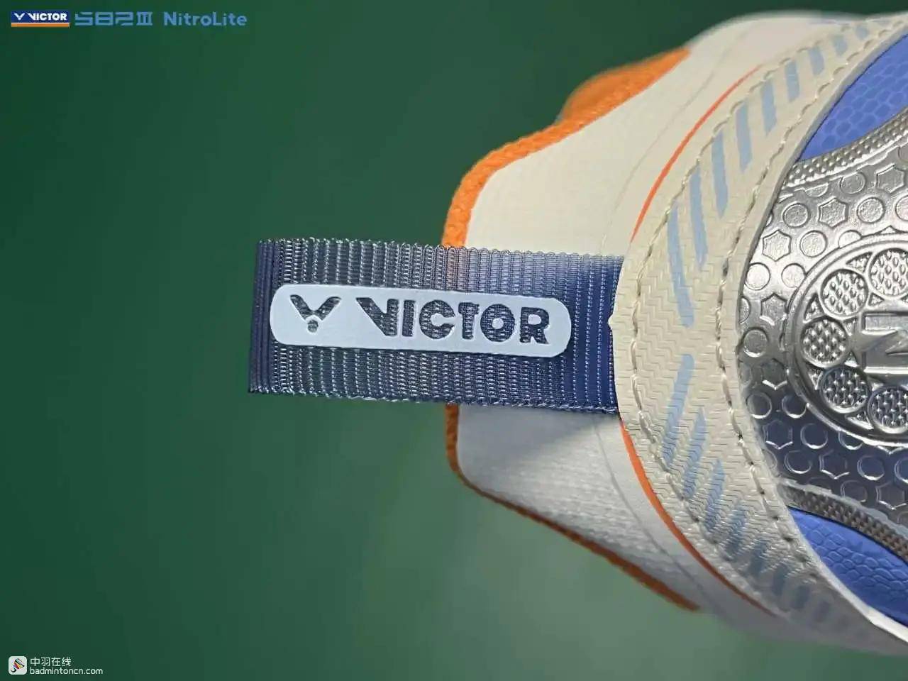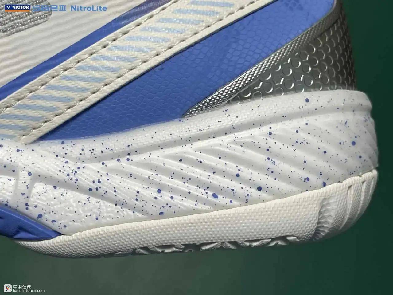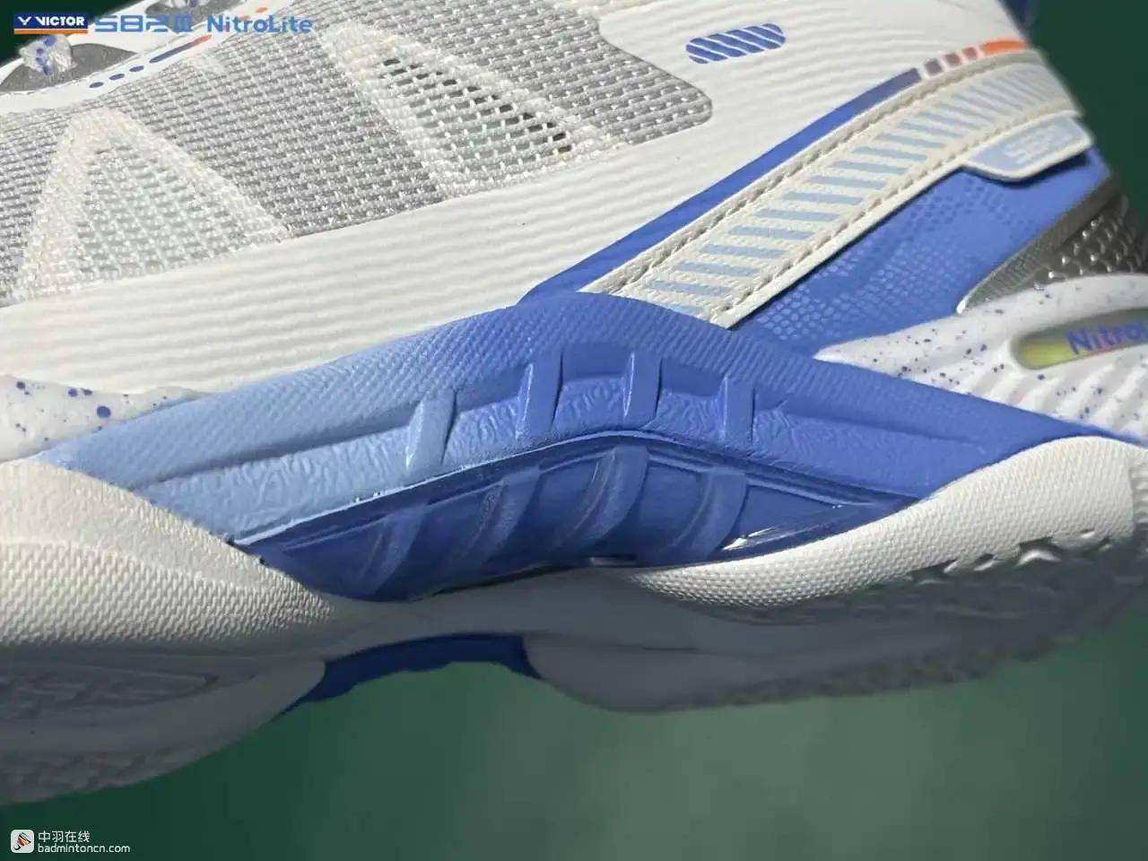 在鞋舌的上端,表面做了光栅处理和白色TPU片同样是延续了S82 Ⅲ的设计,随着视角的改变,光栅表面会轮流呈现出橙色的“S82 Ⅲ”和“NitroLite”字样,上方蓝色的威克多LOGO不断闪动着,背景则依次浮现出两种不同大小的分子状圆圈图案,暗示着球鞋的主打科技——超临界氮气发泡科技。