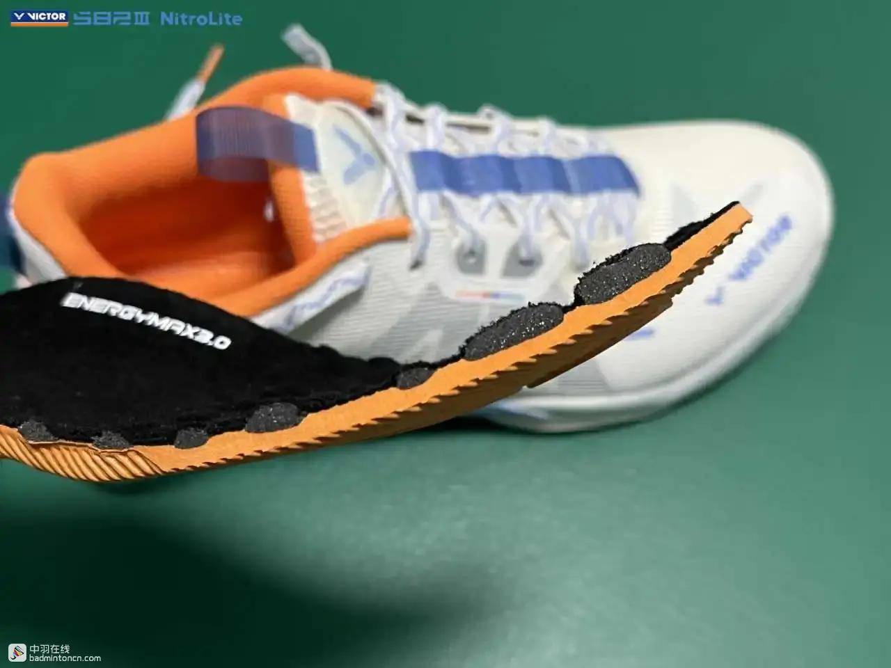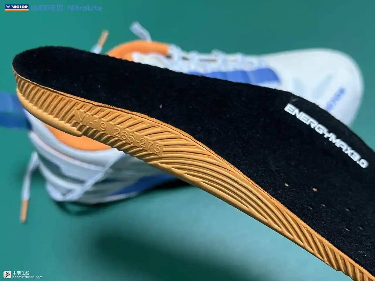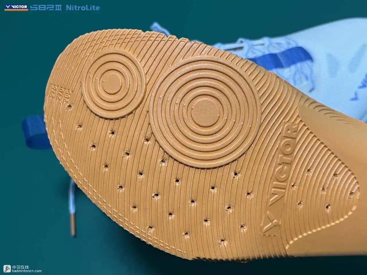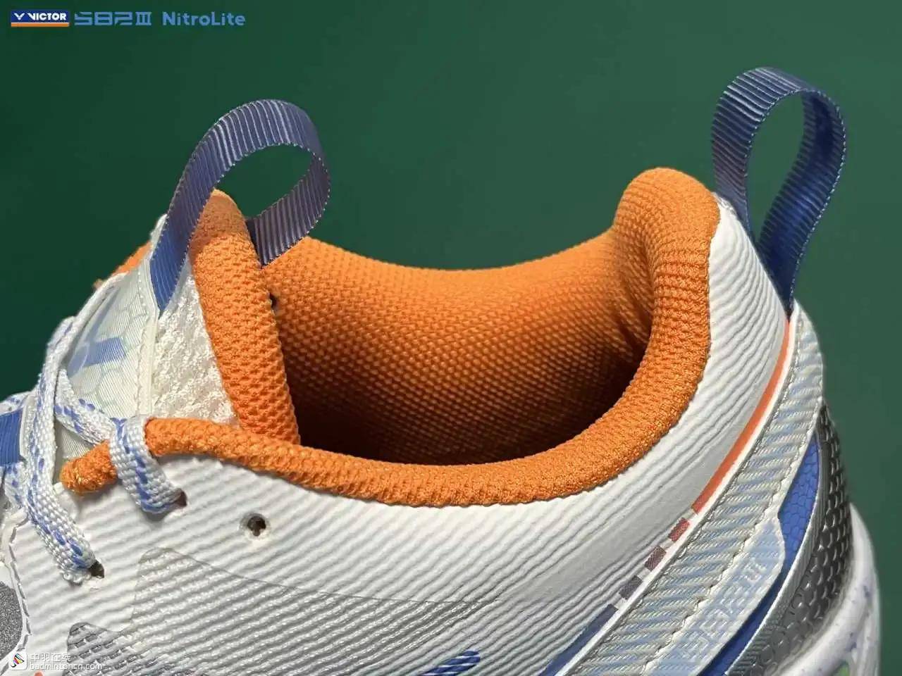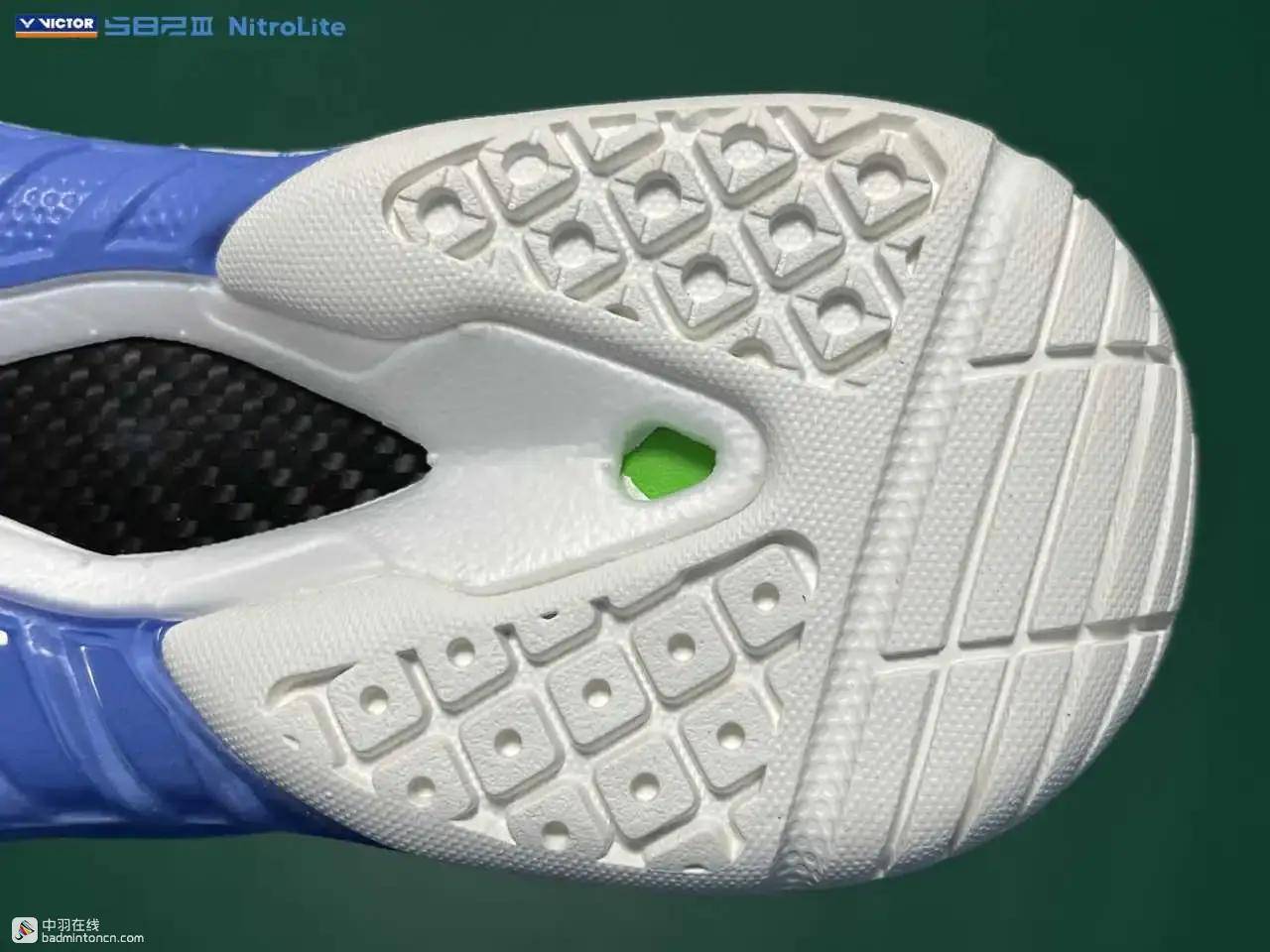 在鞋舌的上端,表面做了光栅处理和白色TPU片同样是延续了S82 Ⅲ的设计,随着视角的改变,光栅表面会轮流呈现出橙色的“S82 Ⅲ”和“NitroLite”字样,上方蓝色的威克多LOGO不断闪动着,背景则依次浮现出两种不同大小的分子状圆圈图案,暗示着球鞋的主打科技——超临界氮气发泡科技。