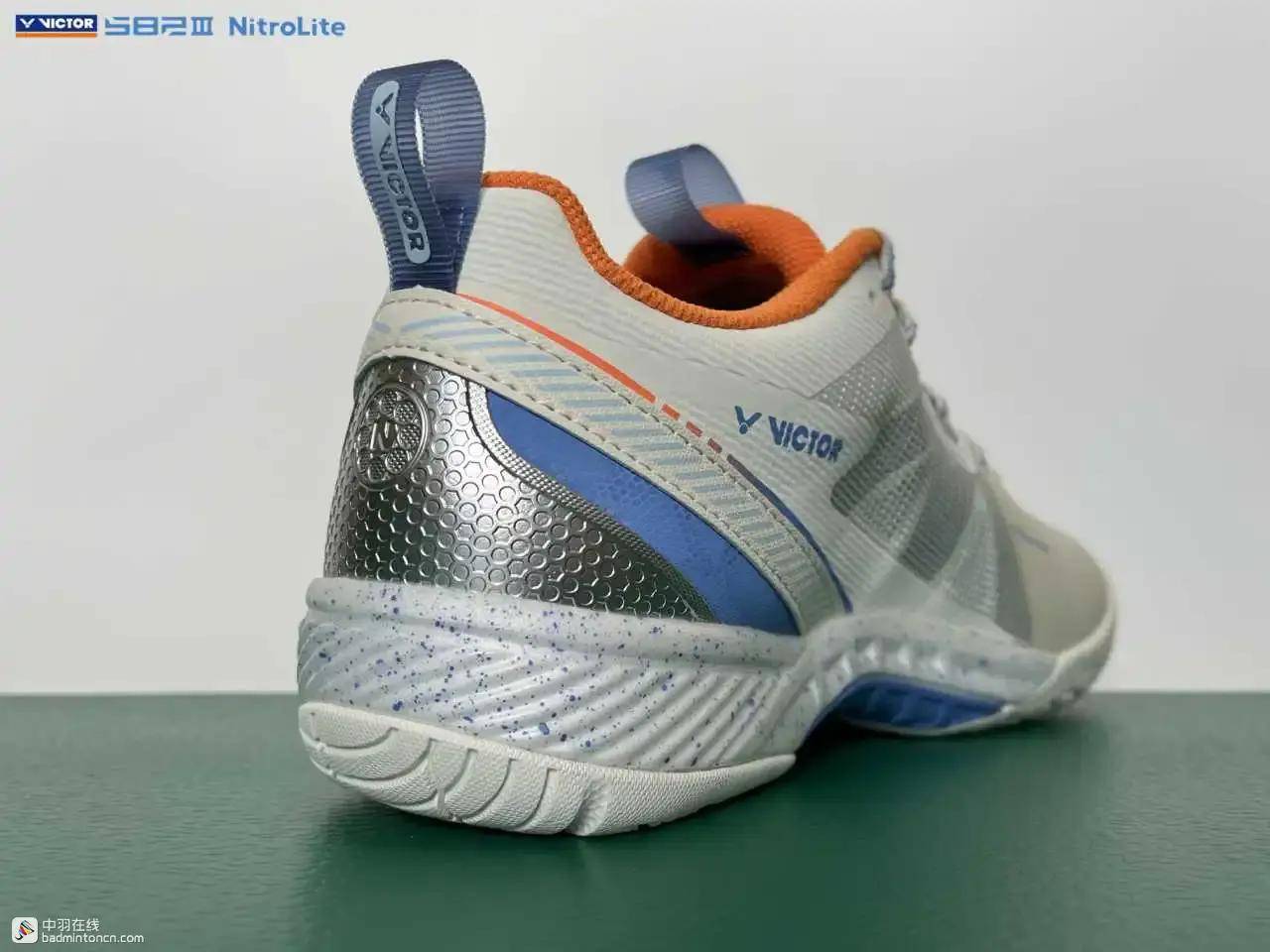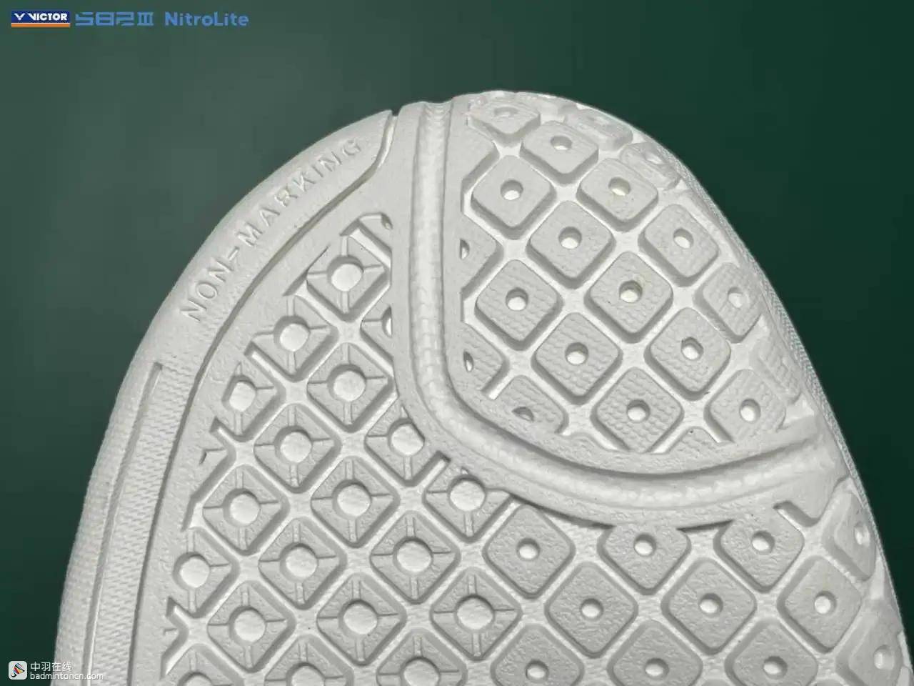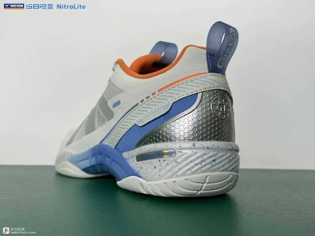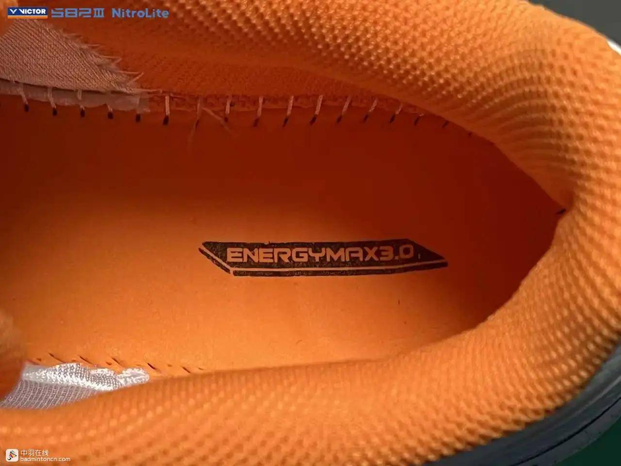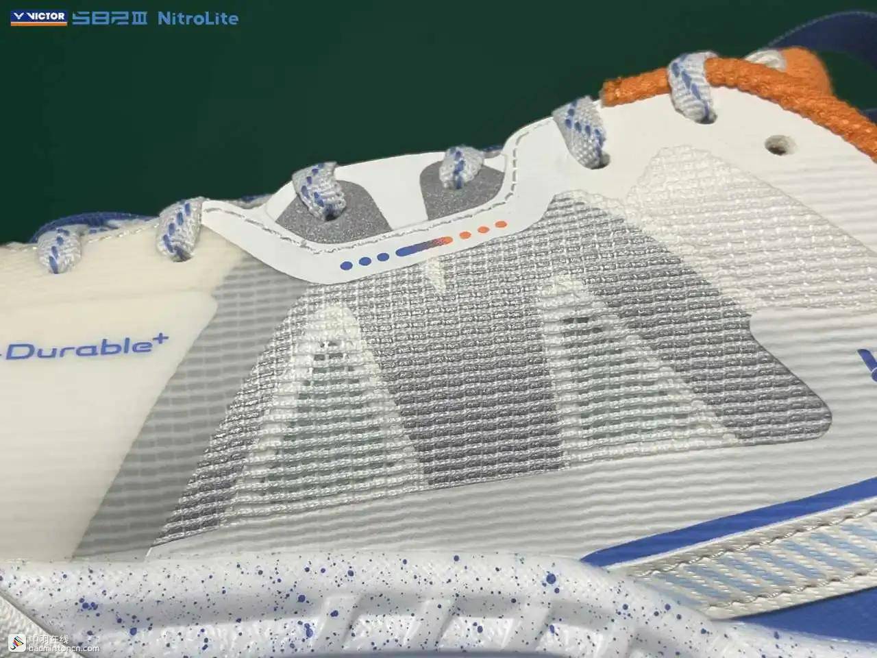 在鞋舌的上端,表面做了光栅处理和白色TPU片同样是延续了S82 Ⅲ的设计,随着视角的改变,光栅表面会轮流呈现出橙色的“S82 Ⅲ”和“NitroLite”字样,上方蓝色的威克多LOGO不断闪动着,背景则依次浮现出两种不同大小的分子状圆圈图案,暗示着球鞋的主打科技——超临界氮气发泡科技。