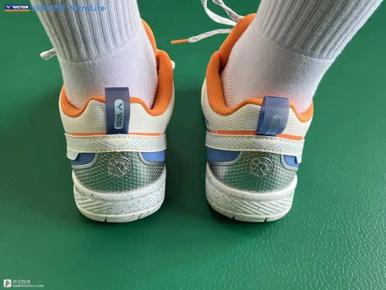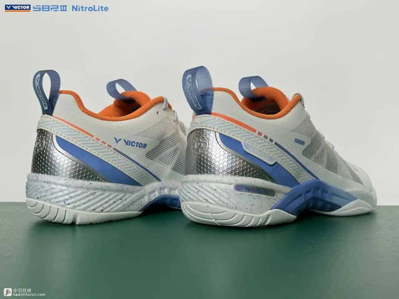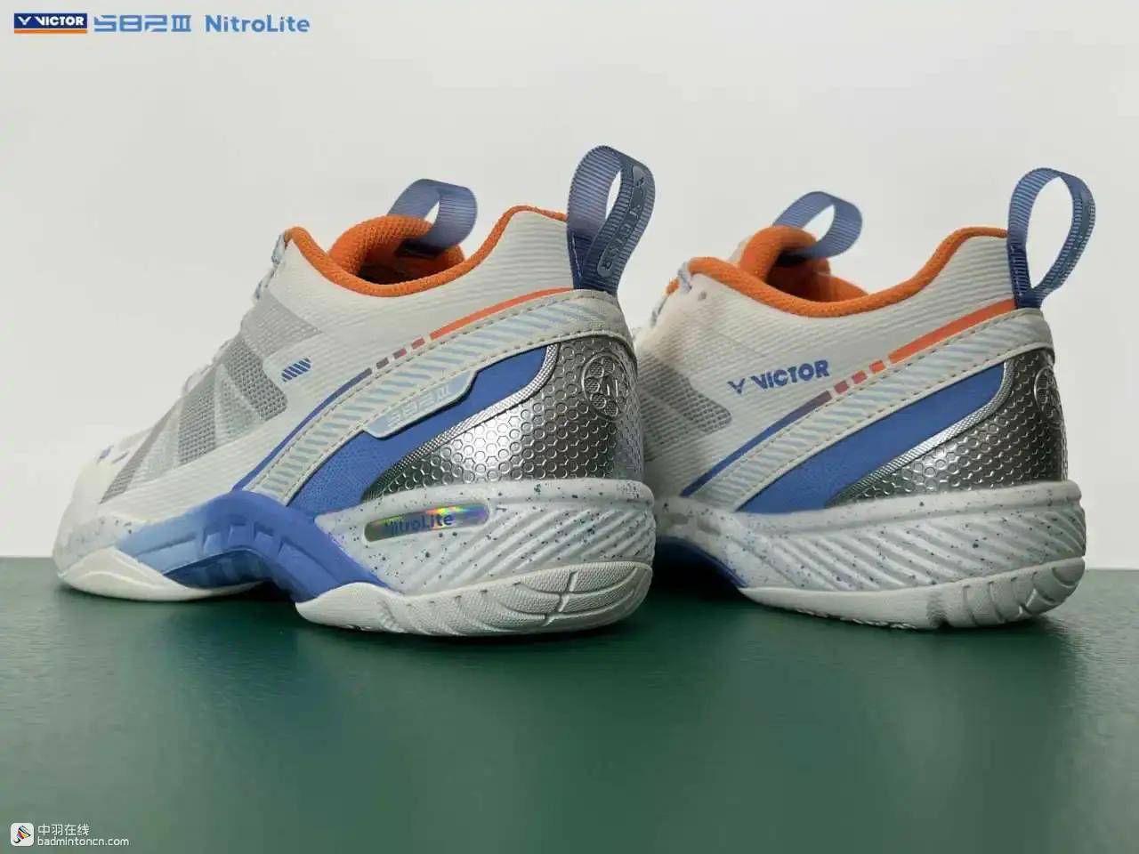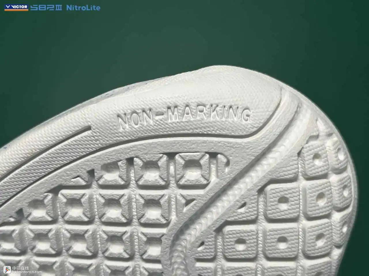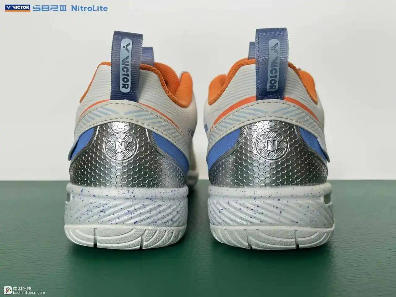 在鞋舌的上端,表面做了光栅处理和白色TPU片同样是延续了S82 Ⅲ的设计,随着视角的改变,光栅表面会轮流呈现出橙色的“S82 Ⅲ”和“NitroLite”字样,上方蓝色的威克多LOGO不断闪动着,背景则依次浮现出两种不同大小的分子状圆圈图案,暗示着球鞋的主打科技——超临界氮气发泡科技。