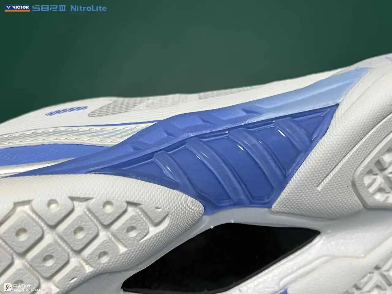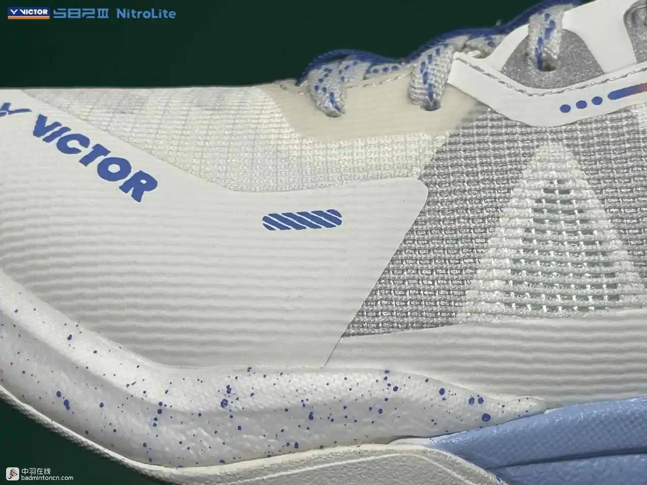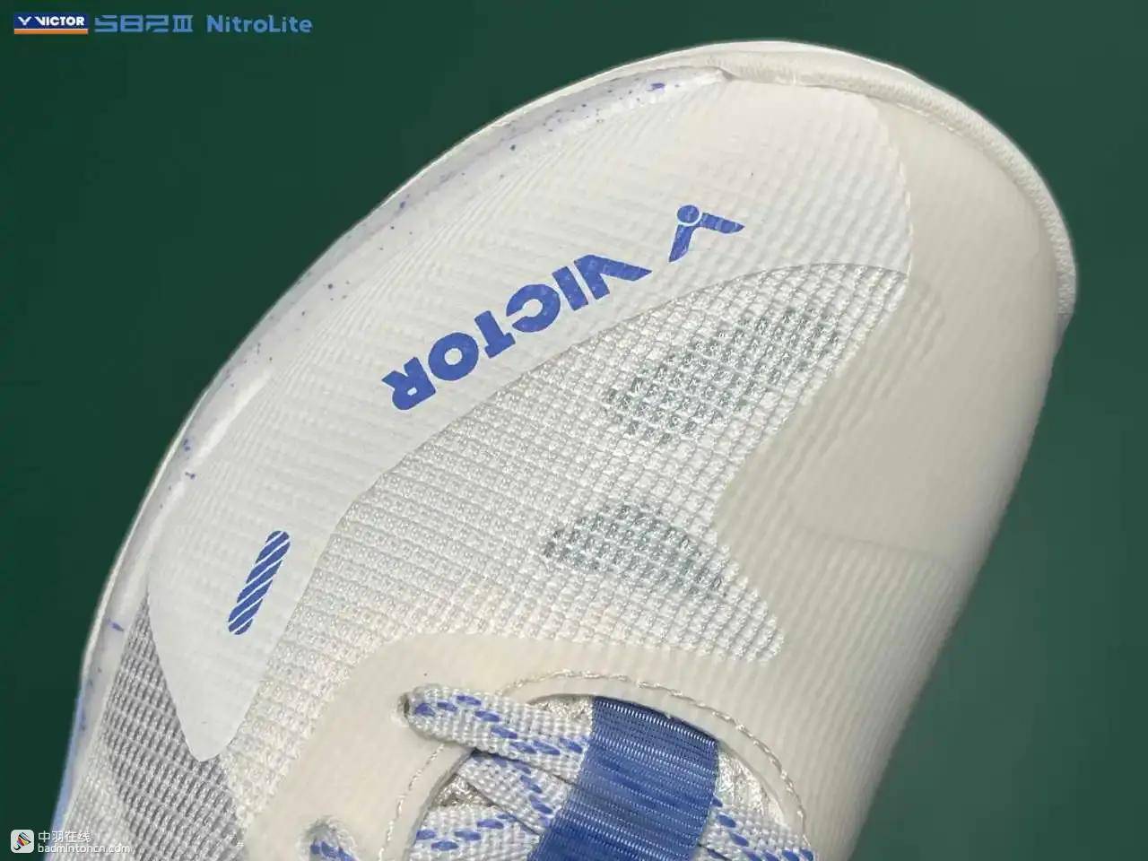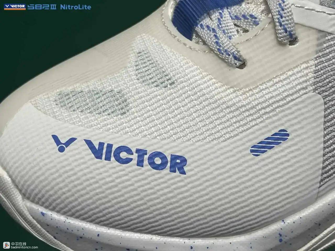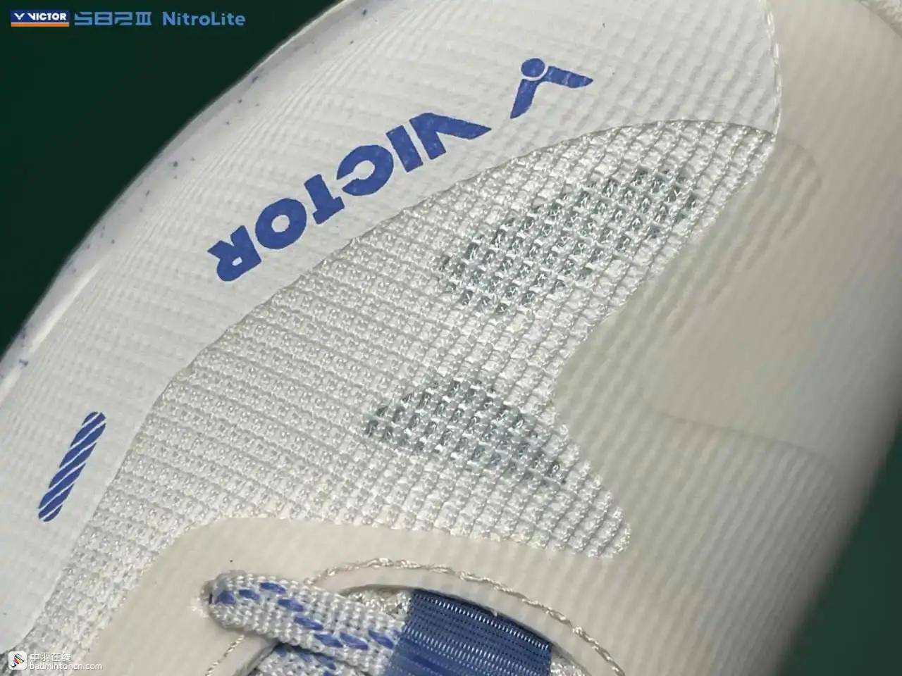 在鞋头外侧的白色TPU薄膜上,蓝色的威克多LOGO和品牌名称、以及蓝色斜条纹图案非常醒目,和S82 Ⅲ的设计相同。
