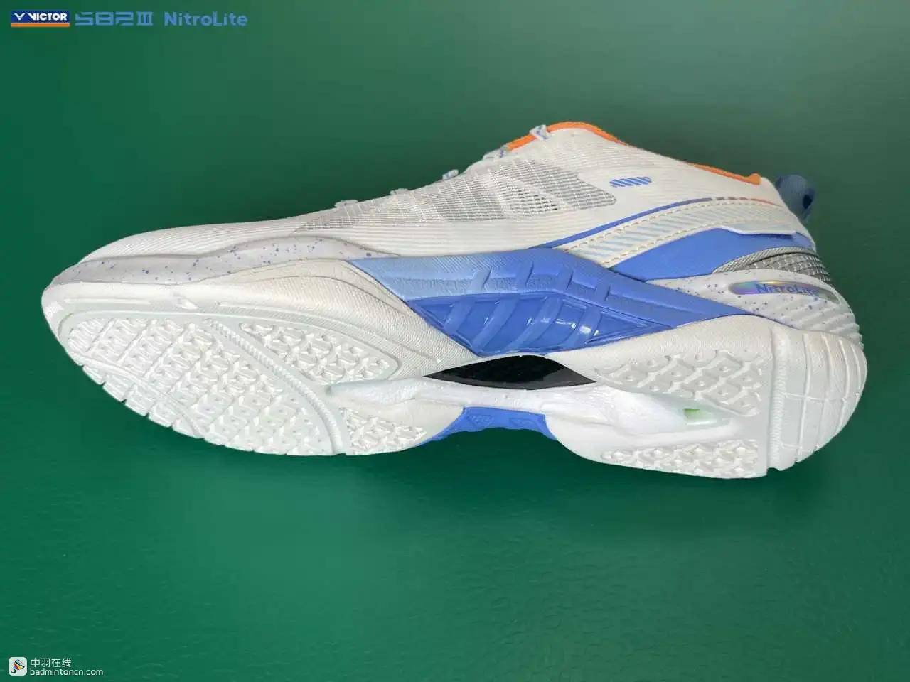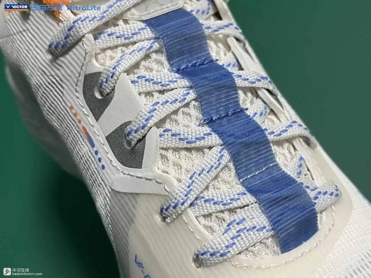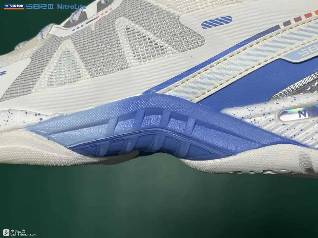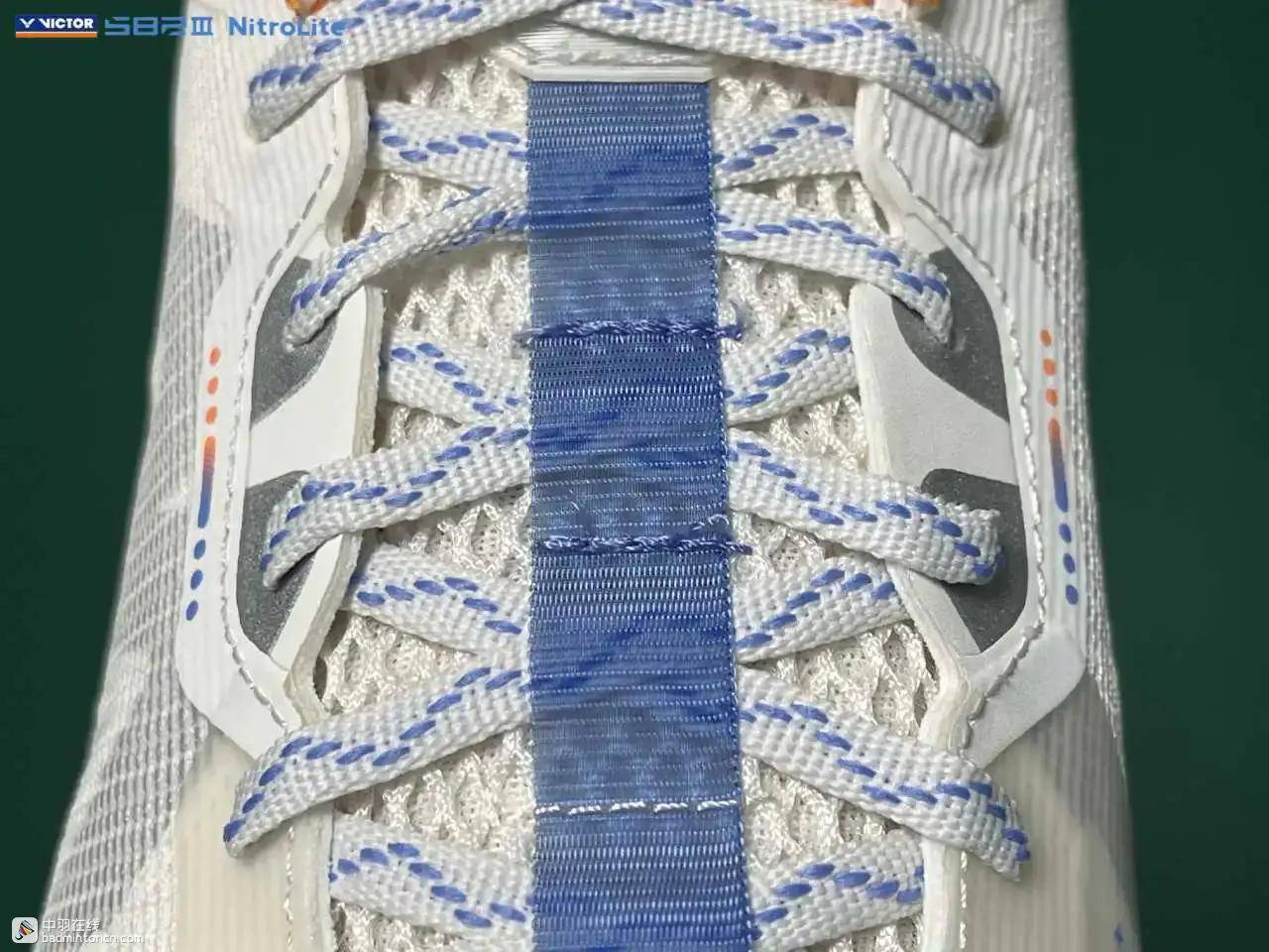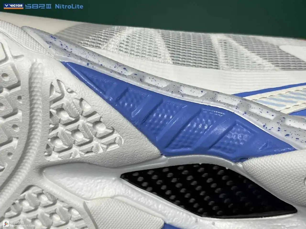 在鞋头外侧的白色TPU薄膜上,蓝色的威克多LOGO和品牌名称、以及蓝色斜条纹图案非常醒目,和S82 Ⅲ的设计相同。