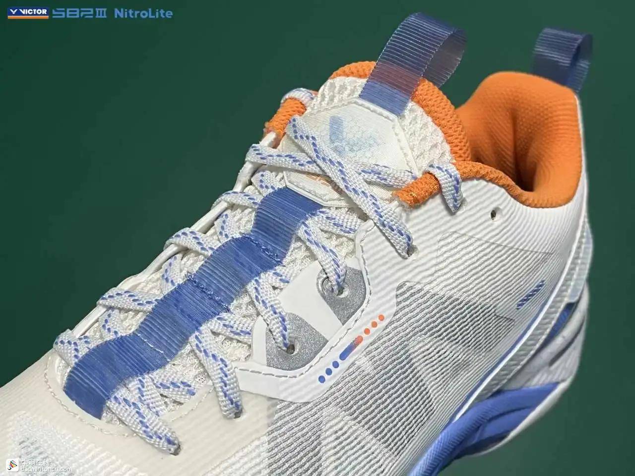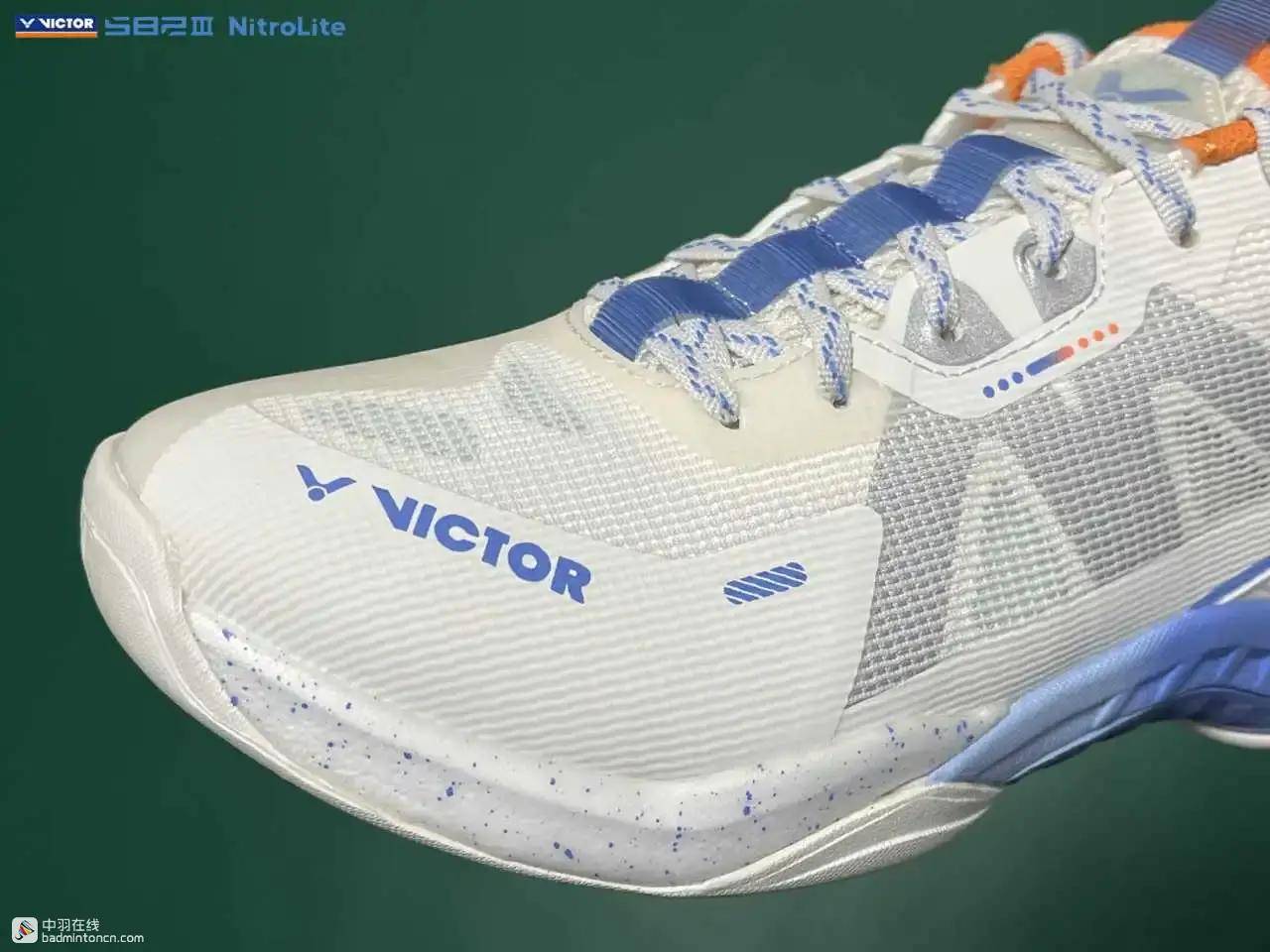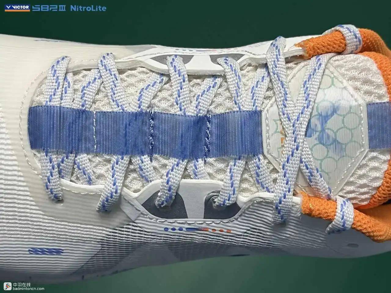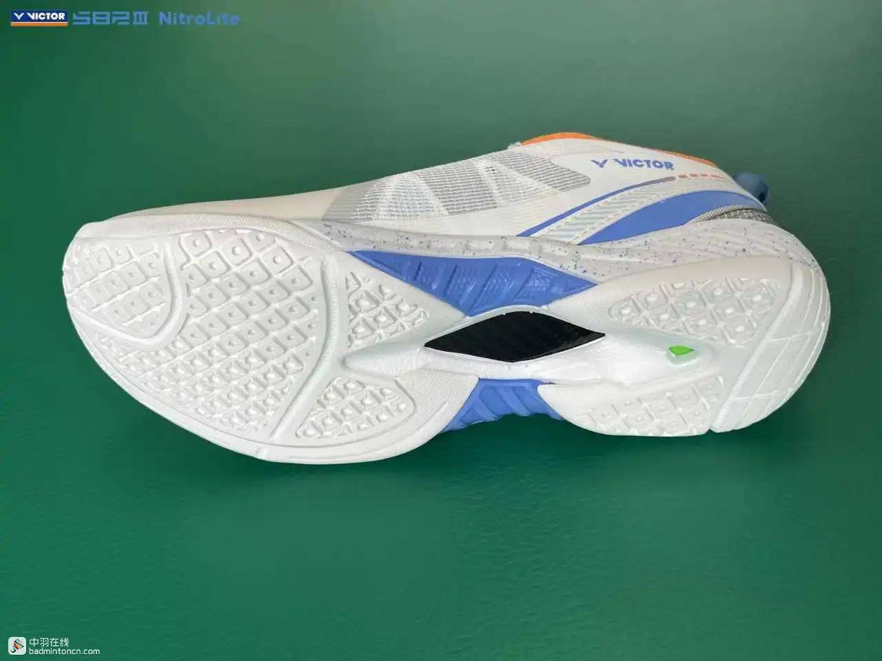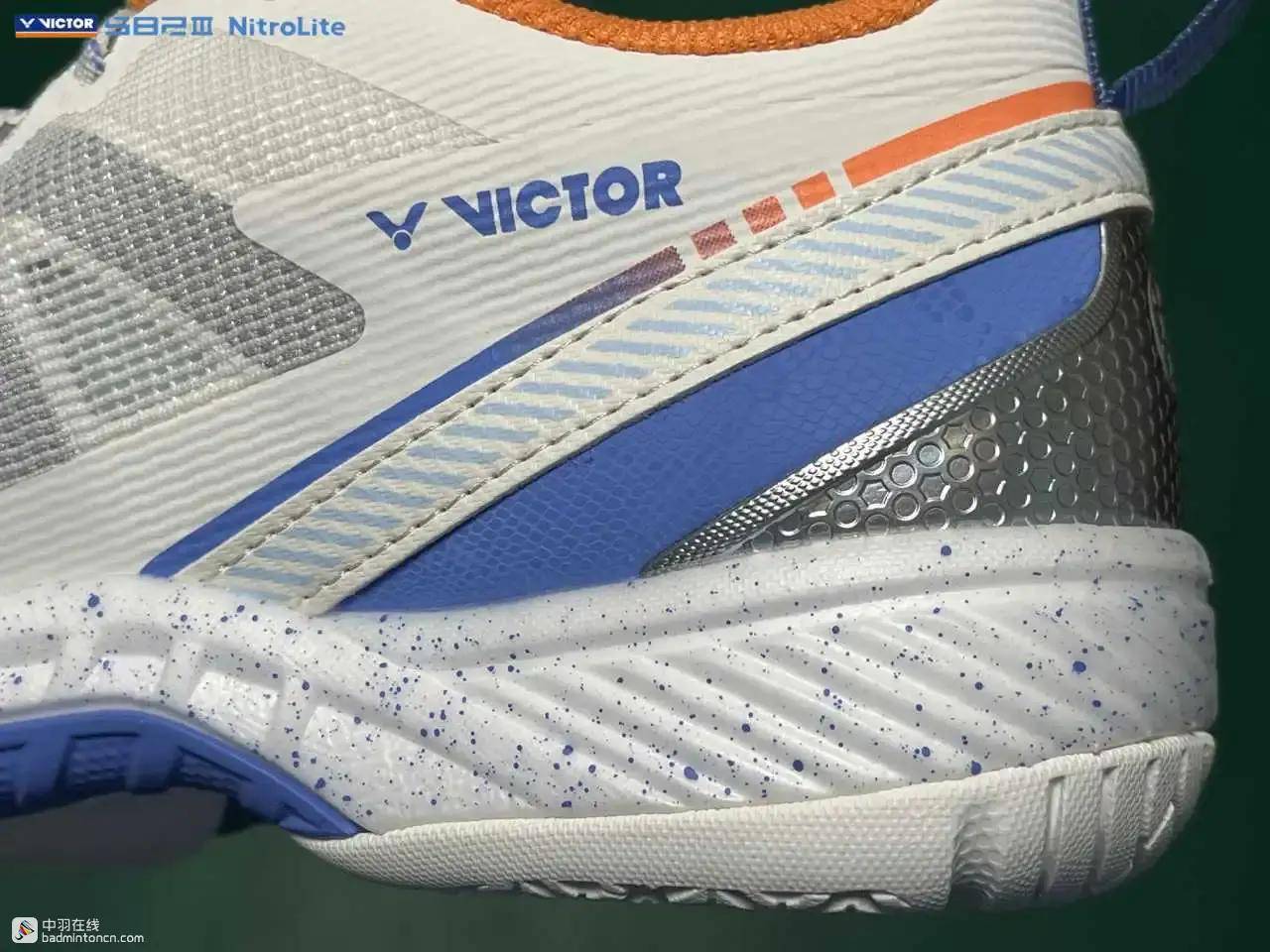 在鞋头外侧的白色TPU薄膜上,蓝色的威克多LOGO和品牌名称、以及蓝色斜条纹图案非常醒目,和S82 Ⅲ的设计相同。