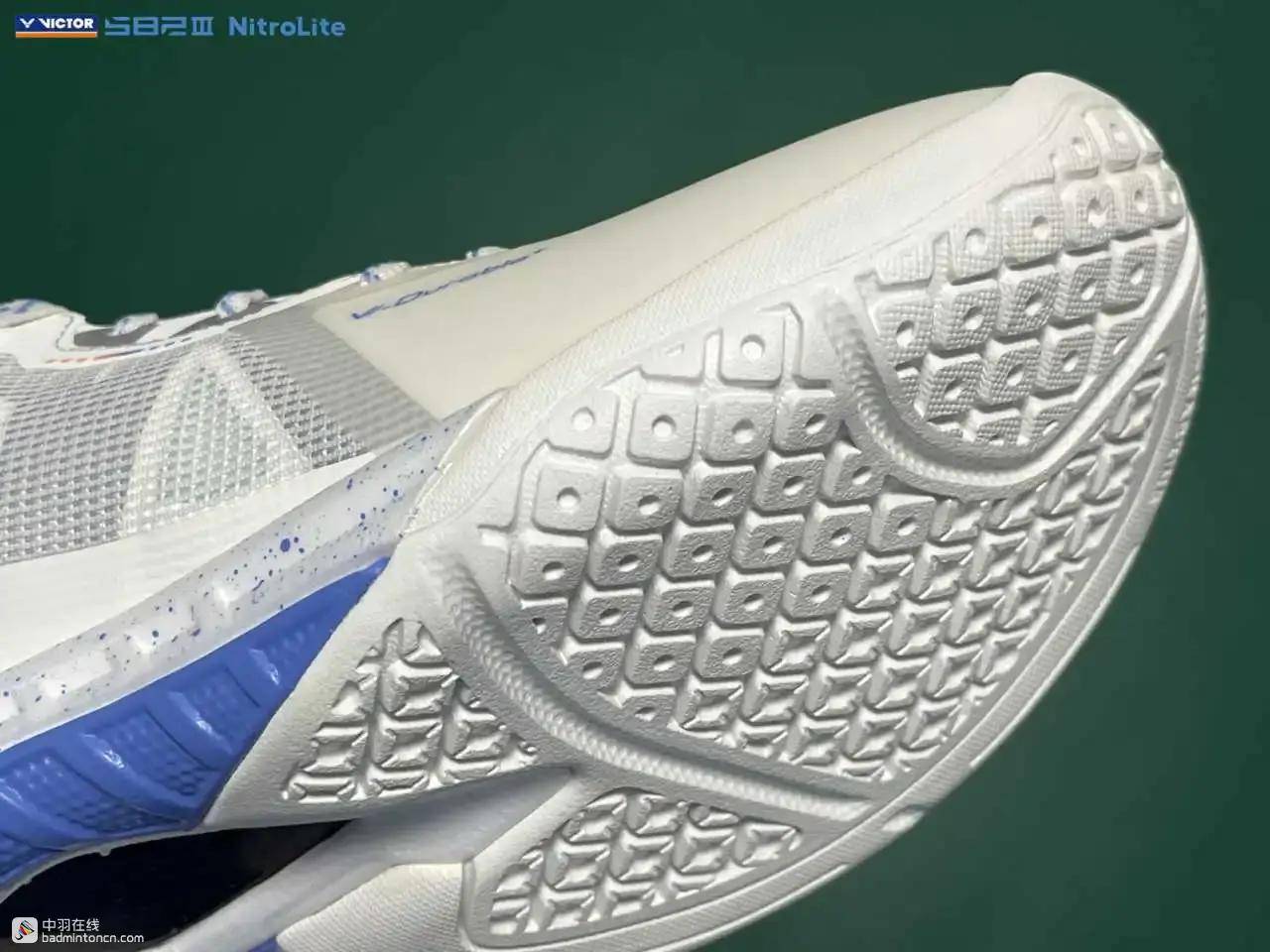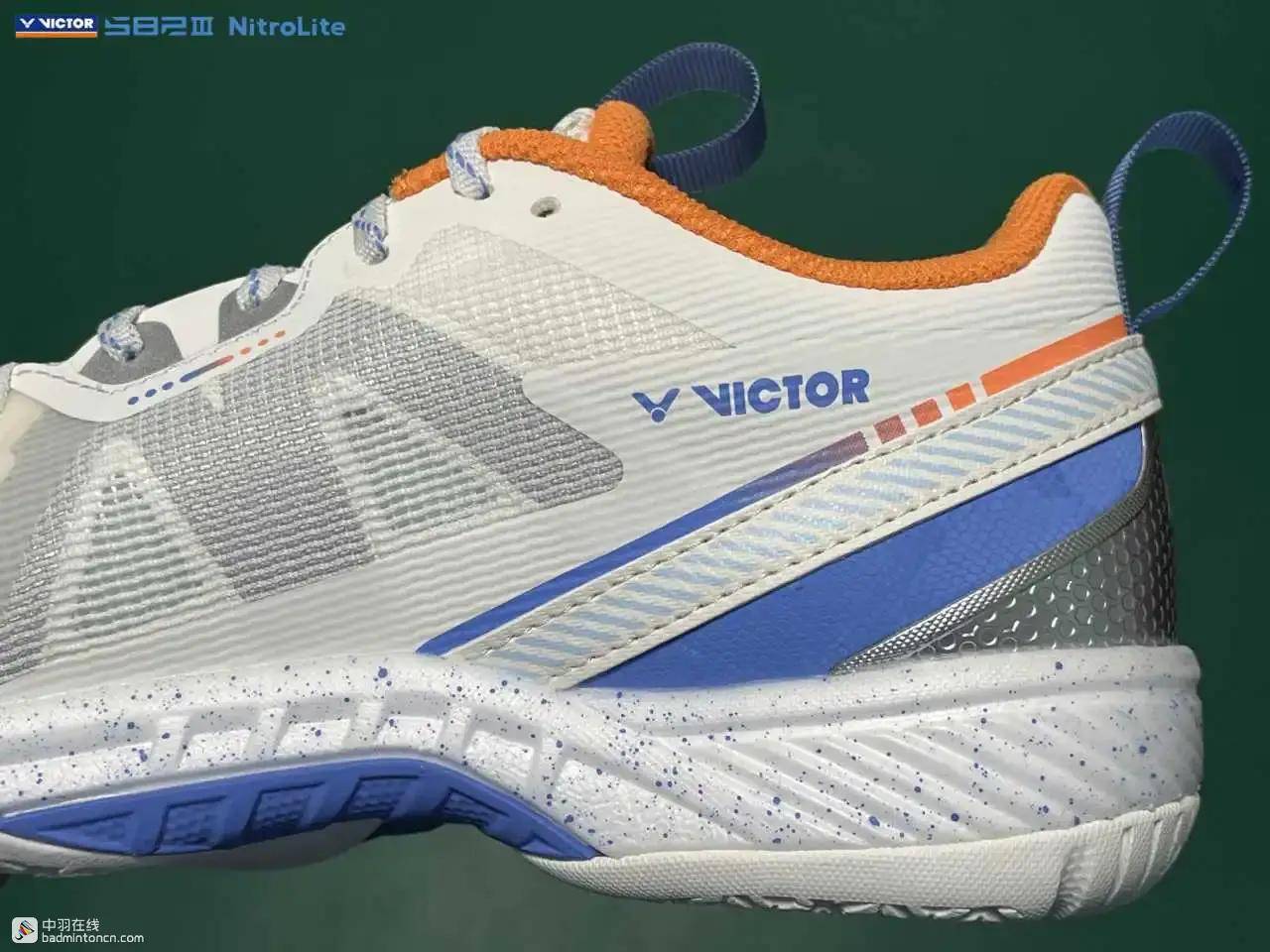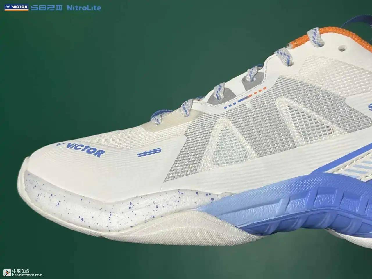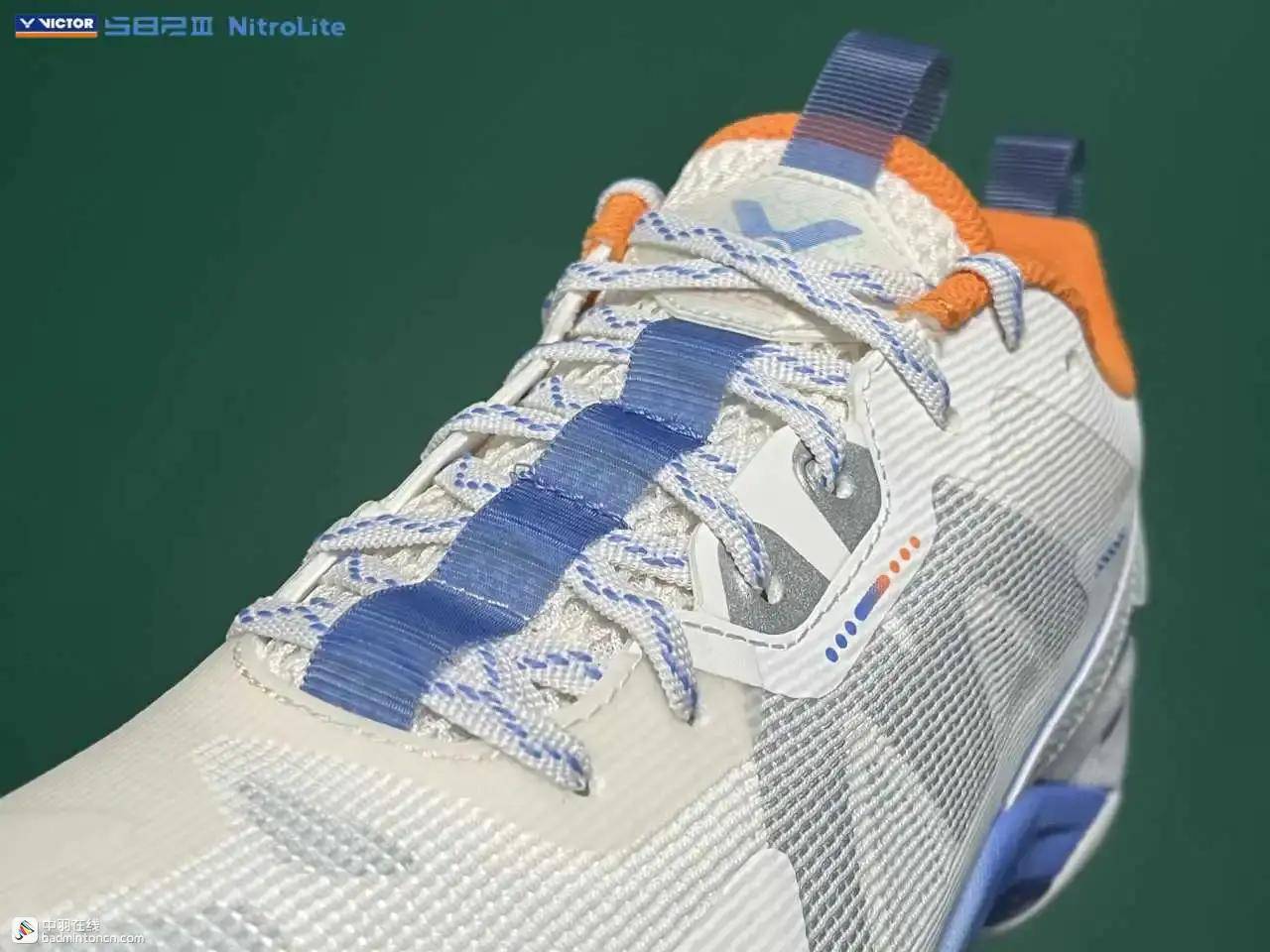 在鞋头外侧的白色TPU薄膜上,蓝色的威克多LOGO和品牌名称、以及蓝色斜条纹图案非常醒目,和S82 Ⅲ的设计相同。