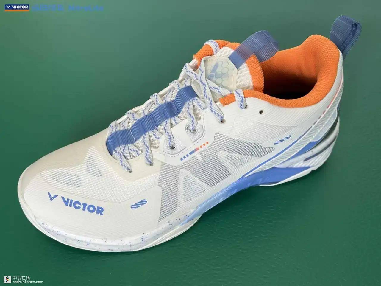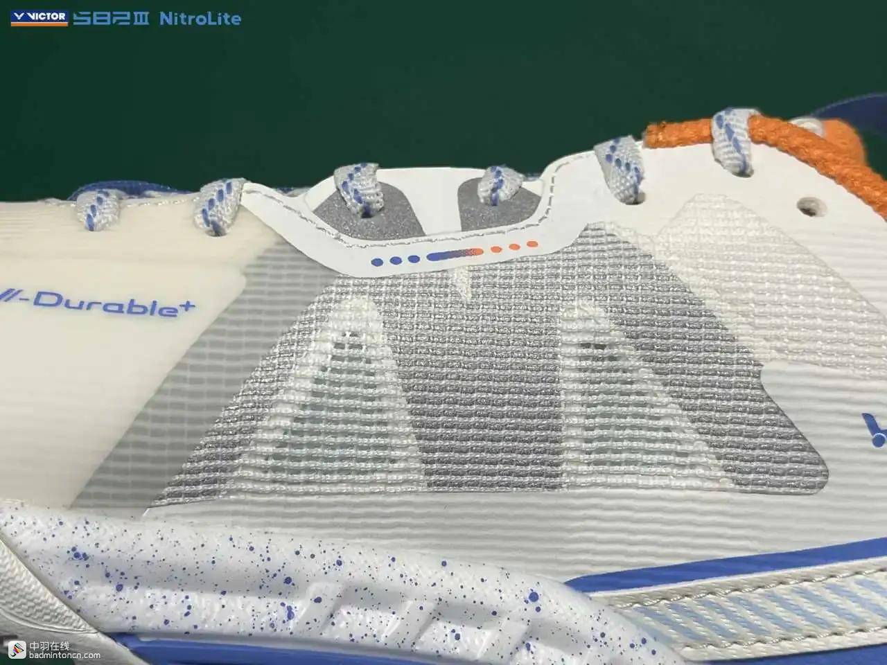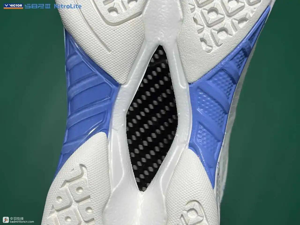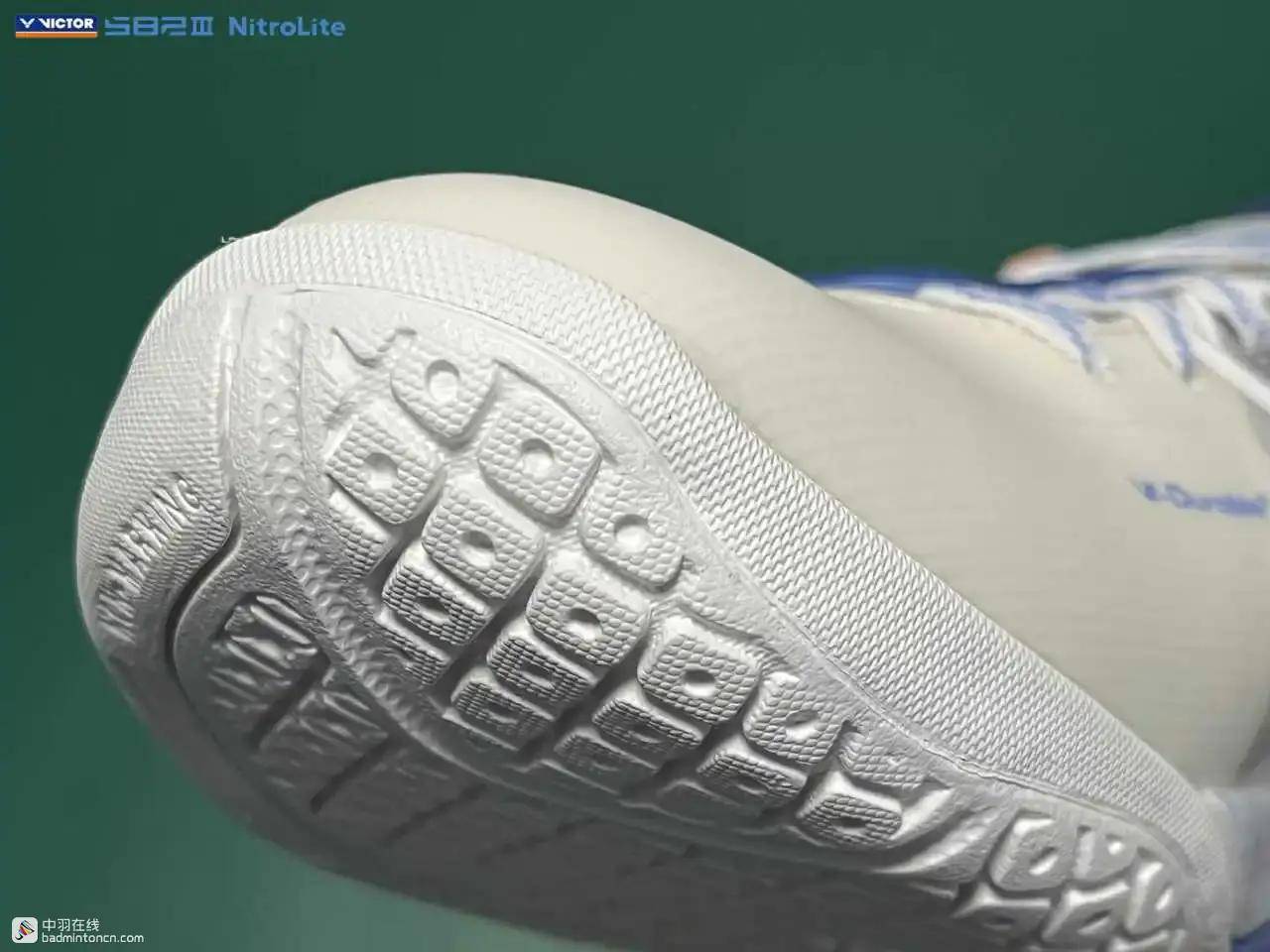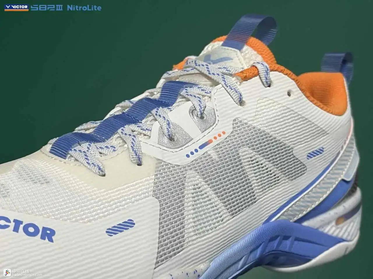 在鞋头外侧的白色TPU薄膜上,蓝色的威克多LOGO和品牌名称、以及蓝色斜条纹图案非常醒目,和S82 Ⅲ的设计相同。